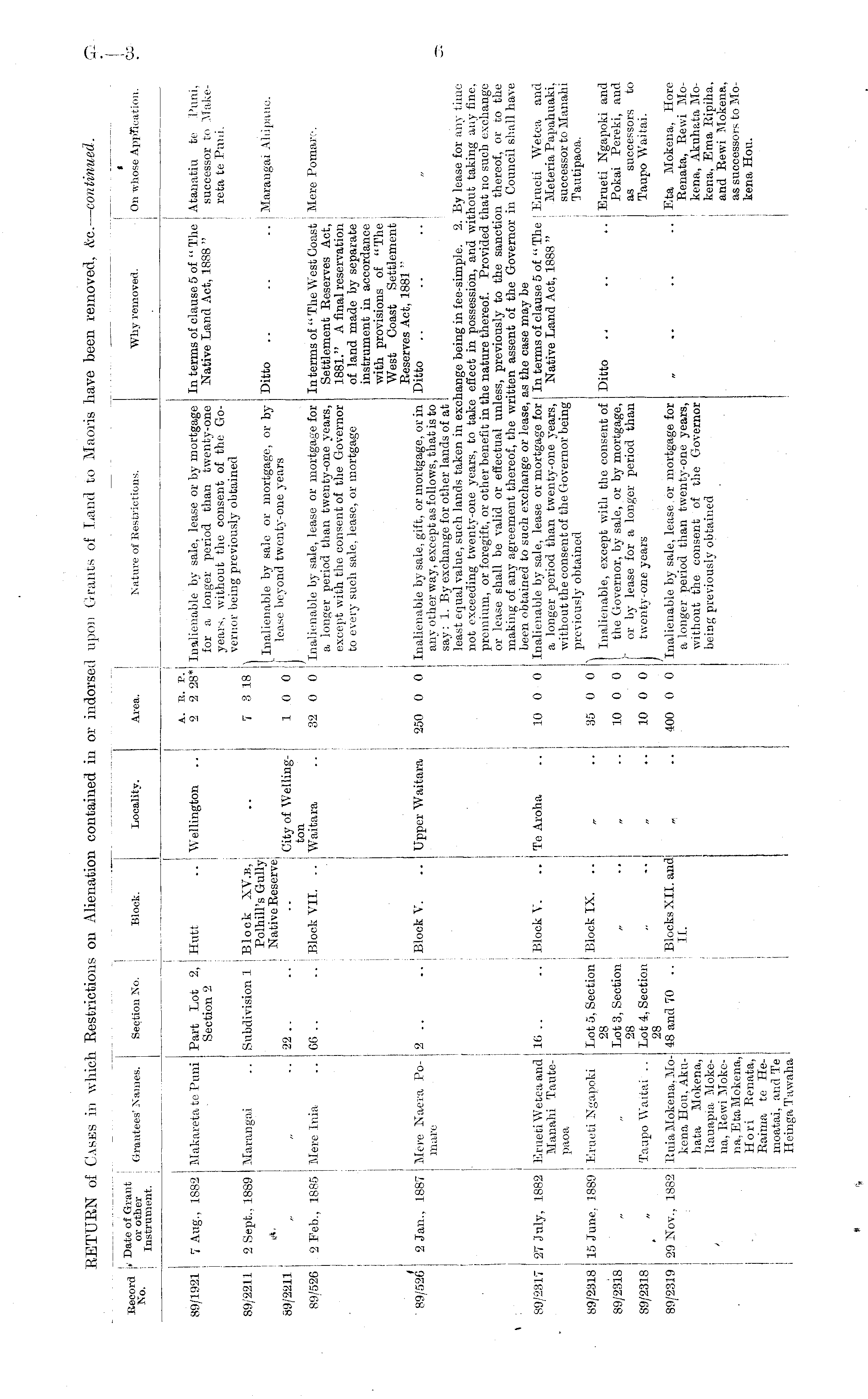 RETURN of Cases in which Restrictions on Alienation contained in or indorsed upon Grants of Land to Maoris have been removed, &c.— continued.