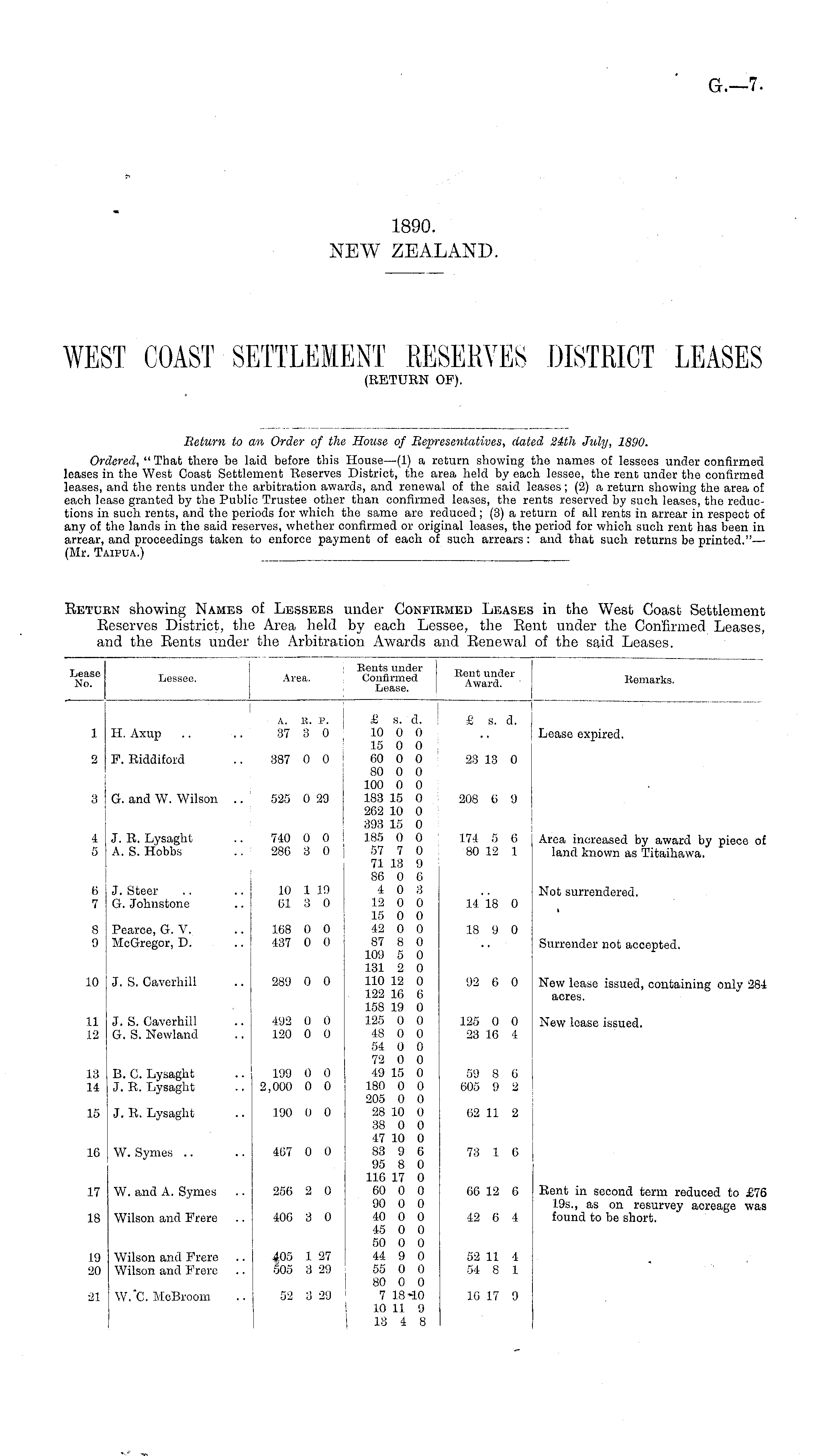 Beturn to an Order of the House of Representatives, dated 24th July, 1890. Ordered, " That there be laid before this House—(l) a return showing the names of lessees under confirmed leases in the West Coast Settlement Reserves District, the area held by each lessee, the rent under the confirmed leases, and the rents under the arbitration awards, and renewal of the said leases; (2) a return showing the area of each lease granted by the Public Trustee other than confirmed leases, the rents reserved by such leases, the reductions in such rents, and the periods for which the same are reduced ; (3) a return of all rents in arrear in respect of any of the lands in the said reserves, whether confirmed or original leases, the period for which such rent has been in arrear, and proceedings taken to enforce payment of each of such arrears: and that such returns be printed."— (Mr. Taipua.)