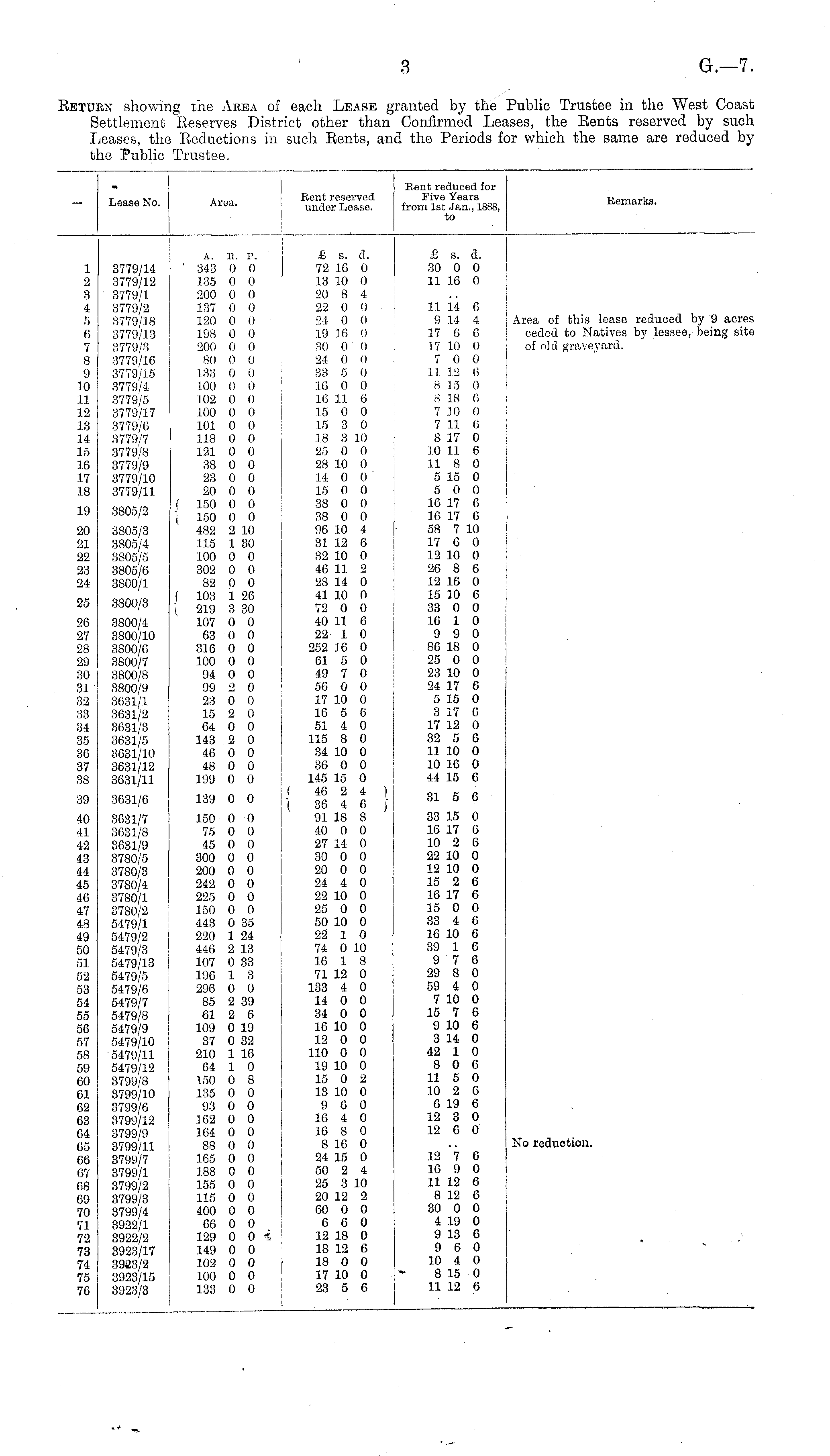 Return showing the Area of each Lease granted by the Public Trustee in the West Coast Settlement Reserves District other than Confirmed Leases, the Bents reserved by such Leases, the Reductions in such Rents, and the Periods for which the same are reduced by the Public Trustee.