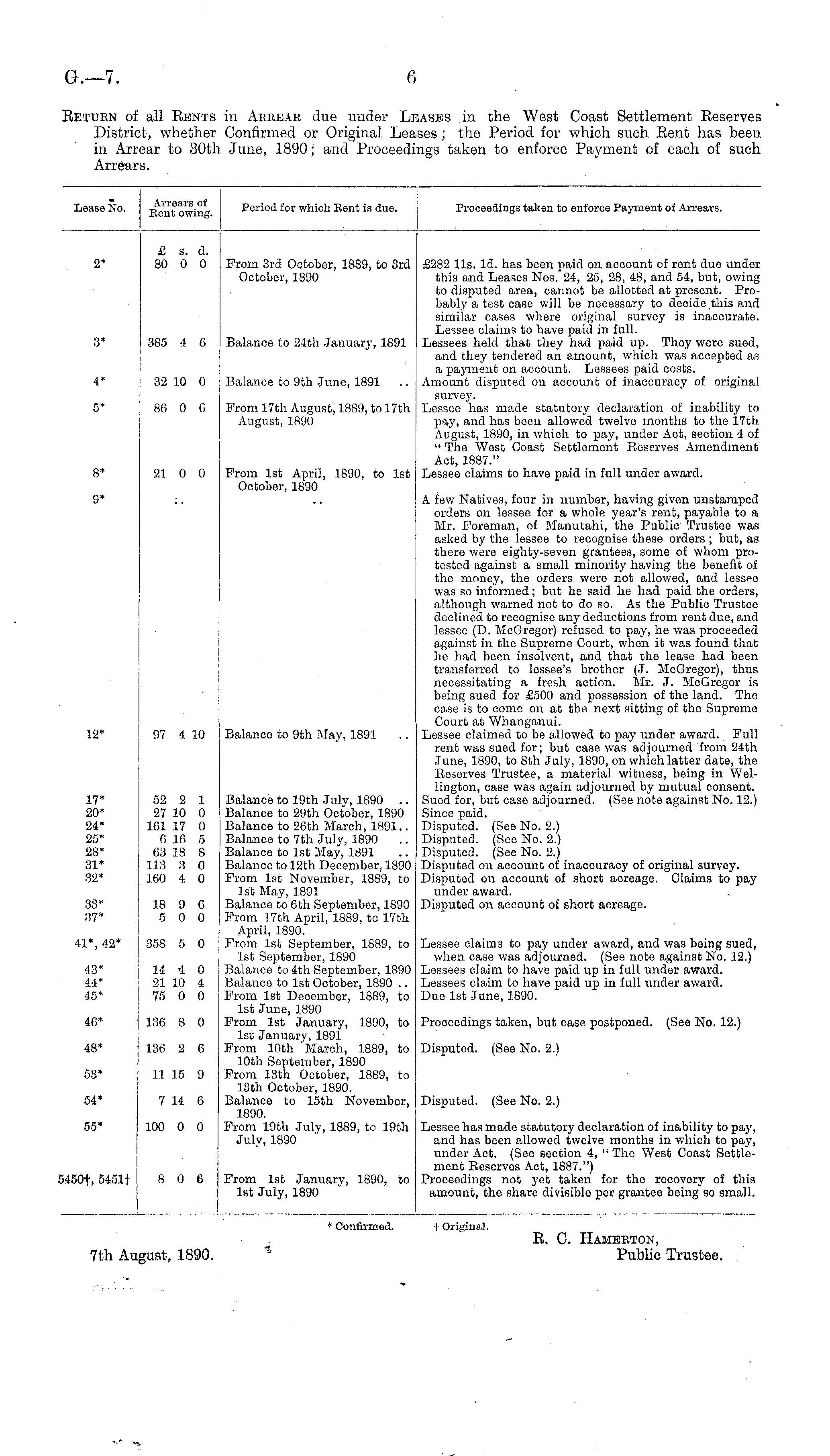 Return of all Rents in Arrear due under Leases in the West Coast Settlement Reserves District, whether Confirmed or Original Leases; the Period for which such Rent has been in Arrear to 30th June, 1890; and Proceedings taken to enforce Payment of each of such Arrears.