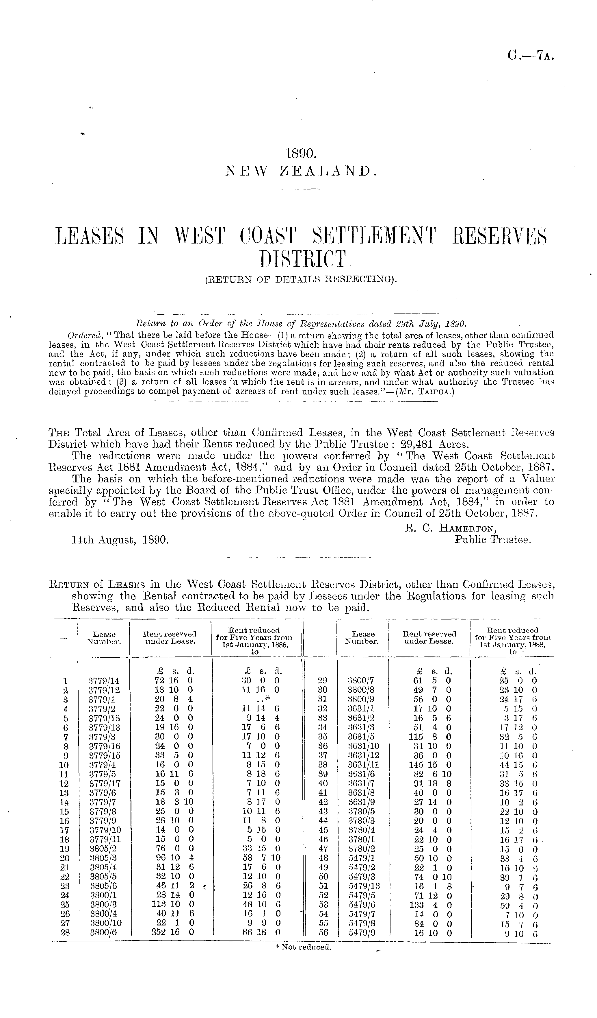 Return to an Order of the House of Representatives dated 29th July, 1890. Ordered, " That there be laid before the House—(l) a return showing the total area of leases, other than confirmed leases, in the West Coast Settlement Keserves District which have had thoir rents reduced by the Public Trustee, and the Act, if any, under which such reductions have been made; (2) a return of all such leases, showing the rental contracted to bo paid by lessees under the regulations for leasing such reserves, and also the reduced rental now to be paid, the basis on which such reductions were made, and how and by what Act or authority such valuation was obtained ; (3) a return of all leases in which the rent is in arrears, and under what authority the Trustee has delayed proceedings to compel payment of arrears of rent under such leases."—(Mr. Taipua.) The Total Area of Leases, other than Confirmed Leases, in the West Coast Settlement Eeserves District which have had their Eents reduced by the Public Trustee : 29,481 Acres. The reductions were made under the powers conferred by "The West Coast Settlement Eeserves Act 1881 Amendment Act, 1884," and by an Order in Council dated 25th October, 1887. The basis on which the before-mentioned reductions were made was the report of a Valuer specially appointed by the Board of the Public Trust Office, under the powers of management conferred by " The West Coast Settlement Eeserves Act 1881 Amendment Act, 1884," in order to enable it to carry out the provisions of the above-quoted Order in Council of 25th October, 1887. R. C. Hamerton, 14th August, 1890. Public Trustee.