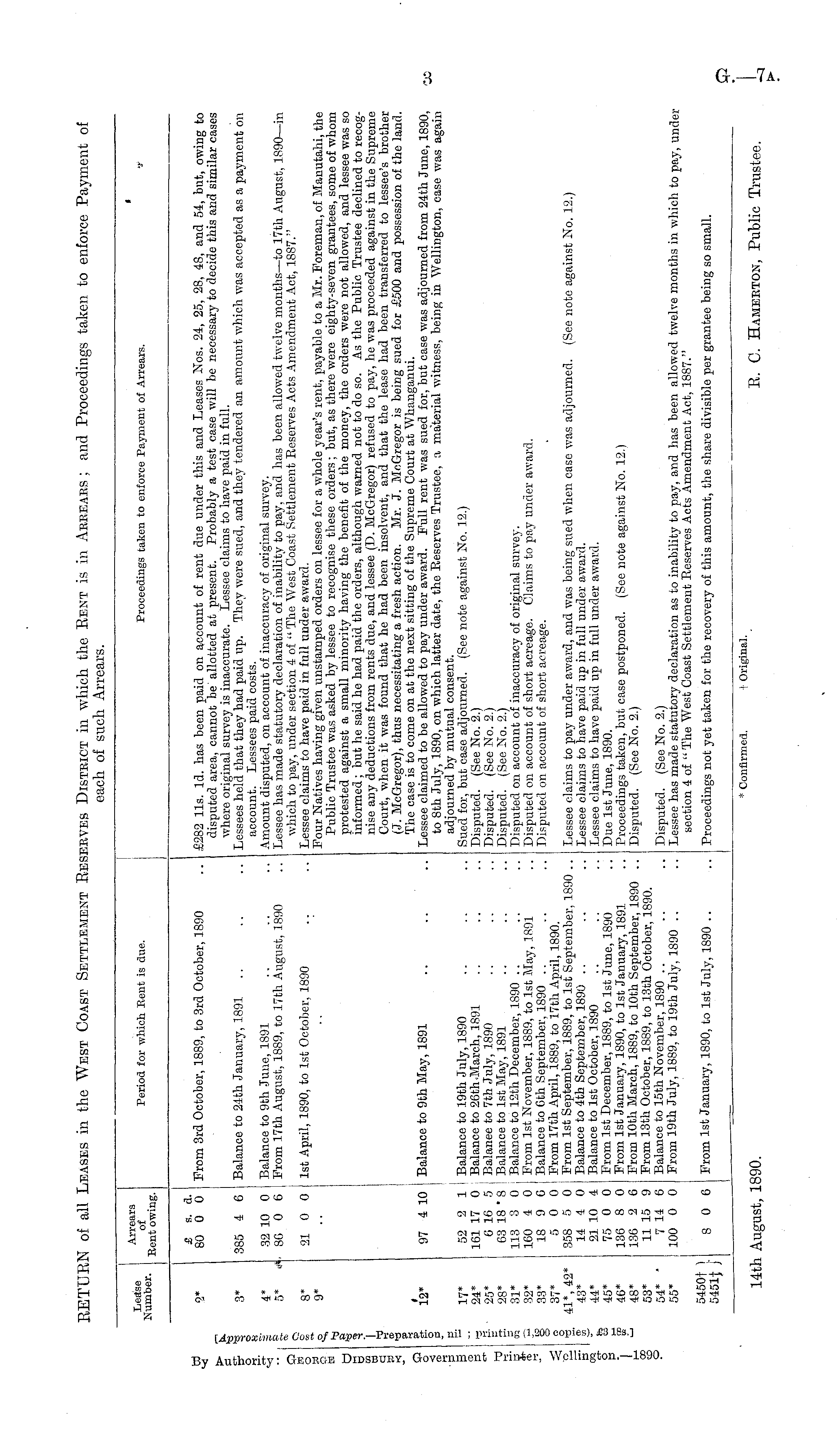 RETURN of all Leases in the West Coast Settlement Reserves District in which the Rent is in Arrears; and Proceedings taken to enforce Payment of each of such Arrears.