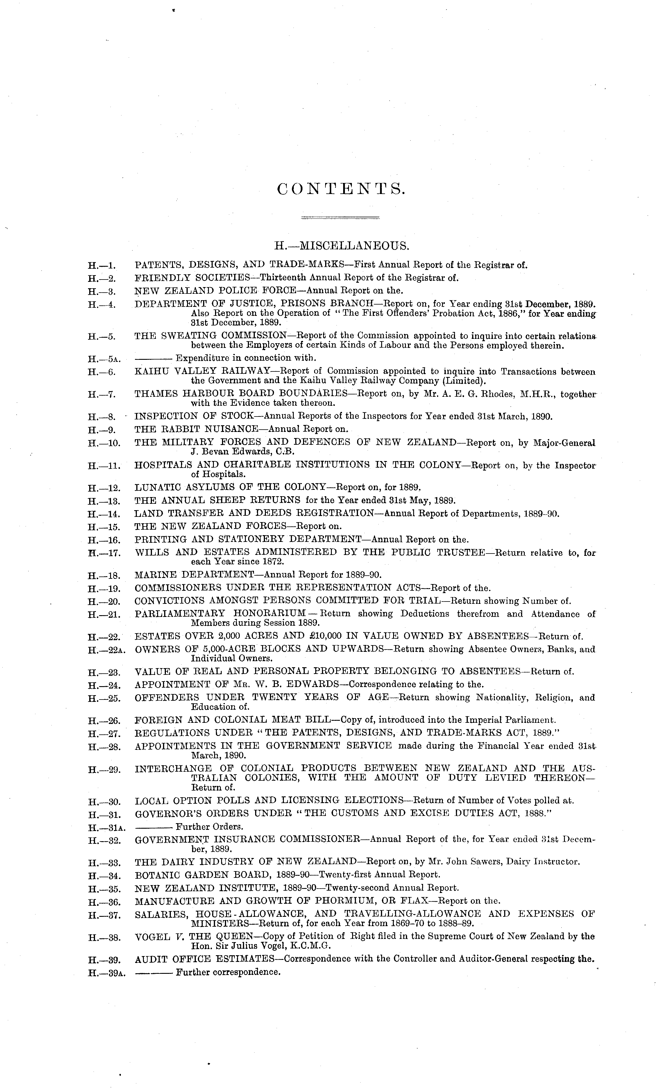 H.—MISCELLANEOUS. H.—l. PATENTS, DESIGNS, AND TRADE-MARKS—First Annual Report of the Registrar of. H.—2. FRIENDLY SOClETlES—Thirteenth Annual Report of the Registrar of. H.—3. NEW ZEALAND POLICE FORCE—Annual Report on the. H.— i. DEPARTMENT OF JUSTICE, PRISONS BRANCH—Report on, for Year ending 31st December, 1889. Also Report on the Operation of " The First Offenders' Probation Act, 1886," for Year ending 31st December, 1889. H.—s. THE SWEATING COMMISSION—Report of the Commission appointed to inquire into certain relations between the Employers of certain Kinds of Labour and the Persons employed therein. H. —sa. Expenditure in connection with. H.—6. KAIHU VALLEY RAILWAY —Report of Commission appointed to inquire into Transactions between the Government and the Kaihu Valley Railway Company (Limited). H._7. THAMES HARBOUR BOARD BOUNDARIES—Report on, by Mr. A. E. G. Rhodes, M.H.R., together with the Evidence taken thereon. H— 8. INSPECTION OF STOCK—Annual Reports of the Inspectors for Year ended 31st March, 1890. H.—9. THE RABBIT NUISANCE—AnnuaI Report on. H.—lo. THE MILITARY FORCES AND DEFENCES OF NEW ZEALAND—Report on, by Major-General J. Bevan Edwards, C.B. H.—ll. HOSPITALS AND CHARITABLE INSTITUTIONS IN THE COLONY—Report on, by the Inspector of Hospitals. H.—l2. LUNATIC ASYLUMS OF THE COLONY—Report on, for 1889. H.—l3. THE ANNUAL SHEEP RETURNS for the Year ended 31st May, 1889. H.—l4. LAND TRANSFER AND DEEDS REGISTRATION—AnnuaI Report of Departments, 1889-90. H.—ls. THE NEW ZEALAND FORCES—Report on. H.—l6. PRINTING AND STATIONERY DEPARTMENT—AnnuaI Report on the. H.—l7. WILLS AND ESTATES ADMINISTERED BY THE PUBLIC TRUSTEE—Return relative to, for each Year since 1872. H—lB. MARINE DEPARTMENT—AnnuaI Report for 1889-90. H.—l9. COMMISSIONERS UNDER THE REPRESENTATION ACTS—Report of the. H.—2o. CONVICTIONS AMONGST PERSONS COMMITTED FOR TRlAL—Return showing Number of. H.—2l. PARLIAMENTARY HONORARIUM — Return showing Deductions therefrom and Attendance of Members during Session 1889. H.—22. ESTATES OVER 2,000 ACRES AND £10,000 IN VALUE OWNED BY ABSENTEES-Return of. H.—22a. OWNERS OF 5,000-ACRE BLOCKS AND UPWARDS—Return showing Absentee Owners, Banks, and Individual Owners. H.—23. VALUE OF REAL AND PERSONAL PROPERTY BELONGING TO ABSENTEES—Return of. H— 24. APPOINTMENT OF Mb. W. B. EDWARDS—Correspondence relating to the. H.—25. OFFENDERS UNDER TWENTY YEARS OF AGE—Return showing Nationality, Religion, and Education of. H— 26. FOREIGN AND COLONIAL MEAT BILL—Copy of, introduced into the Imperial Parliament. H—27. REGULATIONS UNDER " THE PATENTS, DESIGNS, AND TRADE-MARKS ACT, 1889." H —28. APPOINTMENTS IN THE GOVERNMENT SERVICE made during the Financial Year ended 31st March, 1890. H—29 INTERCHANGE OF COLONIAL PRODUCTS BETWEEN NEW ZEALAND AND THE AUSTRALIAN COLONIES, WITH THE AMOUNT OF DUTY LEVIED THEREON— Return of. H.—3o. LOCAL OPTION POLLS AND LICENSING ELECTIONS—Return of Number of Votes polled at. H.— 31. GOVERNOR'S ORDERS UNDER " THE CUSTOMS AND EXCISE DUTIES ACT, 1888." H. —31a. ■ Further Orders. H —32 GOVERNMENT INSURANCE COMMISSIONER—AnnuaI Report of the, for Year ended 31st December, 1889. H.—33. THE DAIRY INDUSTRY OF NEW ZEALAND—Report on, by Mr. John Sawers, Dairy Instructor. H.—34. BOTANIC GARDEN BOARD, 1889-90—Twenty-first Annual Report. H.—35. NEW ZEALAND INSTITUTE, 1889-90—Twenty-second Annual Report. H.—36. MANUFACTURE AND GROWTH OF PHORMIUM, OR FLAX—Report on the. H—37. SALARIES, HOUSE-ALLOWANCE, AND TRAVELLING-ALLOWANCE AND EXPENSES OF MINISTERS—Return of, for each Year from 1869-70 to 1888-89. H —38 VOGEL V, THE QUEEN—Copy of Petition of Right filed in the Supreme Court of New Zealand by the Hon. Sir Julius Vogel, K.C.M.G. H.—39. AUDIT OFFICE ESTlMATES—Correspondence with the Controller and Auditor-General respecting the. H. —39a. Further correspondence.