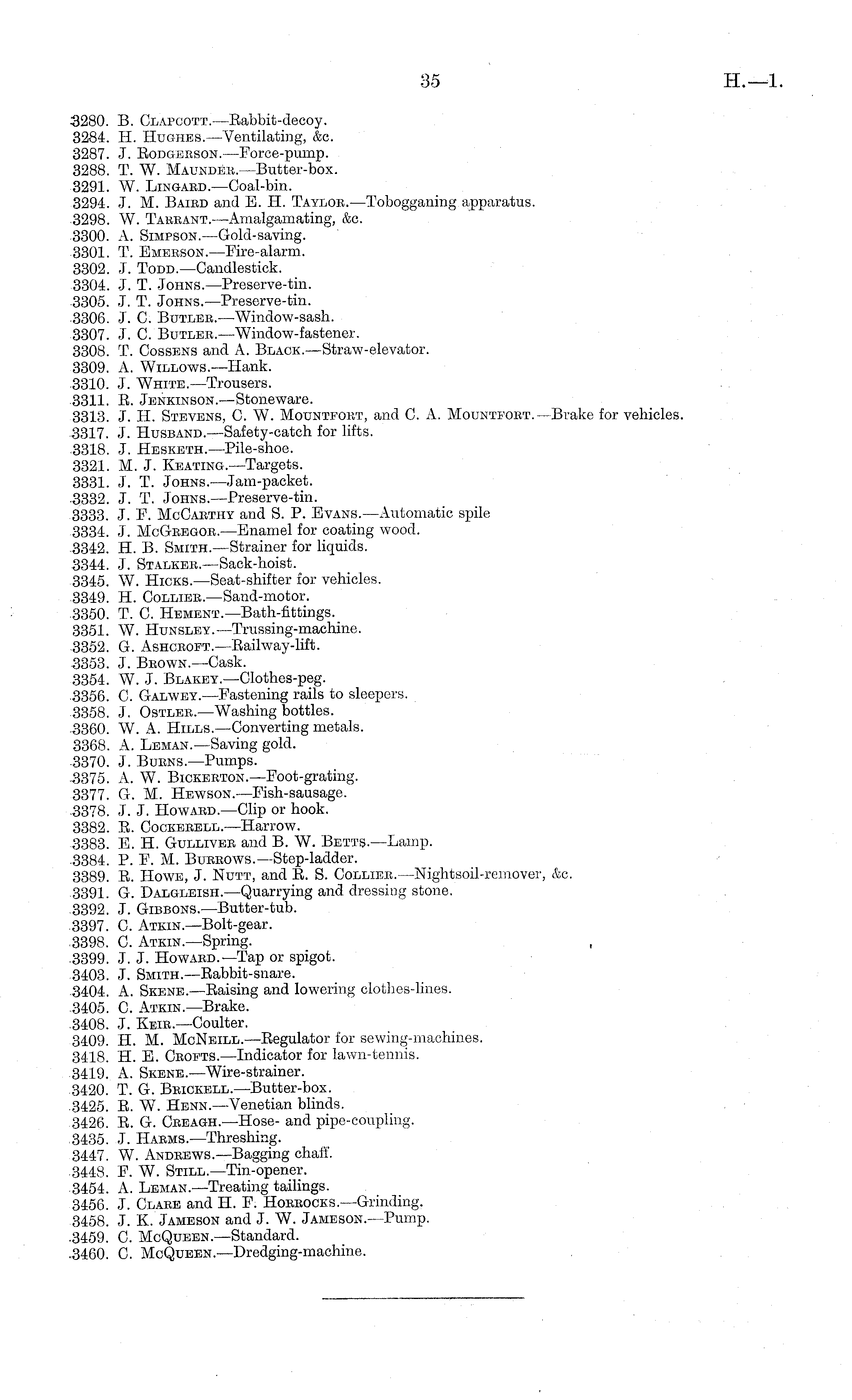 3280. B. Clapcott.—Babbit-decoy. 3284. H. Hughes.—Ventilating, &c. 3287. J. Eodgerson.—Force-pump. 3288. T. W. Maunder.—Butter-box. 3291. W. Lingard.—Coal-bin. 3294. J. M. Baird and E. H. Taylor.—Tobogganing apparatus. 3298. W. Tarrant. —Amalgamating, &c. 3300. A. Simpson.—Gold-saving. 3301. T. Emerson. —Fire-alarm. 3302. J. Todd.—Candlestick. 3304. J. T. Johns.—Preserve-tin. 3305. J. T. Johns. —Preserve-tin. 3306. J. C. Butler. —Window-sash. 3307. J. C. Butler. —Window-fastener. 3308. T. Cossens and A. Black. —Straw-elevator. 3309. A. Willows.—Hank. 3310. J. White. —Trousers. 3311. E. Jenkinson. —Stoneware. 3313. J. H. Stevens, C. W. Mountfort, and C. A. Mountfort.—Brake for vehicles. 3317. J. Husband. —Safety-catch for lifts. 3318. J. Hesketh. —Bile-shoe. 3321. M. J. Keating.—Targets. 3331. J. T. Johns. —Jam-packet. 3332. J. T. Johns. —Preserve-tin. 3333. J. F. McCarthy and S. P. Evans. —Automatic spile 3334. J. McGregor.—Enamel for coating wood. 3342. H. B. Smith. —Strainer for liquids. 3344. J. Stalker. —Sack-hoist. 3345. W. Hicks. —Seat-shifter for vehicles. 3349. H. Collier. —Sand-motor. 3350. T. C. Hement.—Bath-fittings. _ 3351. W. Hunsley.—Trussing-machine. 3352. G. Ashcroft.—Eailway-lift. 3353. J. Brown. —Cask. 3354. W. J. Blakey— Clothes-peg. ■3356. C. Galwey.—Fastening rails to sleepers. 3358. J. Ostler. —Washing bottles. 3360. W. A. Hills.—Converting metals. 3368. A. Leman. —Saving gold. 3370. J. Burns. —Pumps. 3375. A. W. Bickerton. —Foot-grating. 3377. G. M. Hewson. —Fish-sausage. 3378. J. J. Howard. —Clip or hook. 3382. B. Cockerell. —Harrow. 3383. E. H. Gulliver and B. W. Betts. —Lamp. .3384. P. F. M. Burrows.—Step-ladder. 3389. B. Howe, J. Nutt, and B. S. Collier. —Nightsoil-remover, &c. 3391. G. Dalgleish.—Quarrying and dressing stone. 3392. J. Gibbons. —Butter-tub. 3397. C. Atkin.—Bolt-gear. 3398. C. Atkin.—Spring. 3399. J. J. Howard.—Tap or spigot. 3403. J. Smith. —Babbit-snare. 3404. A. Skene. —Baising and lowering clothes-lines. 3405. C. Atkin.—Brake. 3408. J. Keie.—Coulter. 3409. H. M. McNeill. —Begulator for sewing-machines. 3418. H. E. Crofts. —Indicator for lawn-tennis. 3419. A. Skene. —Wire-strainer. 3420. T. G. Brickell. —Butter-box. 3425. E. W. Henn. —Venetian blinds. 3426. E. G. Creagh.—Hose- and pipe-coupling. 3435. J. Harms. —Threshing. 3447. W. Andrews. —Bagging chaff. 3448. F. W. Still. —Tin-opener. 3454. A. Leman. —Treating tailings. 3456. J. Clare and H. F. Horrocks. —Grinding. 3458. J. K. Jameson and J. W. Jameson. —Pump. •3459. C. McQueen.—Standard. .3460. C. McQueen. —Dredging-machine.