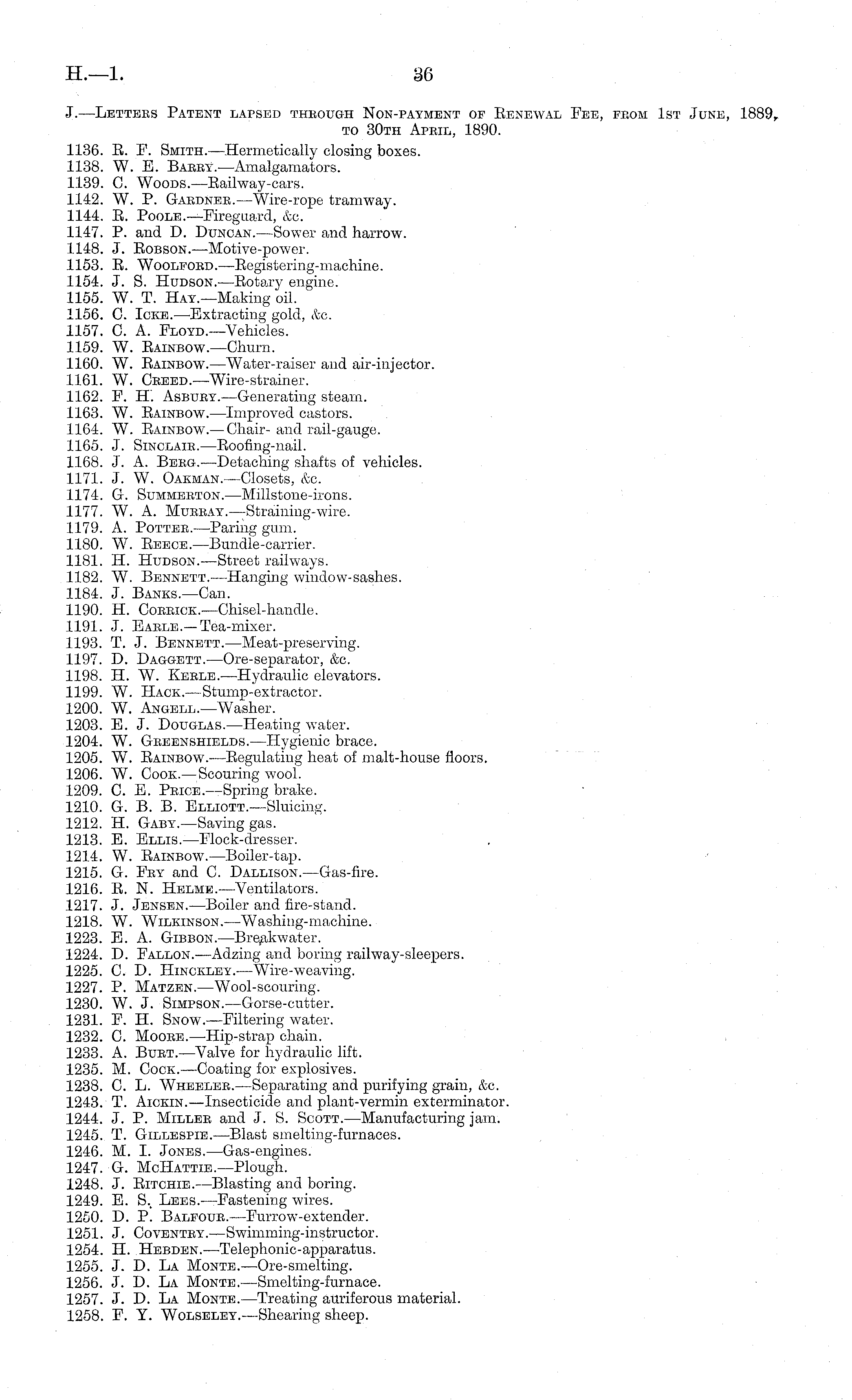 J.—Lettees Patent lapsed thbough Non-payment of Eenewal Fee, feom Ist June, 1889, to 30th Apbil, 1890. 1136. E. P. Smith.—Hermetically closing boxes. 1138. W. E. Babey.—Amalgamators. 1139. C. Woods.—Eailway-cars. 1142. W. P. Gaednee. —Wire-rope tramway. 1144. E. Poole.—-Fireguard, &c. 1147. P. and D. Duncan.—Sower and harrow. 1148. J. Eobson. —Motive-power. 1153. E. Woolfoed.—Begistering-machine. 1154. J. S. Hudson.—Botary engine. 1155. W. T. Hay-.—Making oil. 1156. C. Icke.—Extracting gold, &c. 1157. C. A. Floyd.—Vehicles. 1159. W. Bainbow. —Churn. 1160. W. Bainbow. —Water-raiser and air-injector. 1161. W. Greed.—Wire-strainer. 1162. F. H. Asbuey.—Generating steam. 1163. W. Bainbow.—lmproved castors. 1164. W. Bainbow. — Chair- and rail-gauge. 1165. J. Sinclair. —Boofing-nail. 1168. J. A. Beeg.—Detaching shafts of vehicles. 1171. J. W. Oakman.—Closets, &c. 1174. G. Summeeton. —Millstone-irons. 1177. W. A. Mubeay.—-Straining-wire. 1179. A. Potteb. —Paring gum. 1180. W. Beece. —Bundle-carrier. 1181. H. Hudson.—Street railways. 1182. W. Bennett.—Hanging window-sashes. 1184. J. Banks.—Can. 1190. H. Cobeick.—Chisel-handle. 1191. J. Eaelb.—Tea-mixer. 1193. T. J. Bennett. —Meat-preserving. 1197. D. Daggett.—Ore-separator, &c. 1198. H. W. Keele.—Hydraulic elevators. 1199. W. Hack.—Stump-extractor. 1200. W. Angell.—Washer. 1203. E. J. Douglas.—Heating water. 1204. W. Geeenshields. —Hygienic brace. 1205. W. Bainbow. —Begulating heat of malt-house floors. 1206. W. Cook. —Scouring wool. 1209. C. E. Peice.—-Spring brake. 1210. G. B. B. Elliott.—Sluicing. 1212. H. Gaby.—Saving gas. 1213. E. Ellis. —Flock-dresser. 1214. W. Bainbow.—Boiler-tap. 1215. G. Fby and C. Dallison. —Gas-fire. 1216. B. N. Helme.—Ventilators. 1217. J. Jensen. —Boiler and fire-stand. 1218. W. Wilkinson. —Washing-machine. 1223. E. A. Gibbon. —Breakwater. 1224. D. Fallon.—Adzing and boring railway-sleepers. 1225. C. D. Hinckley.—Wire-w ; eaving. 1227. P. Matzen. —Wool-scouring. 1230. W. J. Simpson.—Gorse-cutter. 1231. F. H. Snow.—Filtering water. 1232. C. Moobe. —Hip-strap chain. 1233. A. Buet. —Valve for hydraulic lift. 1235. M. Cock. —Coating for explosives. 1238. C. L. Wheelee. —Separating and purifying grain, &c. 1243. T. Aickin.—lnsecticide and plant-vermin exterminator. 1244. J. P. Milleb and J. S. Scott. —Manufacturing jam. 1245. T. Gillespie.—Blast smelting-furnaces. 1246. M. I. Jones.—Gas-engines. 1247. G. Mcllattie.—Plough. 1248. J. Bitchie. —Blasting and boring. 1249. E. S.. Lees. —Fastening wires. 1250. D. P. Balfour. —Furrow-extender. 1251. J. Coventby.—Swimming-instructor. 1254. H. Hebden.—Telephonic-apparatus. 1255. J. D. La Monte. —Ore-smelting. 1256. J. D. La Monte.—Smelting-furnace. 1257. J. D. La Monte. —Treating auriferous material. 1258. F. Y. Wolseley.—Shearing sheep.