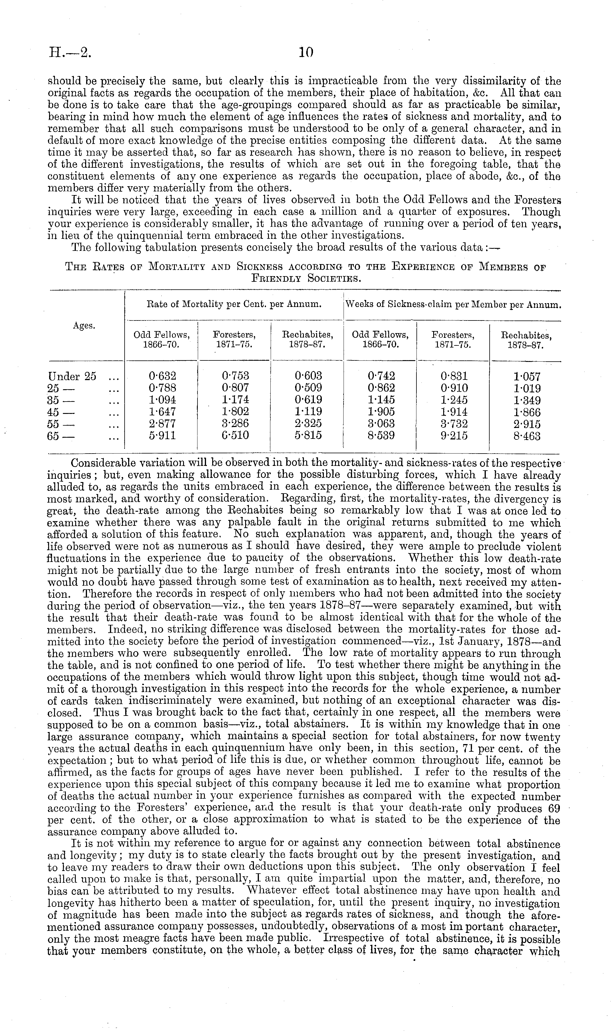 Considerable variation will be observed in both the mortality- and sickness-rates of the respective inquiries ; but, even making allowance for the possible disturbing forces, which I have already alluded to, as regards the units embraced in each experience, the difference between the results is most marked, and worthy of consideration. Eegarding, first, the mortality-rates, the divergency is great, the death-rate among the Eechabites being so remarkably low that I was at once led to examine whether there was any palpable fault in the original returns submitted to me which afforded a solution of this feature. No such explanation was apparent, and, though the years of life observed were not as numerous as I should have desired, they were ample to preclude violent fluctuations in the experience due to paucity of the observations. Whether this low death-rate might not be partially due to the large number of fresh entrants into the society, most of whom would no doubt have passed through some test of examination as to health, next received my attention. Therefore the records in respect of only members who had not been admitted into the society during the period of observation—viz., the ten years 1878-87 —were separately examined, but with the result that their death-rate was found to be almost identical with that for the whole of the members. Indeed, no striking difference was disclosed between the mortality-rates for those admitted into the society before the period of investigation commenced—viz., Ist January, 1878 —and the members who were subsequently enrolled. The low rate of mortality appears to run through the table, and is not confined to one period of life. To test whether there might be anything in the occupations of the members which would throw light upon this subject, though time would not admit of a thorough investigation in this respect into the records for the whole experience, a number of cards taken indiscriminately were examined, but nothing of an exceptional character was disclosed. Thus I was brought back to the fact that, certainly in one respect, all the members were supposed to be on a common basis—viz., total abstainers. It is within my knowledge that in one large assurance company, which maintains a special section for total abstainers, for now twenty years the actual deaths in each quinquennium have only been, in this section, 71 per cent, of the expectation ; but to what period of life this is due, or whether common throughout life, cannot be affirmed, as the facts for groups of ages have never been published. I refer to the results of the experience upon this special subject of this company because it led me to examine what proportion of deaths the actual number in your experience furnishes as compared with the expected number according to the Foresters' experience, and the result is that your death-rate only produces 69 per cent, of the other, or a close approximation to what is stated to be the experience of the assurance company above alluded to. It is not within my reference to argue for or against any connection between total abstinence and longevity; my duty is to state clearly the facts brought out by the present investigation, and to leave my readers to draw their own deductions upon this subject. The only observation I feel called upon to make is that, personally, I am quite impartial upon the matter, and, therefore, no bias can be attributed to my results. Whatever effect total abstinence may have upon health and longevity has hitherto been a matter of speculation, for, until the present inquiry, no investigation of magnitude has been made into the subject as regards rates of sickness, and though the aforementioned assurance company possesses, undoubtedly, observations of a most important character, only the most meagre facts have been made public. Irrespective of total abstinence, it is possible that your members constitute, on the whole, a better class of lives, for the same character which