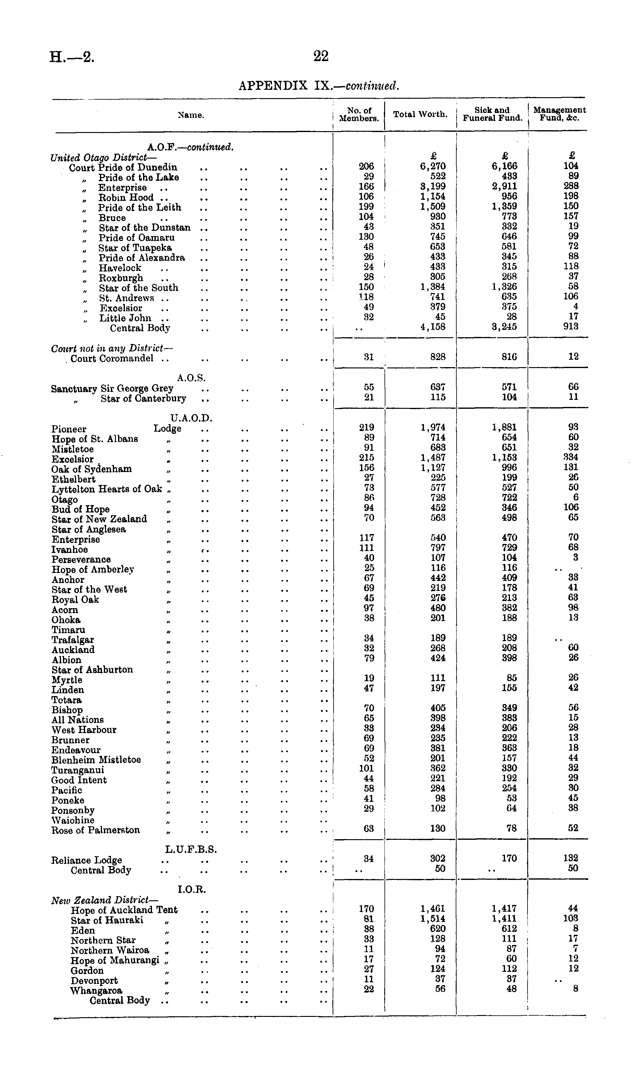 Name. No. of Members. Total Worth. Sick and Funeral Fund. Management Fund, Sec. A.O.F.— continued. United Otago District — Court Pride of Dunedin „ Pride of the Lake „ Enterprise „ Robin Hood .. „ Pride of the Leith Bruce „ Star of the Dunstan .. „ Pride of Oamaru „ Star of Tuapeka „ Pride of Alexandra Havelock „ Roxburgh „ Star of the South „ St. Andrews Excelsior „ Little John Central Body .. i 206 I 29 166 | 106 199 104 43 130 48 26 24 28 150 118 49 32 £ 6,270 522 3,199 1,154 1,509 930 351 745 653 433 433 305 1,384 741 379 45 4,168 £ 6,166 433 2,911 956 1,359 773 332 040 581 345 315 208 1.326 635 375 28 3,245 £ 104 89 288 198 150 157 19 99 72 88 118 37 58 100 4 17 913 Court not in any District — Court Coromandel 31 828 828 810 12 A.O.S. Sanctuary Sir George Grey Star of Canterbury 55 21 00 21 637 115 637 115 571 104 66 U U.A.O.D. Pioneer Lodge Hope of St. Albans Mistletoe „ Excelsior ... Oak of Sydenham Ethelbert Lyttelton Hearts of Oak „ Otago „ Bud of Hope Star of New Zealand Star of Anglesea ,, Enterprise Ivanhoe „ <■• Perseverance Hope of Amberley „ Anchor „ Star of the West Royal Oak „ Acorn Ohoka „ Timaru Trafalgar „ Auckland „ Albion „ Star of Ashburton Myrtle „ Linden Totara „ Bishop All Nations » West Harbour Brunner Endeavour Blenheim Mistletoe „ Turanganui „ Good Intent Pacific Poneke Ponsonby Waiohine „ Rose of Palmerston „ 219 89 91 215 156 27 73 86 94 70 117 111 40 25 67 69 45 97 38 34 32 79 19 47 70 65 33 69 69 52 101 44 58 41 29 63 1,974 714 683 1,487 1,127 225 577 728 452 563 540 797 107 116 442 219 276 480 201 189 268 424 111 197 405 398 234 235 381 201 362 221 284 98 102 130 1,974 714 683 1,487 1,127 225 577 728 452 563 540 797 107 116 442 219 276 480 201 1,881 654 651 1,153 996 199 527 722 346 498 470 729 104 116 409 178 213 382 188 93 60 32 334 131 26 50 6 106 65 70 68 3 33 41 63 98 13 189 268 424 189 208 398 60 26 111 197 85 155 26 42 405 398 234 235 381 201 362 221 284 98 102 349 383 206 222 363 157 330 192 254 53 64 56 15 28 13 18 44 32 29 30 45 38 130 78 52 L.U.F.B.S. Reliance Lodge Central Body '.'. 34 302 50 302 50 170 132 50 I.O.R. New Zealand District — Hope of Auckland Tent Star of Hauraki Eden Northern Star Northern Wairoa Hope of Mahurangi „ Gordon „ Devonport Whangaroa Central Body .. 170 81 38 33 11 17 27 11 22 1,461 1,514 620 128 94 72 124 37 56 1,401 1,514 620 128 94 72 124 37 56 1,417 1,411 612 111 87 60 112 37 48 44 103 8 17 7 12 12 8