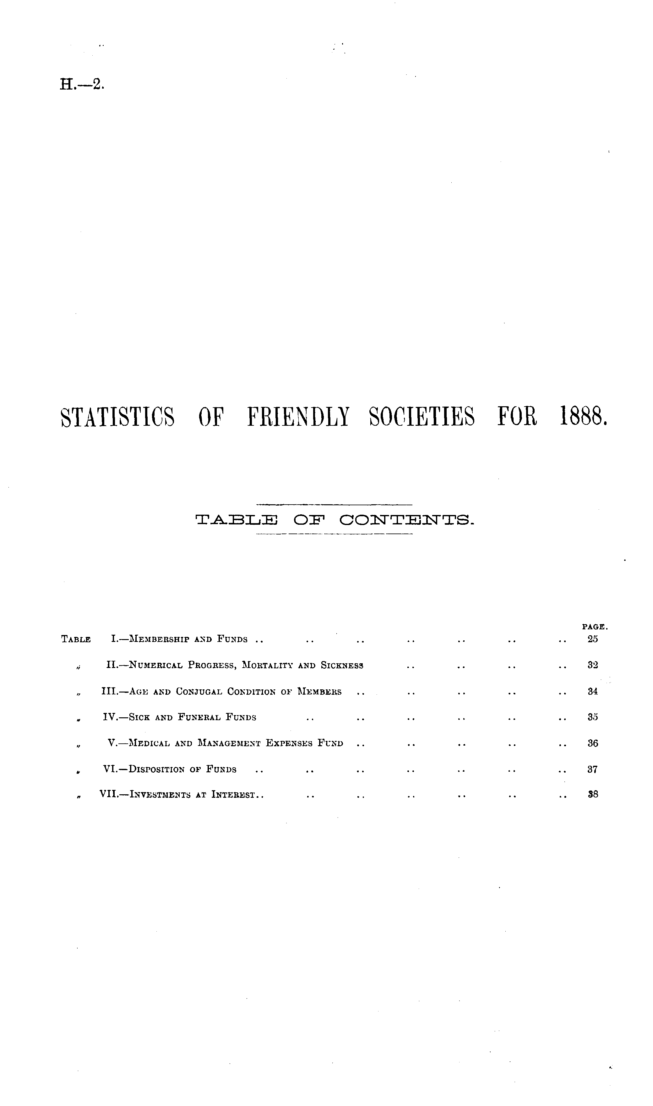 PAGE. Table I. —Membership and Funds .. .. .. .. .. .. 25 ,; II. —Numerical Progress, Mortality and Sickness .. .. .. 32 „ lll.—Age and Conjugal Condition of Members .. .. .. .. 34 IV. —Sick and Funeral Funds .. .. .. .. .. 35 V.—Medical and Management Expenses Fund .. .. .. .. 36 , VI. —Disposition of Funds .. .. .. .. .. .. 37 Vll.—lnvestments at Interest. . .. .. .. .. .. ..38