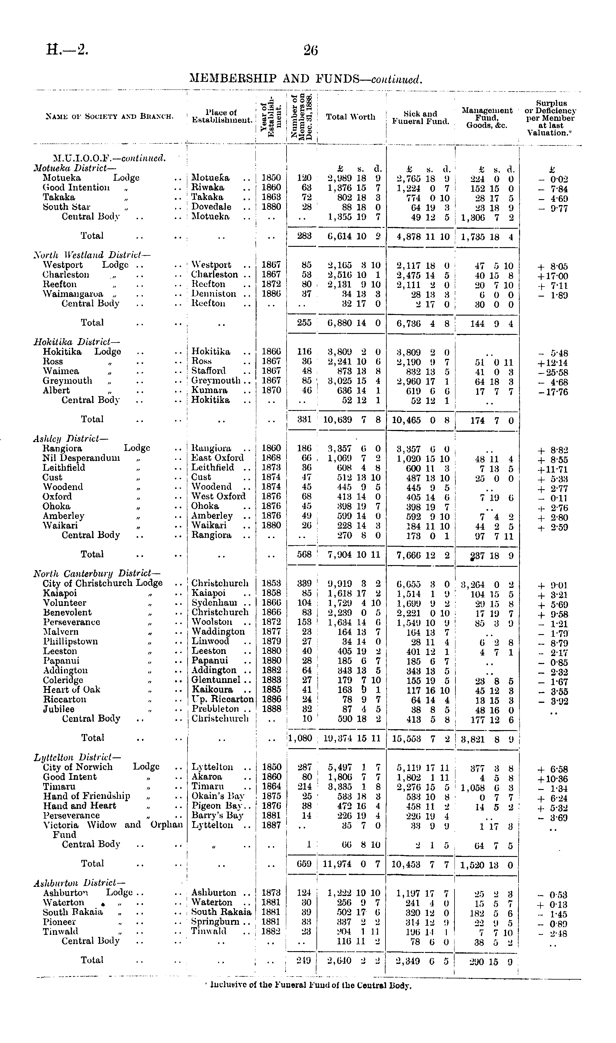 Nam,: at s,„ iktv am, Bbasch. B^ftShm^t. ci - _i 5" g r"- cfi *m S __ 0 02 11 s Total Worth 32 - __? _ Sick and Mttl IS' ent Funeral Fund. Q £<_%. Surplus or Deficiency per Member at Ins! Valuation. _| I M.UXO.O.F.— continued. Motueka District — Motueka Lodge .. Motueka Good Intention „ .. Riwaka Takaka „ •. Takaka South Star „ .. Dovedale Central Body .. .. Motueka 1S0O 1860 1863 1880 £ s. d. 120 2,989 18 9 63 1,376 15 7 72 802 18 3 28 88 18 0 1,355 19 7 - s. d. t s. d. 2,705 18 0 224 0 0 1,224 0 7 152 15 0 774 0 10 28 17 5 04 19 3 23 18 9 49 12 5 1,300 7 2 4,878 11 10 1,735 18 4 £ - 002 - 7-84 - 4-69 - 9-77 Total I 283 0,614 10 2 1,878 11 10 1,735 18 4 I North Westland District — Westport Lodge .. .. Westport Charleston „ .. .. Charleston .. Reefton „ .. ■. Kecfton Waimaugaroa „ .. .. Denniston .. Central Body .. .. Reefton 1867 1807 1872 1880 85 53 80 37 2,105 3 10 2,510 10 1 2.131 9 10 04 13 3 32 17 0 2.117 18 0 47 5 10 2,475 14 5 40 15 8 2,111 2 0 20 7 10 28 10 3 6 0 0 2 17 0 30 0 0 0.730 4 8 144 0 4 2.117 18 0 2,475 14 5 2,111 2 0 28 10 3 2 17 0 47 5 10 40 15 8 20 7 10 0 0 0 30 0 0 + 8-05 + 17-00 + 7-11 - 1-89 Total 255 0,880 14 0 0,730 4 8 144 9 4 Hokitika District — Hokitika Lodgo .. .. Hokitika Ross „ .. .. Ross Waimea „ .. • ■ Stafford Greymouth „ .. •• Greymouth.. Albert „ .. • • Kumara Central Body .. .. Hokitika 1800 1S07 L867 1807 1870 116 3,809 2 0 30 2,241 10 0 to 878 13 8 00 3,025 15 4 40 636 14 1 52 12 1 o,(do i a .144 y 4 _ , 0,800 2 0 2,190 0 7 51 0 11 832 13 5 ! 41 0 3 2.000 17 1 64 18 3 619 0 0 17 7 7 02 12 1 10.465 0 8' 174 7 0 0,800 2 I) 2,190 9 7 832 18 5 2,900 17 1 619 0 0 52 12 1 51 0 11 41 0 3 64 18 3 17 7 7 - 5-48 + 12-14 - 25-58 - 4-68 -17-76 Total 331 10,039 7 8 10,465 0 8 174 7 0 Ashley District — Rangiora Lodge .. Kungiora Nil Desperandum „ .. East Oxford Leithfield _ •• Leithfield .. Cust „ .. Cust Woodend „ • • Woodend .. Oxford „ ■ • West Oxford Ohoka „ ■ • Ohoka Amberley „ .. Amberley .. Waikari „ .. Waikari Central Body .. .. Rangiora 1800 1868 1873 1874 1874 1870 1870 1870 1880 ISO 3,867 0 0 oo 1,000 7 2 30 0,08 4 8 17 512 13 10 45 445 9 5 08 410 14 0 45 398 19 7 49 000 14 0 20 228 14 0 270 8 0 1U.400 U « 1(4 ( U 0.007 0 0 1,020 15 10 48 11 4 600 113 7 13 5 487 13 10 25 0 0 445 9 5 405 14 0 7 19 0 398 19 7 592 9 10 7 4 2 184 11 10 | 44 2 5 173 0 1 97 7 11 7.060 12 2 ! 237 18 9 3,357 0 0 1,020 15 10 000 11 0, 487 13 10 445 9 5 405 14 0 398 19 7 592 9 10 184 11 10 173 0 1 48 11 4 7 13 5 25 0 0 7 19 0 + 8-82 + 8-55 + 11-71 + 5-33 + 2-77 - 0-11 + 2-76 + 2-80 + 2-59 7 4 2 44 2 5 97 7 11 Total 568 7,904 10 11 7,060 12 2 7,660 12 2 ! 237 18 9 North Canterbury District — City of Christchurch Lodge .. Christchurch Kaiapoi „ • ■ Kaiapoi Volunteer ., .. Sydenham .. Benevolent „ .. Christchurch Perseverance „ ■ • Woolston Malvern „ ■■ Waddington Phillipstown „ .. Linwood Leeston „ .. Leeston Papanui „ .. Papanui Addington „ .. Addington .. Coleridge „ .. Glentunnel .. Heart of Oak „ .. Kaikoura .. Riccarton „ .. Tp. Riccarton Jubilee ., Prebbleton .. Central Body .. .. Christchurch ISOO 1858 1800 1800 1872 1877 1879 1880 1880 1882 1883 1885 1886 1888 000 0,919 3 2 85 1.018 17 2 104 1,729 4 10 83 , 2,239 0 5 150 1,634 14 6 23 164 13 7 27 34 14 0 40 105 19 2 28 185 6 7 64 343 13 5 27 179 7 10 41 163 9 1 24 78 9 7 32 87 4 5 10 590 18 2 (,ouo 1-; _i < jo( i» » 0.050 0 0 0.201 0 2 1,514 1 9 ' 104 10 5 1.000 9 2 20 10 S 2,221 0 10 17 19 7 1,540 10 0 85 3 9 104 13 7 28 11 4 : 0 2 8 401 12 1 4 7 1 185 0 7 343 13 5 ■ 155 19 5 20 8 5 117 16 10 ; 45 12 3 64 14 4 13 15 3 MU ft K IO IC CI 0.050 0 0 0.201 0 2 1,514 1 9 ' 104 10 5 1.000 0 2 20 10 S 2,221 0 10 17 19 7 1,540 10 9 85 3 9 104 13 7 28 11 4 : 0 2 8 401 12 1 4 7 1 185 6 7 343 13 5 . 155 19 5 20 8 5 117 16 10 ; 45 12 3 64 14 4 13 15 3 38 8 5 48 16 0 413 5 8 177 12 6 + 9-01 + 3-21 + 5-69 + 9-58 - 1-21 - 1-70 - 8-79 - 2-17 - 0-85 - 2-32 - 1-67 - 3-55 - 3-92 38 8 5 48 16 0 413 5 8 177 12 6 15.568 7 2 3.821 8 '.) Total .. .. | 1,080 19,374 15 11 15,668 7 2 3.821 8 9 Lyttelton District — City of Norwich Lodge .. j Lyttelton .. Good Intent ., .. Akaroa Timaru „ .. Timaru Hand of Friendship „ .. Okain's Bay Hand and Heart „ .. Pigeon Bay.. Perseverance , .. Barry's Bay Victoria Widow and Orphan , Lyttelton .. Fund Central Body 1850 1860 1864 1875 1876 1881 1887 287 5,497 1 7 80 1,800 7 7 214 3,335 1 S 25 533 18 3 38 472 10 4 14 220 19 4 35 7 0 io,ooo i -2 ;-i,B-_;i s 'J i 5,110 17 11 377 3 8 1,802 1 11 4 5 8 2.270 15 5 1,058 0 3 000 10 8 0 7 7 158 112 14 5 2 220 19 4 Rfl c i c i 1 i r ri 5,110 17 11 377 3 8 1.802 1 11 4 5 8 2.270 15 5 1,058 6 3 000 10 8 0 7 7 158 112 14 5 2 220 19 4 88 9 0 1 17 3 + 6-58 + 10-36 - 1-34 + 6-24 + 5-32 - 3-69 00 0 0 1 17 3 1 06 8 10 2 10 04 7 5 10,453 7 7 1,520 13 0 2 10 64 7 5 Total 659 11,974 0 7 10,453 7 7 1,520 13 0 Ashburton District — Ashhurto". Lodge .. .. Ashburton .. Watcrton « .. . • • • Waterton .. I South Bakaia „ .. . • South Rakaia Pioneer „ .. .. Springbum .. Tinwald „ .. Tinwald Central Body 1873 1881 1881 1881 1882 124 30 39 30 23 1.222 19 10 250 9 7 502 17 0 007 2 2 204 1 11 116 11 2 1,197 17 7 25 2 3 24 1 I () 10 5 7 020 12 0 182 5 6 014 12 0 22 9 5 190 111 7 7 10 7ft (1 (I tto '. ., 1,197 17 7 241 I 0 020 12 0 81 I 12 0 190 1 I 1 78 0 0 25 2 3 15 5 7 102 5 0 22 9 5 7 7 10 38 5 2 - 00:1 + 010 1-45 - 089 - 2-18 78 0 0 38 5 2 Total 219 2.010 2 2 2,319 6 5 290 15 9 ___ _____ ; ■ Inclusive ol the lui leral 10 md of the Central liody.