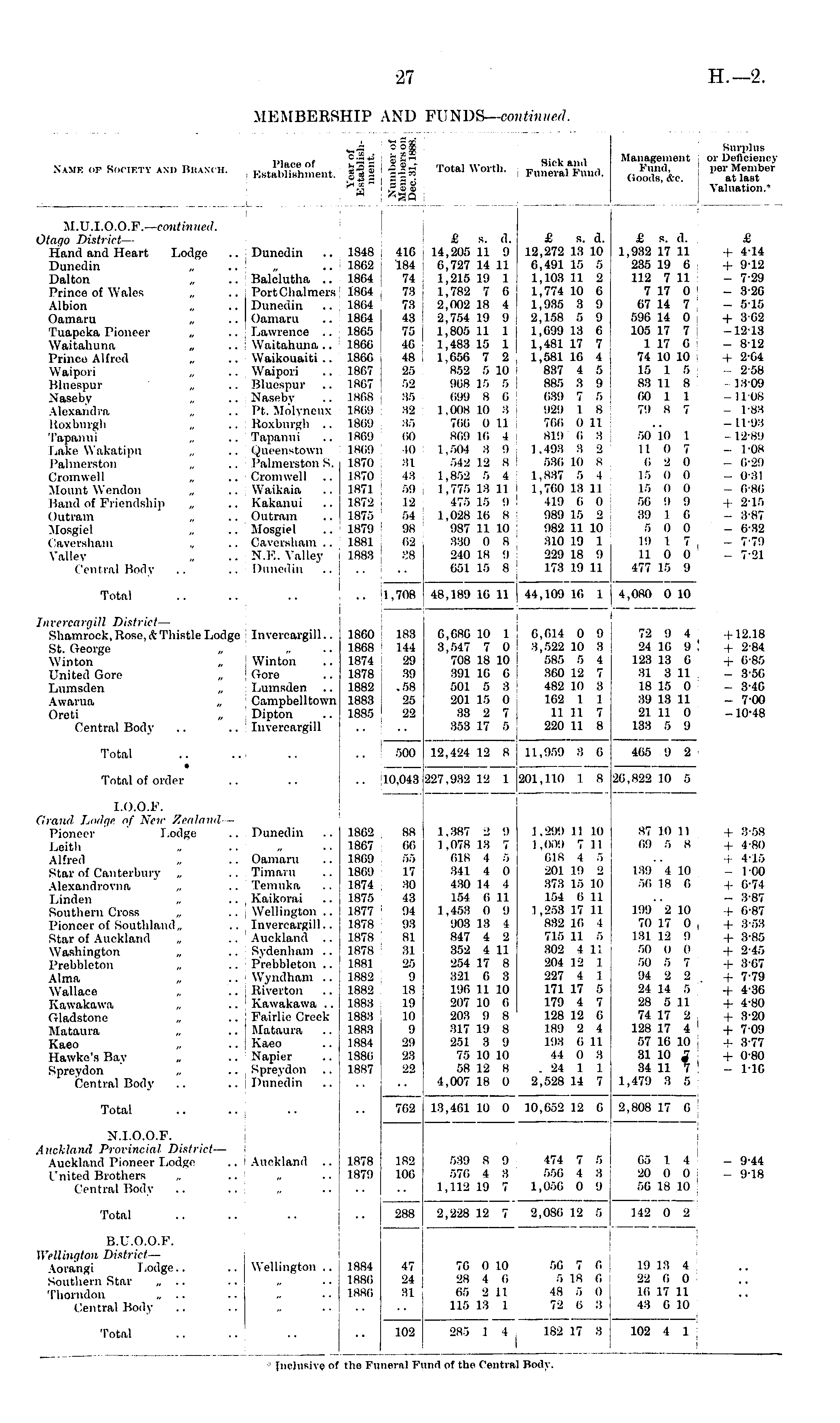 NAM. OP BOCIKTT ASD BBAXCH. Hi _ . l i l Nun: op S',c m:ty ami Branch. 0.9 4l'lace of _:__ r Establishment. 5 5 5 r- 7 " IJg Tolal Worth. .7; » a, L___J 1 Sick and Funeral Fund. Surplus Management 1,1- Deficiency Fund. per Member Qoods, Sec. at last Valuation.' 1 i M.U-I.O.O.F.— continued. Otago District — Hand and Heart Lodge .. Dunedin .. 1848 Dunedin .. 1802 Dalton „ .. Balclutha .. 1804 Prince of Wales „ .. PortChalmors 1804 Albion ., .. Dunedin .. 1804 Oamaru „ .. I Oamaru .. 1804 j Tuapeka Pioneer „ .. I Lawrence .. 1805 Waitahuna „ .. Waitahuna .. 1800 Prince Alfred „ .. Waikouaiti .. 1866 Waipori „ .. Waipori .. 1867 Bluespur „ .. Bluespur .. 1867 Naseby „ .. Naseby .. 1868 Alexandra „ .. Pt. Molvncux 180,0 Roxburgh „ .. Roxburgh .. I860 Tapanui „ .. Tapanui .. 1869 l.nkc Wakatipu „ .. Queenstown 1869 Palmerston „ .. Palmerston S. 1S70 Cromwell „ .. Cromwell .. 1870 Mount Wendon „ .. Waikaia .. 1871 Band of Friendship „ .. Kakanui .. 1872 Outran. „ .. Out ram .. 1875 Mosgicl „ .. Mosgiel .. 1879 Caversham , .. Caversham.. issi Valley „ .. N.F.. Valley 1888 Central Body .. .. Dunedin £ s. d. 416 : 14,205 11 9 184 i 6,727 14 11 74 , 1,215 19 1 78 1,782 7 6 78 2,002 18 4 43 2,754 19 9 75 1,805 11 1 40 1,483 15 1 48 1.056 7 2 25 852 5 10 02 0OS 10 5 05 0,00 S 0 32 1.008 1(1 0 86 700 0 11 00 869 10 4 40 1.504 3 0 81 042 12 S 10 1,852 5 4 00 1,775 13 11 12 475 15 0 01 1.028 10 8 98 087 11 10 02 380 0 8 38 240 18 9 051 15 8 £ s. d. 12,272 13 10 6,491 15 5 I 1,103 11 2 1,774 10 6 1,005 3 9 2,158 5 9 1,099 13 6 1,481 17 7 1,581 1G 4 i 837 4 5 885 3 9 : 030 7 5 ■ 020 1 S 700 (I 11 sio 0 3 I. 100 3 2 000 Hi s 1.837 5 4 1.700 10 11 410 0 0 089 15 2 982 11 10 310 19 1 , 229 18 9 I 173 19 11 £ s. d. _. 1,932 17 11 + 4-14 235 19 6 + 9-12 112 7 11 - 7-29 7 17 0 ' - 3-26 67 14 7 - 5-15 596 14 0 + 3-62 105 17 7 -1213 1 17 6 - 8-12 74 10 10 + 2-64 15 1 5 - 2-58 88 11 8 13-09 60 1 1 -1108 79 8 7 - 1-88 -11-98 50 10 1 - 12-89 11 0 7 - 1-08 0 2 0 - 6-29 10 0 0 - 001 15 0 0 - 6-86 50 0 9 + 2-15 39 1 0 - 3-87 5 0 0 - 682 19 1 7 - 7-70 11 0 0 - 7-21 477 15 9 Total .. .. .. .. 1 1 .708 1,708 48,189 10 11 48,189 16 11 44,109 10 1 4,080 0 10 Invercargill District — Shamrock, Rose,* Thistle Lodge Invercargill.. 1860 St. George „ „ 1808 Winton „ J Winton .. 1874 United Gore „ (lore .. 1878 Lumsden „ : Lumsden .. 1882 Awarua „ Campbelltown 1883 Oreti „ Dipton .. 1885 ! Central Body .. .. Invercargill 1800 183 1808 ' 144 1874 29 1878 39 1882 58 1883 25 1885 ! 22 183 6,686 10 1 1 144 3,547 7 0 29 708 18 10 39 391 16 6 58 501 5 3 25 201 15 0 22 33 2 7 353 17 5 0,686 10 1 3,547 7 0 708 18 10 391 16 6 501 5 3 201 15 0 33 2 7 353 17 5 6,614 0 9 3,522 10 3 585 5 4 000 12 7 482 10 3 162 1 1 11 11 7 220 11 8 72 9 4 24 10 9 1 123 13 0 31 3 11 18 15 0 39 13 11 21 11 0 133 5 9 + 12.18 + 2-84 + 6-85 - 3-56 - 3-46 - 7-00 -10-48 Total 500 500 12,424 12 8 12,424 12 8 11,050 0 0 466 9 2 Total of order .. .. .. _ .. 10,043 10,043 227,932 12 1 227,932 12 1 201,110 1 8 20,822 10 5 I.O.O.F. "rand Lodge of New Zealand- - Pioneer Lodge .. Dunedin .. 1802 Leith .. 1867 Alfred „ .. Oamaru .. 1869 Star of Canterbury „ .. Timaru .. 1800 Alexandrovna „ .. Temuka .. 1874 Linden „ .. Ivaikorai .. 1S75 Southern Cross „ .. Wellington.. 1877 Pioneer of Southland,, .. Invercargill.. 1878 Star of Auckland „ .. Auckland .. 1878 Washington „ .. Sydenham .. 1878 Prebbleton „ .. Prebbleton.. 1881 Alma „ .. Wyndham .. 1882 Wallace „ .. j Riverton .. 1882 Kawakawa „ .. 'Kawakawa .. isso Gladstone „ .. Fairlie Creek 1883 Mataura „ .. Mataura .. 1888 Kaeo „ .. Kaeo .. 1884 Hawke's Bay „ .. Napier .. 1886 Spreydon „ .. Spreydon .. 1887 Central Body .. ..Dunedin ' ' 88 1,387 2 9 66 1.078 13 7 55 01S 4 0 17 841 4 0 30 480 14 I 43 154 0 11 94 1,453 0 (I 93 000 13 4 81 847 4 2 31 352 4 11 25 254 17 8 9 321 6 3 18 196 11 10 19 207 10 0 10 203 0 S 9 817 19 8 29 251 3 0 23 75 10 10 22 58 12 8 4,007 18 0 1802 88 18G7 00 1S00 55 1809 17 1874 30 1875 43 1877 94 1878 03 1878 81 1878 31 1881 25 1882 9 1SS2 18 1880 19 L888 10 1SS0 9 1 SSI 29 L886 23 1887 22 1,387 2 9 1.078 13 7 01S 4 0 841 4 0 480 14 l 154 6 11 1 ,453 0 (I 000 13 4 847 4 2 352 4 11 254 17 8 321 6 3 190 11 10 207 10 0 203 9 S 317 19 8 251 3 0 75 10 10 58 12 8 4,007 18 0 1.200 11 1(1 1.009 7 11 0,1 S I 0 201 19 2 070 15 10 104 0 11 1.203 17 11 882 16 4 715 11 5 302 4 11 204 12 I 227 4 1 171 17 5 179 4 7 128 12 6 189 2 4 100 0 11 44 0 3 24 1 1 2,528 14 7 87 10 11 00 5 8 100 4 10 50 IS 0 100 2 10 70 17 0 j 131 12 9 00 0 (l 00 5 7 94 2 2 24 14 5 28 5 11 74 17 2 128 17 4 57 10 10 31 10 j 34 11 7 1,479 3 5 • 8-68 + 4-80 + 4-15 - 100 | 0-71 - 3-87 + 6-87 + 8-58 + 3-85 + 2-45 I- 3-07 r 7-79 + 4-36 + 4-80 + 3-20 + 709 + 3-77 + 0-80 - 116 Total 702 702 702 13,461 10 0 13,461 10 0 10,052 12 0 2,808 17 0 N.I.O.O.F. Auckland Provincial District — Auckland Pioneer Lodge .. Auckland .. 1878 United Brothers „ .. „ .. 1879 Central Body .. .. „ .... 1878 1879 182 100 182 000 8 0 106 570 4 3 1,112 19 7 000 8 9 474 7 5 570 4 3 000 4 3 1,112 19 7 1,050 0 9 05 1 4 20 0 0 50 18 10 ' - 9-44 - 9-18 Total 288 288 2,228 12 7 2,228 12 7 2.0S6 12 5 142 0 2 B.U.O.O.F. Wellington District — Aorangi Lodge.. ..Wellington.. 1884 Southern Star „ .. .. „ .. 1886 Thorndon „ .. .. .. • • 1886 Central Body .. .. „ .. I .. Total 1884 1886 1880 47 70 (I 10 24 28 4 0 31 1 65 2 11 115 13 1 102 285 1 4 47 24 HI 70 0 10 28 4 6 66 2 11 115 13 1 50 7 0 5 18 0 48 5 O 72 0 0, 10 10 4 22 0 0 10 17 11 43 0 10 102 285 1 1 I 1S2 17 8 102 4 1 I Inclusive of ilic l-'im the Fu neral Fund of the Centvt icvii] l-'i and of the Central Body.