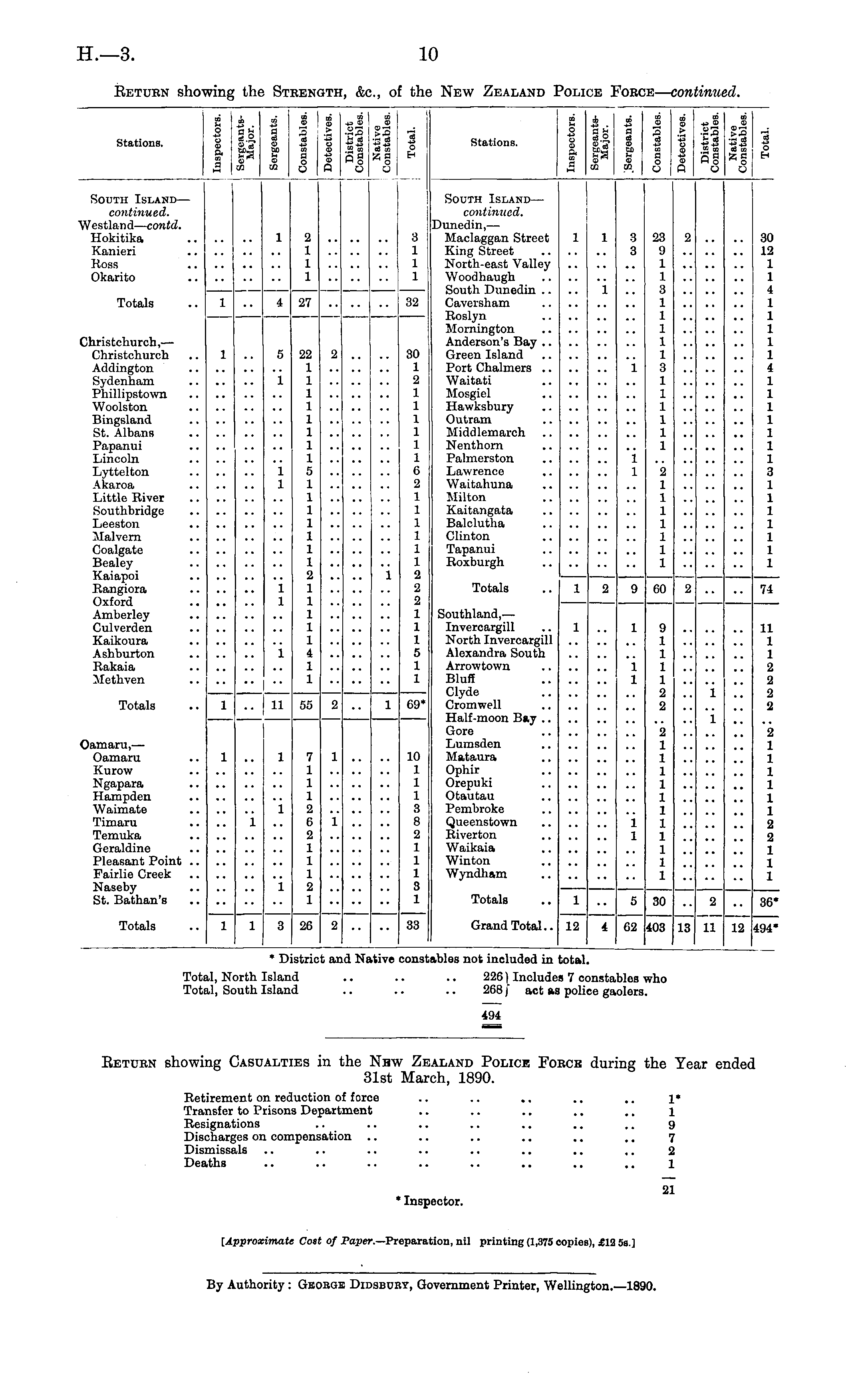 Total, North Island .. .. .. 226 ) Includes 7 constables who Total, South Island .. .. .. 268 j act as police gaolers. 494