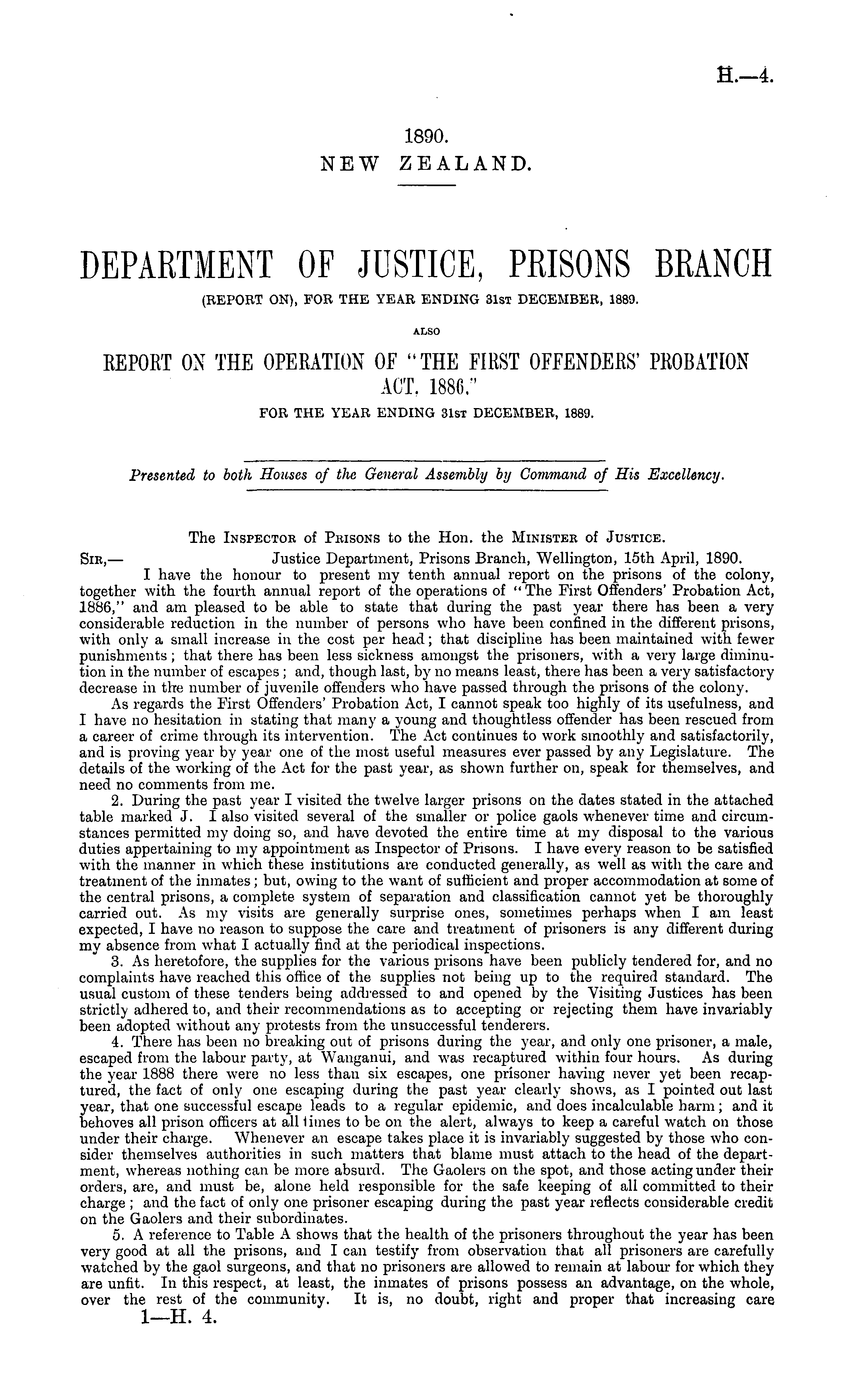The Inspectoe of Peisons to the Hon. the Minister of Justice. Sic, — Justice Department, Prisons Branch, Wellington, 15th April, 1890. I have the honour to present my tenth annual report on the prisons of the colony, together with the fourth annual report of the operations of " The First Offenders' Probation Act, 1886," and am pleased to be able to state that during the past year there has been a very considerable reduction in the number of persons who have been confined in the different prisons, with only a small increase in the cost per head; that discipline has been maintained with fewer punishments; that there has been less sickness amongst the prisoners, with a very large diminution in the number of escapes; and, though last, by no means least, there has been a very satisfactory decrease in the number of juvenile offenders who have passed through the prisons of the colony. As regards the First Offenders' Probation Act, I cannot speak too highly of its usefulness, and I have no hesitation in stating that many a young and thoughtless offender has been rescued from a career of crime through its intervention. The Act continues to work smoothly and satisfactorily, and is proving year by year one of the most useful measures ever passed by any Legislature. The details of the working of the Act for the past year, as shown further on, speak for themselves, and need no comments from me. 2. During the past year I visited the twelve larger prisons on the dates stated in the attached table marked J. I also visited several of the smaller or police gaols whenever time and circumstances permitted my doing so, and have devoted the entire time at my disposal to the various duties appertaining to my appointment as Inspector of Prisons. I have every reason to be satisfied with the manner in which these institutions are conducted generally, as well as with the care and treatment of the inmates; but, owing to the want of sufficient and proper accommodation at some of the central prisons, a complete system of separation and classification cannot yet be thoroughly carried out. As my visits are generally surprise ones, sometimes perhaps when I am least expected, I have no reason to suppose the care and treatment of prisoners is any different during my absence from what I actually find at the periodical inspections. 3. As heretofore, the supplies for the various prisons have been publicly tendered for, and no complaints have reached this office of the supplies not being up to the required standard. The usual custom of these tenders being addressed to and opened by the Visiting Justices has been strictly adhered to, and their recommendations as to accepting or rejecting them have invariably been adopted without any protests from the unsuccessful tenderers. 4. There has been no breaking out of prisons during the year, and only one prisoner, a male, escaped from the labour party, at Wanganui, and was recaptured within four hours. As during the year 1888 there were no less than six escapes, one prisoner having never yet been recaptured, the fact of only one escaping during the past year clearly shows, as I pointed out last year, that one successful escape leads to a regular epidemic, and does incalculable harm; and it behoves all prison officers at all limes to be on the alert, always to keep a careful watch on those under their charge. Whenever an escape takes place it is invariably suggested by those who consider themselves authorities in such matters that blame must attach to the head of the department, whereas nothing can be more absurd. The Gaolers on the spot, and those acting under their orders, are, and must be, alone held responsible for the safe keeping of all committed to their charge ; and the fact of only one prisoner escaping during the past year reflects considerable credit on the Gaolers and their subordinates. 5. A reference to Table A shows that the health of the prisoners throughout the year has been very good at all the prisons, and I can testify from observation that all prisoners are carefully watched by the gaol surgeons, and that no prisoners are allowed to remain at labour for which they are unfit. In this respect, at least, the inmates of prisons possess an advantage, on the whole, over the rest of the community. It is, no doubt, right and proper that increasing care I—H. 4.
