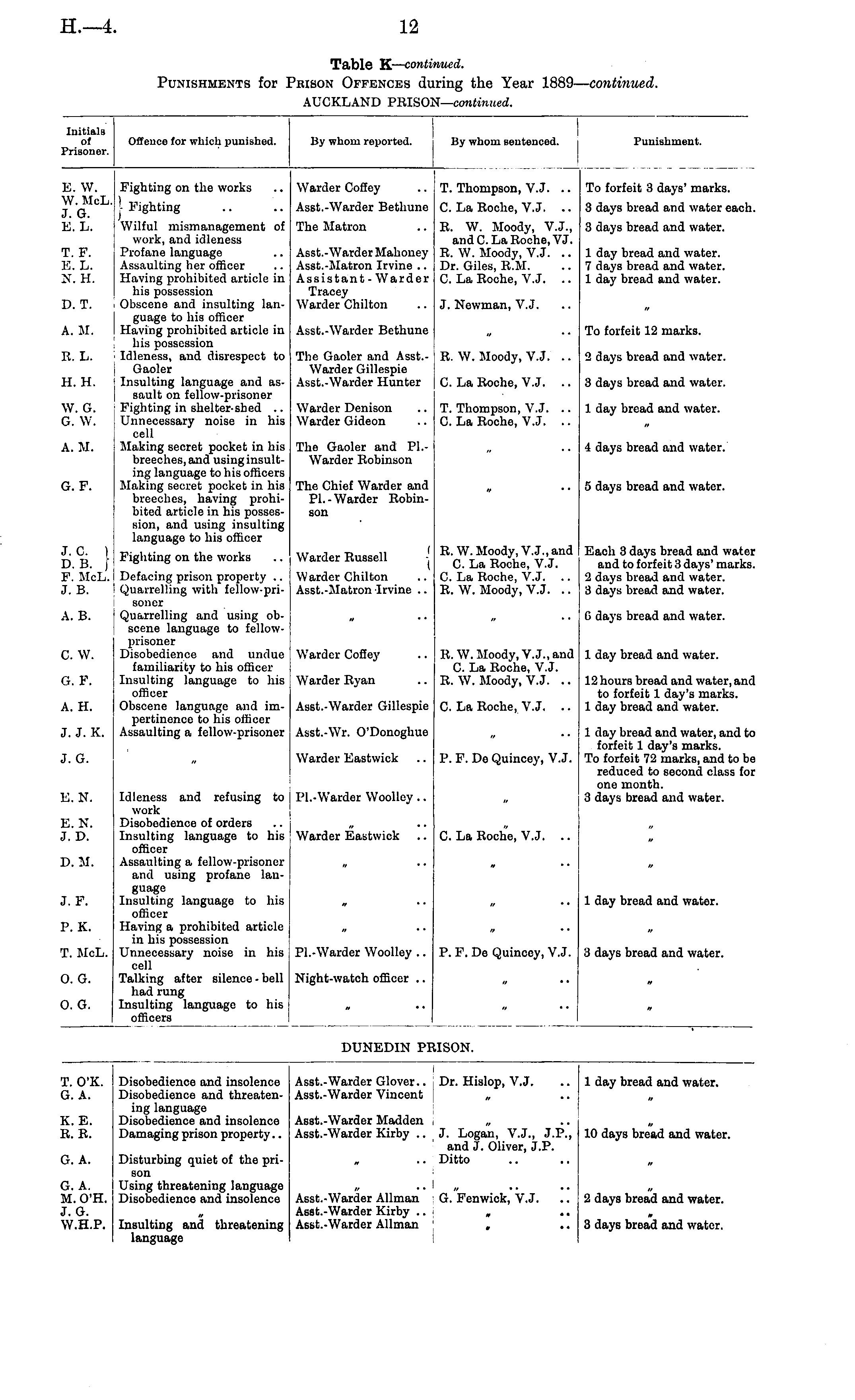 Initials of ?risouer. Offence for which punished. By whom reported. By whom sentenced. Punishment. E.W. W. McL. J. G. E. L. Fighting on the works | Fighting Wilful mismanagement of work, and idleness Profane language Assaulting her officer Having prohibited article in his possession Obscene and insulting language to his officer 1 laving prohibited article in his possession Idleness, and disrespect to Gaoler Insulting language and assault on fellow-prisoner Fighting in shelter-shed .. Unnecessary noise in his cell Making secret pocket in his breeches, and using insulting language to his officers Making secret pocket in his breeches, having prohibited article in his possession, and using insulting language to his officer Fighting on the works Defacing prison property .. Quarrelling with fellow-pri-soner Quarrelling and using obscene language to fellowprisoner Disobedience and undue familiarity to his officer Insulting language to his officer Obscene language and impertinence to his officer Assaulting a fellow-prisoner Warder Coffey Asst.-Warder Bethune T. Thompson, V.J. .. To forfeit 3 days' marks. C. La Roche, V.J. .. 3 days bread and water each. The Matron R. W. Moody, V.J., and C. La Roche, VJ. R. W. Moody, V.J. .. Dr. Giles, R.M. C. La Roche, V.J. .. 3 days bread and water. T. F. E. L. N. H. Asst.-Warder Mahoney Asst.-Matron Irvine .. Assistant - Warder Tracey Warder Chilton 1 day bread and water. 7 days bread and water. 1 day bread and water. D. T. J. Newman, V.J. A. M. Asst.-Warder Bethune To forfeit 12 marks. R. L. The Gaoler and Asst.Warder Gillespie Asst.-Warder Hunter R. W. Moody, V.J. .. 2 days bread and water. H. II. C. La Roche, V.J. .. 3 days bread and water. W. G. G. W. Warder Denison Warder Gideon T. Thompson, V.J. .. C. La Roche, V.J. .. 1 day bread and water. A. M. The Gaoler and Pl.Warder Robinson 4 days bread and water. G. F. The Chief Warder and Pl.-Warder Robinson 5 days bread and water. i.e. 1 D. B. / P. McL. J. B. Warder Russell R.W. Moody, V.J., and C. La Roche, V.J. C. La Roche, V.J. .. R. W. Moody, V.J. .. Each 3 days bread and water and to forfeit 3 days' marks. 2 days bread and water. 3 days bread and water. Warder Chilton Asst.-Matron Irvine .. a. B. 6 days bread and water. C. W. Warder Coffey R.W. Moody, V.J., and C. La Roche, V.J. R. W. Moody, V.J. .. 1 day bread and water. G. F. Warder Ryan 12 hours bread and water, and to forfeit 1 day's marks. 1 day bread and water. A. H. Asst.-Warder Gillespie C. La Roche, V.J. .. J. J. K. Asst.-Wr. O'Donoghue 1 day bread and water, and to forfeit 1 day's marks. To forfeit 72 marks, and to be reduced to second class for one month. 3 days bread and water. J. G. Warder Eastwick P. F. Do Quincey, V.J. i-:. n. Idleness and refusing to work Disobedience of orders Insulting language to his officer Assaulting a fellow-prisoner and using profane language Insulting language to his officer Having a prohibited article in his possession Unnecessary noise in his cell Talking after silence - bell had rung Insulting language to his officers Pl.-Warder Woolley .. E.N. J. D. Warder Eastwick C. La Roche, V.J. .. D. M. .. J. F. a •' 1 day bread and water. P. K. r. McL. Pl.-Warder Woolloy .. P. F. De Quincey, V.J. 3 days bread and water. d.G. Night-watch officer .. D. G. « ..