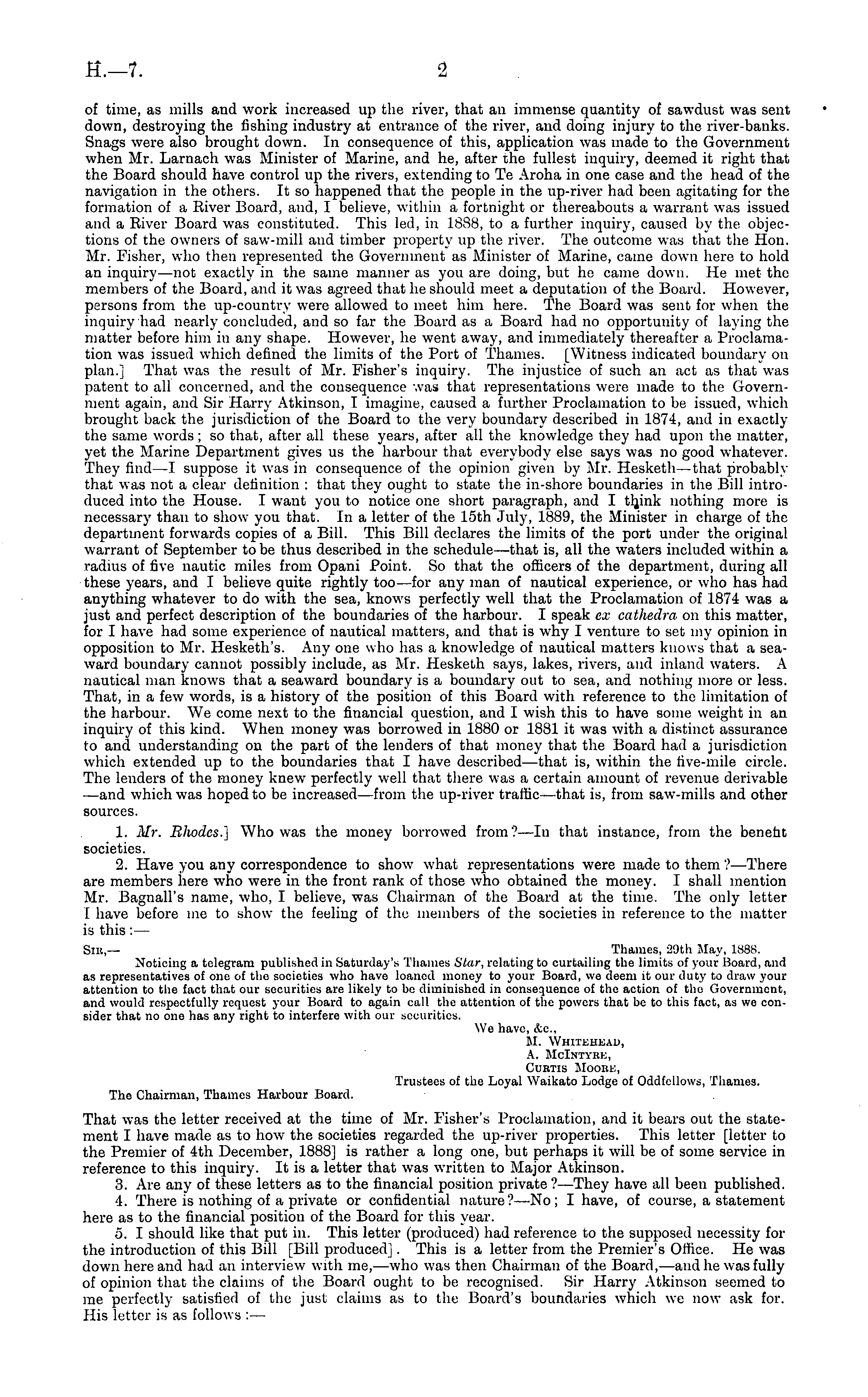 of time, as mills and work increased up the river, that an immense quantity of sawdust was sent down, destroying the fishing industry at entrance of the river, and doing injury to the river-banks. Snags were also brought down. In consequence of this, application was made to the Government when Mr. Larnach was Minister of Marine, and he, after the fullest inquiry, deemed it right that the Board should have control up the rivers, extending to Te Aroha in one case and the head of the navigation in the others. It so happened that the people in the up-river had been agitating for the formation of a River Board, and, I believe, within a fortnight or thereabouts a warrant was issued and a River Board was constituted. This led, in 1888, to a further inquiry, caused by tho objections of the owners of saw-mill and timber property up the river. The outcome was that the Hon. Mr. Fisher, who then represented the Government as Minister of Marine, came down here to hold an inquiry—not exactly in the same manner as you are doing, but he came down. He met the members of the Board, and it was agreed that he should meet a deputation of the Board. However, persons from the up-country were allowed to meet him here. The Board was sent for when the inquiry had nearly concluded, and so far the Board as a Board had no opportunity of laying the matter before him in any shape. However, he went away, and immediately thereafter a Proclamation was issued which defined the limits of the Port of Thames. [Witness indicated boundary on plan.] That was the result of Mr. Fisher's inquiry. The injustice of such an act as that was patent to all concerned, and the consequence was that representations were made to the Government again, and Sir Harry Atkinson, I imagine, caused a further Proclamation to be issued, which brought back the jurisdiction of the Board to the very boundary described in 1874, and in exactly the same words; so that, after all these years, after all the knowledge they had upon the matter, yet the Marine Department gives us the harbour that everybody else says was no good whatever. They find—l suppose it was in consequence of the opinion given by Mr. Hesketh—that probably that was not a clear definition : that they ought to state the in-shore boundaries in the Bill introduced into the House. I want you to notice one short paragraph, and I tljink nothing more is necessary than to show you that. In a letter of the 15th July, 1889, the Minister in charge of the department forwards copies of a Bill. This Bill declares the limits of the port under the original warrant of September to be thus described in the schedule—that is, all the waters included within a radius of five nautic miles from Opani Point. So that the officers of the department, during all these years, and I believe quite rightly too—for any man of nautical experience, or who has had anything whatever to do with the sea, knows perfectly well that the Proclamation of 1874 was a just and perfect description of the boundaries of the harbour. I speak ex cathedra on this matter, for I have had some experience of nautical matters, and that is why I venture to set my opinion in opposition to Mr. Hesketh's. Any one who has a knowledge of nautical matters knows that a seaward boundary cannot possibly include, as Mr. Hesketh says, lakes, rivers, and inland waters. A nautical man knows that a seaward boundary is a boundary out to sea, and nothing more or less. That, in a few words, is a history of the position of this Board with reference to tho limitation of the harbour. We come next to the financial question, and I wish this to have some weight in an inquiry of this kind. When money was borrowed in 1880 or 1881 it was with a distinct assurance to and understanding on the part of the lenders of that money that the Board had a jurisdiction which extended up to the boundaries that I have described—that is, within the live-mile circle. The lenders of the money knew perfectly well that there was a certain amount of revenue derivable —and which was hoped to be increased—from the up-river traffic—that is, from saw-mills and other sources. 1. Mr. Rhodes.] Who was the money borrowed from?—ln that instance, from the benefit societies. 2. Have you any correspondence to show what representations were made to them ?—There are members here who were in the front rank of those who obtained the money. I shall mention Mr. Bagnall's name, who, I believe, was Chairman of the Board at the time. The only letter I have before me to show the feeling of tho members of the societies in reference to the matter is this: — Silt,— Thames, 29th May, ISBB. Noticing a telegram published in Saturday's Thames Star, relating to curtailing the limits of your Board, and as representatives of one of the societies who have loaned money to your Board, we deem it our duty to draw your attention to the fact that our securities are likely to bo diminished in consequence of the action of the Government, and would respectfully request your Board to again call the attention of the powers that be to this fact, as we consider that no one has any right to interfere with our securities. We have, &c, M. Whitehead, A. MoINTYBE, Curtis Moore, Trustees of the Loyal Waikato Lodge of Oddfellows, Thames. Tho Chairman, Thames Harbour Board. That was the letter received at the time of Mr. Fisher's Proclamation, and it bears out the statement I have made as to how the societies regarded the up-river properties. This letter [letter to the Premier of 4th December, 1888] is rather a long one, but perhaps it will be of some service in reference to this inquiry. It is a letter that was written to Major Atkinson. 3. Are any of these letters as to the financial position private '.'—They have all been published. 4. There is nothing of a private or confidential nature?—-No; I have, of course, a statement here as to the financial position of tho Board for this year. 5. I should like that put in.
