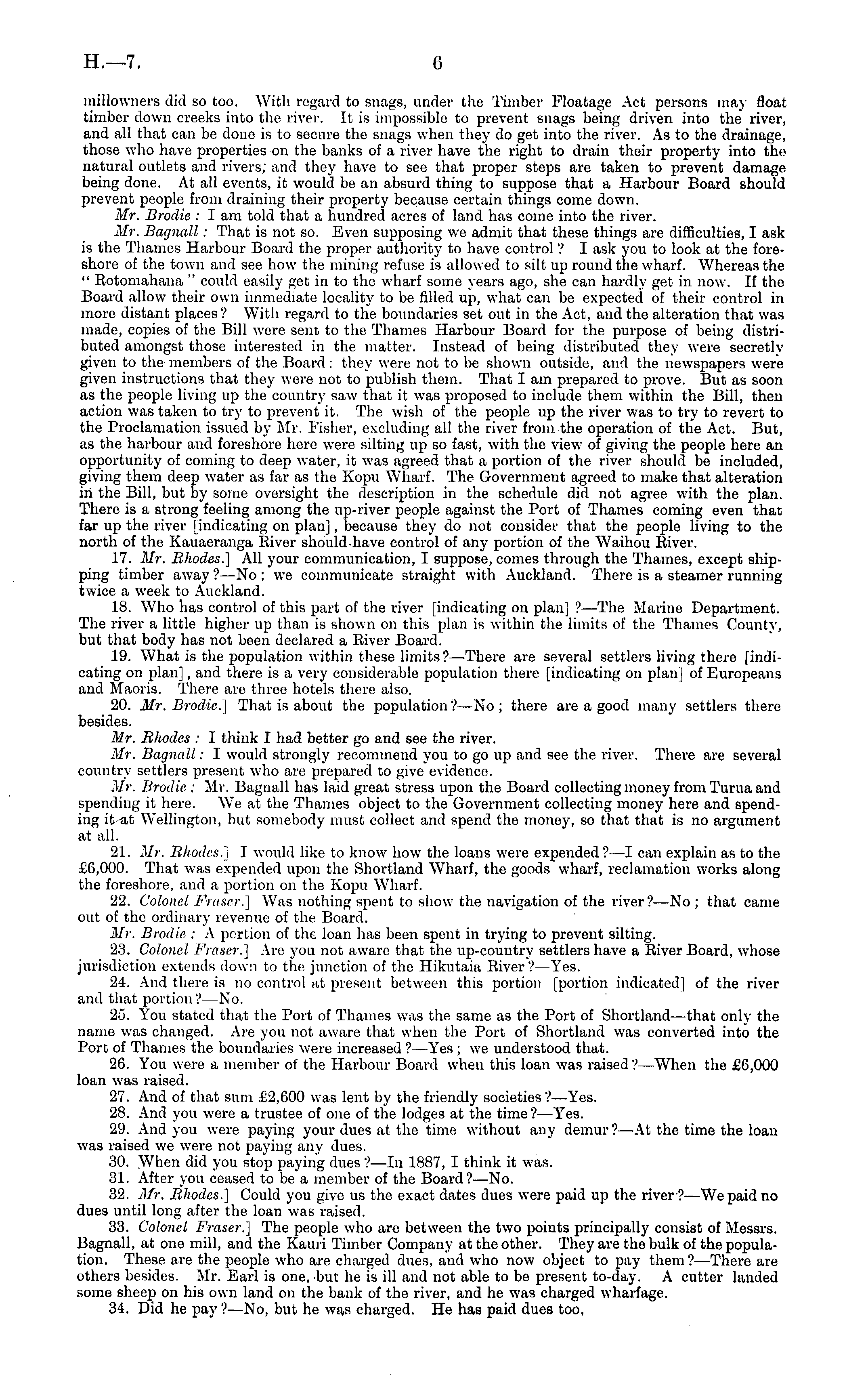 millowners did so too. With regard to snags, under the Timber Floatage Act persons may float timber down creeks into tho river. It is impossible to prevent snags being driven into the river, and all that can be done is to secure the snags when they do get into the river. As to the drainage, those who have properties on the banks of a river have the right to drain their property into tho natural outlets and rivers; and they have to see that proper steps are taken to prevent damage being done. At all events, it would be an absurd thing to suppose that a Harbour Board should prevent people from draining their property because certain things come down. Mr. Brodie : I am told that a hundred acres of land has come into the river. Mr. Bagnall : That is not so. Even supposing we admit that these things are difficulties, I ask is the Thames Harbour Board the proper authority to have control ? I ask you to look at the foreshore of the town and see how the mining refuse is allowed to silt up round the wharf. Whereas the " Rotomahana " could easily get in to the wharf some years ago, she can hardly get in now. If the Board allow their own immediate locality to be filled up, what can be expected of their control in more distant places? With regard to the boundaries set out in the Act, and the alteration that was made, copies of the Bill were sent to the Thames Harbour Board for the purpose of being distributed amongst those interested in the matter. Instead of being distributed they were secretly given to the members of the Board : they were not to be shown outside, and the newspapers were given instructions that they were not to publish them. That lam prepared to prove. But as soon as the people living up the country saw that it was proposed to include them within the Bill, then action was taken to try to prevent it. The wish of the people up the river was to try to revert to the Proclamation issued by Mr. Fisher, excluding all the river from the operation of the Act. But, as the harbour and foreshore here were silting up so fast, with the view of giving the people here an opportunity of coining to deep water, it was agreed that a portion of the river should be included, giving them deep water as far as the Kopu Wharf. The Government agreed to make that alteration in the Bill, but by some oversight the description in the schedule did not agree with the plan. There is a strong feeling among the up-river people against the Port of Thames coming even that far up the river [indicating on plan], because they do not consider that the people living to the north of the Kauaeranga River should-have control of any portion of the Waihou River. 17. Mr. Rhodes.] All your communication, I suppose, comes through the Thames, except shipping timber away? —No; we communicate straight with Auckland. There is a steamer running twice a week to Auckland. 18. Who has control of this part of the river [indicating on plaiij ? —The Marine Department. The river a little higher up than is shown on this plan is within the limits of the Thames County, but that body has not been declared a River Board. 19. What is the population within these limits ? —There are several settlers living there [indicating on plan], and there is a very considerable population there [indicating on plan] of Europeans and Maoris. There are three hotels there also. 20. Mr. Brodie] That is about the population?—No; there are a good many settlers there besides. Mr. Rhodes : I think I had better go and see the river. Mr. Bag mi 11: I would strongly recommend you to go up and see the river. There are several country settlers present who are prepared to give evidence. Mr. Brodie : Mr. Bagnall has laid great stress upon the Board collecting money from Turua and spending it here. W T e at the Thames object to the Government collecting money here and spending it -at Wellington, but somebody must collect and spend the money, so that that is no argument at all. 21. Mr. Rhodes.] I would like to know how the loans were expended ?—I can explain as to the £6,000. That was expended upon the Shortland Wharf, the goods wharf, reclamation works along the foreshore, and a portion on the Kopu Wharf. 22. Colonel Fraser. Was nothing spent to show the navigation of the river?—No; that came out of the ordinary revenue of the Board. Mr. Brodie : A portion of the loan has been spent in trying to prevent silting. 23. Colonel Eraser.] Are you not aware that the up-country settlers have a River Board, wdiose jurisdiction extends down to the junction of the Hikutaia River ?—Yes. 24. And there is no control at present between this portion [portion indicated] of the river and that portion?— No. 25. You stated that the Port of Thames was the same as the Port of Shortland—that only the name was changed. Are you not aware that when the Port of Shortland was converted into the Port of Thames the boundaries were increased ?—Yes ; we understood that. 26. You were a member of the Harbour Board when this loan was raised?— When the £6,000 loan was raised. 27. And of that sum £2,600 was lent by the friendly societies?— Yes. 28. And you were a trustee of one of the lodges at the time?— Yes. 29. And you were paying your dues at the time without any demur ?—At the time the loan was raised we were not paying any dues. 30. \Vhen did you stop paying dues ?—ln 1887, I think it was. 31. After you ceased to be a member of the Board?— No. 32. Mr. Rhodes.] Could you give us the exact dates dues were paid up the river ?—We paid no dues until long after the loan was raised. 33. Colonel Fraser.] The people who are between the two points principally consist of Messrs. Bagnall, at one mill, and the Kauri Timber Company at the other. They are the bulk of the population. These are the people who are charged dues, and who now object to pay them ?—There are others besides. Mr. Earl is one, but he is ill and not able to be present to-day. A cutter landed some sheep on his own l