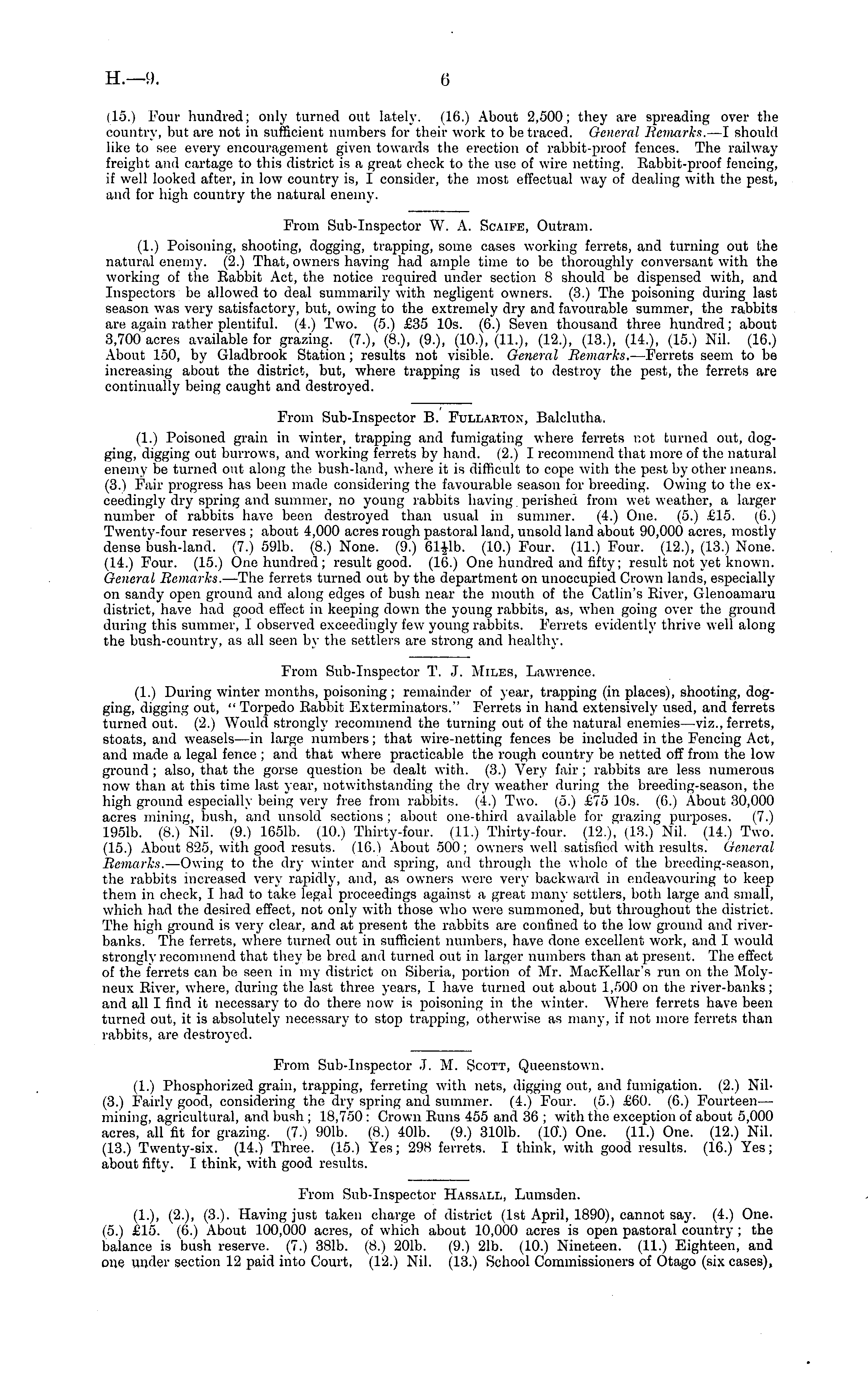 From Sub-Inspector Hassall, Lumsden. (1.), (2.), (3.). Having just taken charge of district (Ist April, 1890), cannot say. (4.) One. (5.) £15. (6.) About 100,000 acres, of which about 10,000 acres is open pastoral country ; the balance is bush reserve. (7.) 381b. (8.) 201b. (9.) 21b. (10.) Nineteen. (11.) Eighteen, and one under section 12 paid into Court, (12.) Nil. (13.) School Commissioners of Otago (six cases),