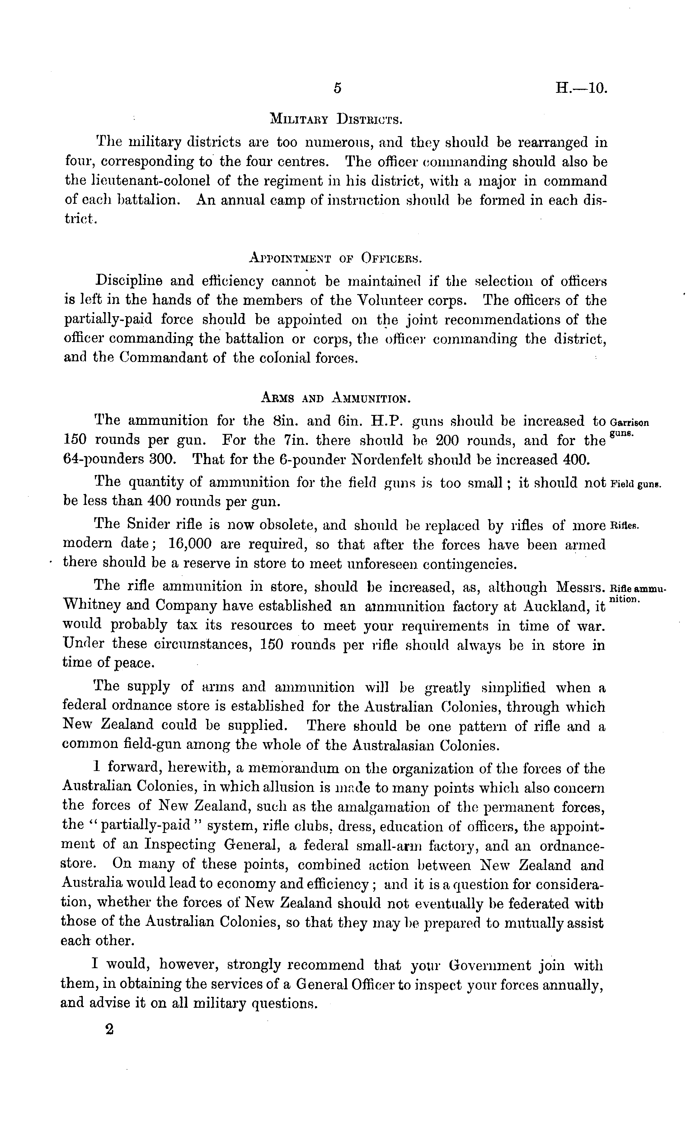 Military Districts. The military districts are too numerous, and they should be rearranged in four, corresponding to the four centres. The officer commanding should also be the lieutenant-colonel of the regiment in his district, with a major in command of each battalion. An annual camp of instruction should be formed in each district. Appointment of Officers. Discipline and efficiency cannot be maintained if the selection of officers is left in the hands of the members of the Volunteer corps. The officers of the partially-paid force should be appointed on the joint recommendations of the officer commanding the battalion or corps, the officer commanding the district, and the Commandant of the colonial forces. Arms and Ammunition. The ammunition for the Bin. and 6in. H.P. guns should be increased to 150 rounds per gun. For the 7in. there should be 200 rounds, and for the 64-pounders 300. That for the 6-pounder Nordenfelt should be increased 400. The quantity of ammunition for the field guns is too small; it should not be less than 400 rounds per gun. The Snider rifle is now obsolete, and should lie replaced by rifles of more modern date; 16,000 are required, so that after the forces have been armed there should be a reserve in store to meet unforeseen contingencies. The rifle ammunition in store, should be increased, as, although Messrs. Whitney and Company have established an ammunition factory at Auckland, it would probably tax its resources to meet your requirements in time of war. Under these circumstances, 150 rounds per rifle should always be in store in time of peace. The supply of arms and ammunition will be greatly simplified when a federal ordnance store is established for the Australian Colonies, through which New Zealand could be supplied. There should be one pattern of rifle and a common field-gun among the whole of the Australasian Colonies. I forward, herewith, a memorandum on the organization of the forces of the Australian Colonies, in which allusion is mr.de to many points which also concern the forces of New Zealand, such as the amalgamation of the permanent forces, the "partially-paid" system, rifle clubs, dress, education of officers, the appointment of an Inspecting General, a federal small-arm factory, and an ordnancestore. On many of these points, combined action between New Zealand and Australia would lead to economy and efficiency ; and it is a question for consideration, whether the forces of New Zealand should not eventually be federated with those of the Australian Colonies, so that they maybe prepared to mutually assist each other. I would, however, strongly recommend that your Government join with them, in obtaining the services of a General Officer to inspect your forces annually, and advise it on all military questions. 2