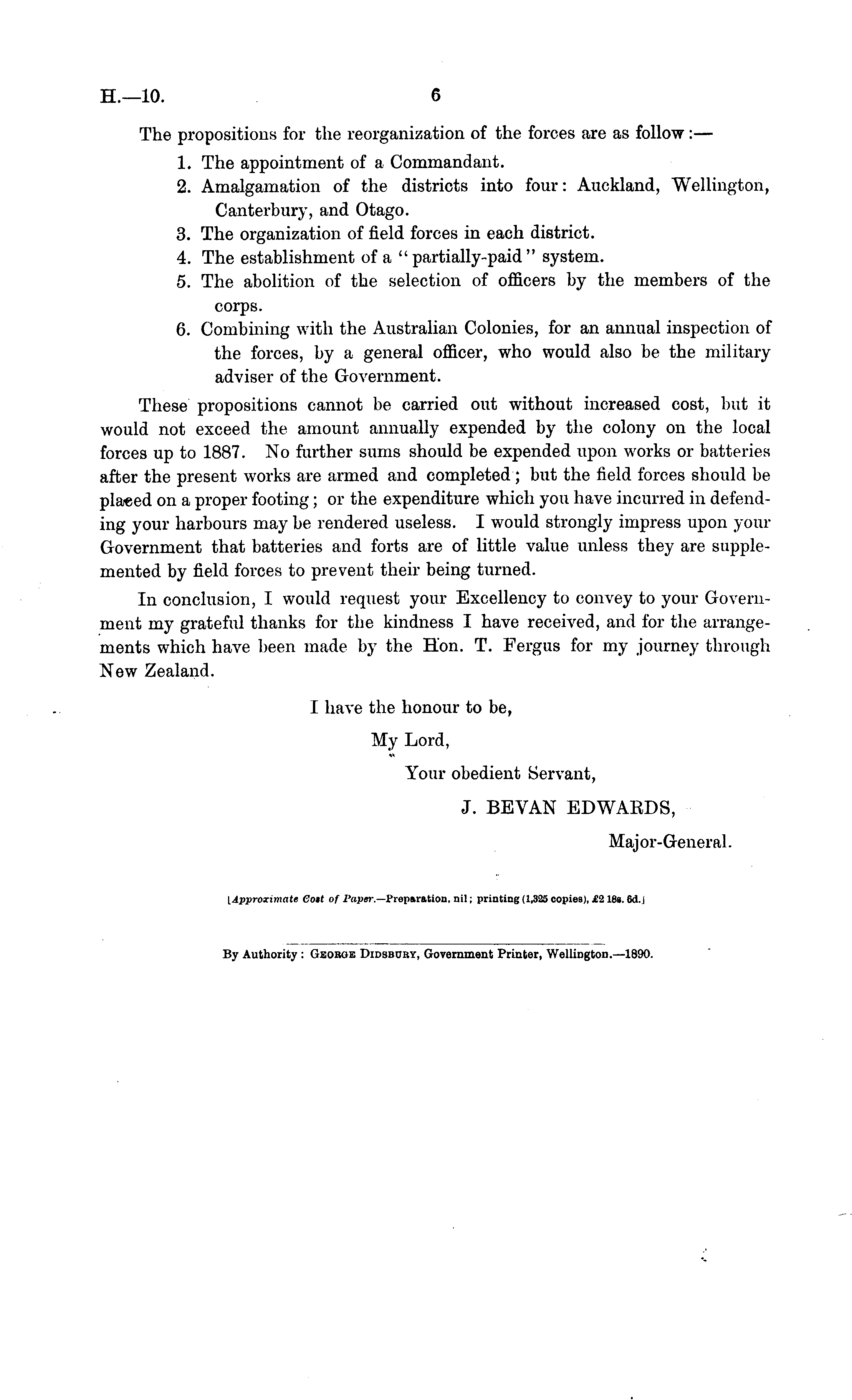 The propositions for the reorganization of the forces are as follow:— 1. The appointment of a Commandant. 2. Amalgamation of the districts into four: Auckland, Wellington, Canterbury, and Otago. 3. The organization of field forces in each district. 4. The establishment of a "partially-paid" system. 5. The abolition of the selection of officers by the members of the corps. 6. Combining with the Australian Colonies, for an annual inspection of the forces, by a general officer, who would also be the military adviser of the Government. These propositions cannot be carried out without increased cost, but it would not exceed the amount annually expended by the colony on the local forces up to 1887. No further sums should be expended upon works or batteries after the present works are armed and completed ; but the field forces should be placed on a proper footing; or the expenditure which you have incurred in defending your harbours may be rendered useless. I would strongly impress upon your Government that batteries and forts are of little value unless they are supplemented by field forces to prevent their being turned. In conclusion, I would request your Excellency to convey to your Government my grateful thanks for the kindness I have received, and for the arrangements which have been made by the Hon. T. Fergus for my journey through New Zealand. I have the honour to be, My Lord, Your obedient Servant, J. BEVAN EDWABDS, Major-General. [Approximate Cott of Paper.— Preparation, nil; printing (1325 copies), £2 18s. 6d. I