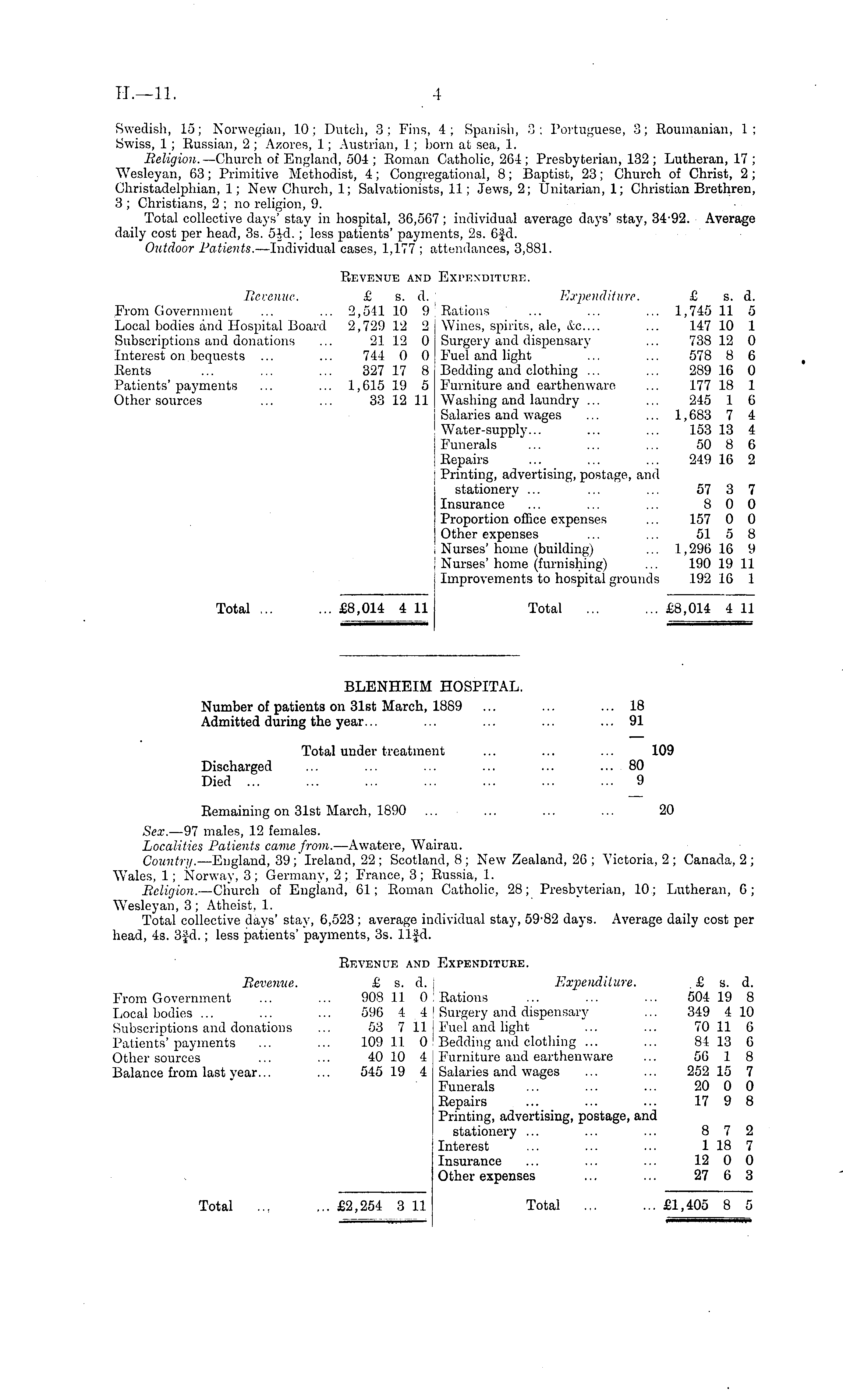 BLENHEIM HOSPITAL. Number of patients on 31st March, 1889 ... ... ... 18 Admitted during the year... ... ... ... ... 91 Total under treatment ... ... ... 109 Discharged ... ... ... ... ... ... 80 Died 9 Remaining on 31st March, 1890 ... ... ... ... 20 Sex. —97 males, 12 females. Localities Patients came from. —Awatere, Wairau. Country. —England, 39; Ireland, 22 ; Scotland, 8 ; New Zealand, 26 ; Victoria, 2 ; Canada, 2 ; Wales, 1; Norway, 3; Germany, 2; France, 3; Eussia, 1. Beligion. —Church of England, 61; Eoman Catholic, 28; Presbyterian, 10; Lutheran, 6; W T esleyan, 3; Atheist, 1. Total collective days' stay, 6,523 ; average individual stay, 5982 days. Average daily cost per head, 4s. 3fd.; less patients' payments, 3s. llfd. Revenue and Expendituee. Revenue. £ s. d. j Expenditure. . £ s. d. From Government ... ... 908 11 0 Rations ... ... ... 504 19 8 Local bodies ... ... ... 596 44! Surgery and dispensary ... 349 410 Subscriptions and donations ... 53 711 Fuel and light ... ... 70 11 6 Patients'payments ... ... 109 11 0 Bedding and clothing ... ... 84 13 6 Other sources ... ... 40 10 4 Furniture and earthenware ... 5618 Balance from last year... ... 545 19 4 Salaries and wages ... ... 252 15 7 Funerals ... ... ... 20 0 0 Eepairs ... ... ... 17 9 8 Printing, advertising, postage, and stationery ... ... ... 872 Interest ... ... ... 1 18 7 Insurance ... ... ... 12 0 0 Other expenses ... ... 27 6 3 Total ,„ ... £2,254 311 Total £1,405 8 5