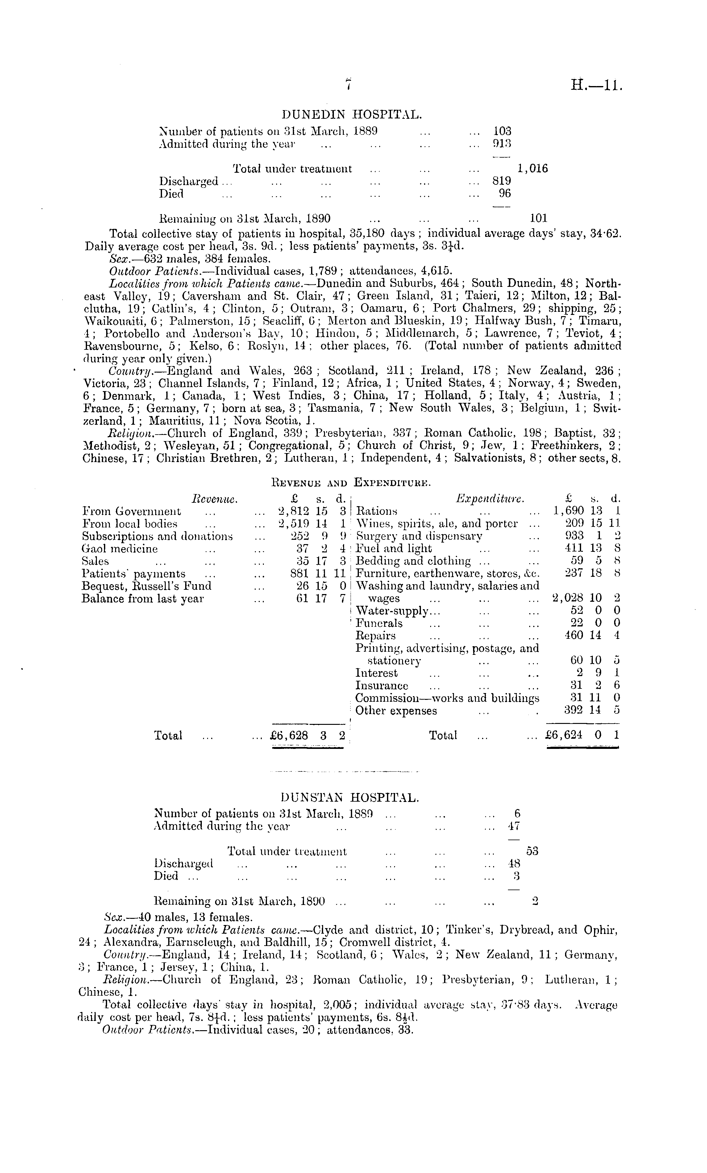 DDNEDIN HOSPITAL. Number of patients on 31st March, 1889 ... ... 103 Admitted during the year ... ... ... ... 913 Total under treatment ... ... ... 1,016 Discharged... .... ... ... ... ... 819 Died ... ... ... ... ... ... 96 Remaining on 31st March, 1890 ... ... ... 101 Total collective stay of patients in hospital, 35,180 days ; individual average days' stay, 34-62. Daily average cost per head, 3s. 9d.; less patients' payments, 3s. 3Jd. Sex. —632 males, 384 females. Outdoor Patients. —lndividual cases, 1,789 ; attendances, 4,615. Localities from which Patients came. —Dunedin and Suburbs, 464 ; South Dunedin, 48; Northeast Valley, 19; Caversham and St. Clair, 47; Green Island, 31; Taieri, 12; Milton, 12; Balclutha, 19; Catlin's, 4 ; Clinton, 5; Outrani, 3; Oamaru, 6; Port Chalmers, 29; shipping, 25; Waikouaiti, 6 ; Palmerston, 15; Seacliff, 6 ; Merton and Blueskin, 19; Halfway Bush, 7 ; Timaru, 4; Portobello and Anderson's Bay, 10; Hindou, 5; Middlemarch, 5; Lawrence, 7; Teviot, 4; Ravensbourne, 5; Kelso, 6; Roslyn, 14; other places, 76. (Total number of patients admitted during year only given.) Country.— England and Wales, 263 ; Scotland, 211 ; Ireland, 178 ; New Zealand, 236 ; Victoria, 23 ; Channel Islands, 7; Finland, 12; Africa, 1 ; United States, 4; Norway, 4; Sweden, 6 ; Denmark, 1; Canada, 1; West Indies, 3; China, 17 ; Holland, 5 ; Italy, 4; Austria, 1; France, 5; Germany, 7 ; born at sea, 3; Tasmania, 7 ; New South Wales, 3; Belgium, 1; Switzerland, 1; Mauritius, 11; Nova Scotia, 1. Religion.— Church of England, 339; Presbyterian, 337; Roman Catholic, 198; Baptist, 32; Methodist, 2; Wesleyan, 51; Congregational, 5; Church of Christ, 9; Jew, 1; Freethinkers, 2; Chinese, 17 ; Christian Brethren, 2; Lutheran, 1; Independent, 4 ; Salvationists, 8; other sects, 8. Revenue and Expenditure. Revenue. £ s. d. Expenditure. £ s. d. From Government ... ... 2,812 15 3 Rations ... ... ... 1,690 13 1 From local bodies ... ... 2,519 14 1 Wines, spirits, ale , , and porter ... 209 15 11 Subscriptions and donations ... 252 9 9 Surgery and dispensary ... 933 1 2 Gaol medicine ... ... 37 2 4 ; Fuel and light "... ... 411 13 8 Sales ... ... ... 35 17 3 Bedding and clothing ... ... 59 5 8 Patients'payments ... ... 881 11 11 Furniture, earthenware, stores, &c. 237 18 8 Bequest, Russell's Fund ... 26 15 0 Washing and laundry, salaries and Balance from last year ... 61 17 7 wages ... ... ... 2,028 10 2 Water-supply... ... ... 52 0 0 'Funerals ... ... ... 22 0 0 Repairs ... ... ... 460 14 4 Printing, advertising, postage, and stationery ... ... 60 10 5 Interest ... ... ... 291 : Insurance ... ... ... 31 2 6 Commission—works and buildings 31 11 0 Other expenses ... . 392 14 5 Total ... ... £6,628 3 2 Total ... ... £6,624 0 1