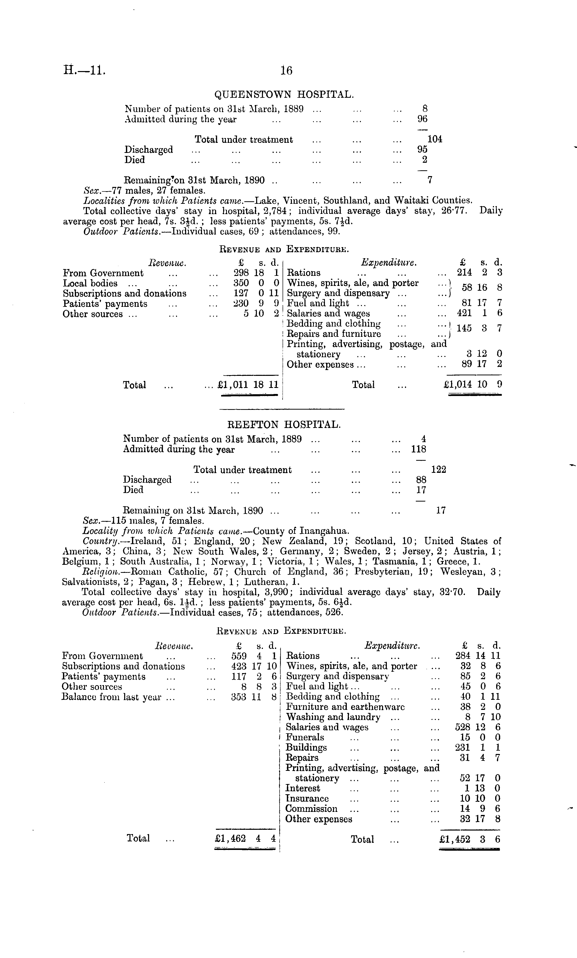 REEFTON HOSPITAL. Number of patients on 31st March, 1889 ... ... ... 4 Admitted during the year ... ... ... ... 118 Total under treatment ... ... ... 122 Discharged ... ... ... ... ... ... 88 Died ... ... ... ... ... ... 17 Remaining on 31st March, 1890 ... ... ... ... 17 Sex. —lls males, 7 females. Locality from which Patients came. —County of Inangahua. Country.— lreland, 51; England, 20; New Zealand, 19; Scotland, 10; United States of America, 3; China, 3; New South Wales, 2 ; Germany, 2; Sweden, 2; Jersey, 2; Austria, 1; Belgium, 1 ; South Australia, 1 ; Norway, 1; Victoria, 1; Wales, 1; Tasmania, 1; Greece, 1. Religion. —Roman Catholic, 57; Church of England, 36; Presbyterian, 19; Wesleyan, 3 ; Salvationists, 2; Pagan, 3; Hebrew, 1; Lutheran, 1. Total collective days' stay in hospital, 3,990; individual average days' stay, 3270. Daily average cost per head, 6s. 1-id. ; less patients' payments, ss. 6|d. Outdoor Patients. —lndividual cases, 75; attendances, 526. Revenue and Expendituke. Revenue. £ s. d. Expenditure. £ s. d. From Government ... ... 559 4 1 Rations ... ... ... 284 14 11 Subscriptions and donations ... 423 17 10 Wines, spirits, ale, and porter ... 32 8 6 Patients'payments ... ... 117 2 6 Surgery and dispensary ... 85 2 6 Other sources ... ... 883 Fuel and light... ... ... 45 0 6 Balance from last year ... ... 353 11 8 Bedding and clothing ... ... 40 111 I Furniture and earthenware ... 38 2 0 I Washing and laundry ... ... 8 7 10 i Salaries and wages ... ... 528 12 6 I Funerals ... ... ... 15 0 0 ; Buildings ... ... ... 231 1 1 Repairs ... ... ... 31 4 7 Printing, advertising, postage, and stationery ... ... ... 52 17 0 Interest ... ... ... 1 13 0 Insurance ... ... ... 10 10 0 Commission ... ... ... 14 9 6 Other expenses ... ... 32 17 8 Total ... £1,462 4 4 Total ... £1,452 3 6