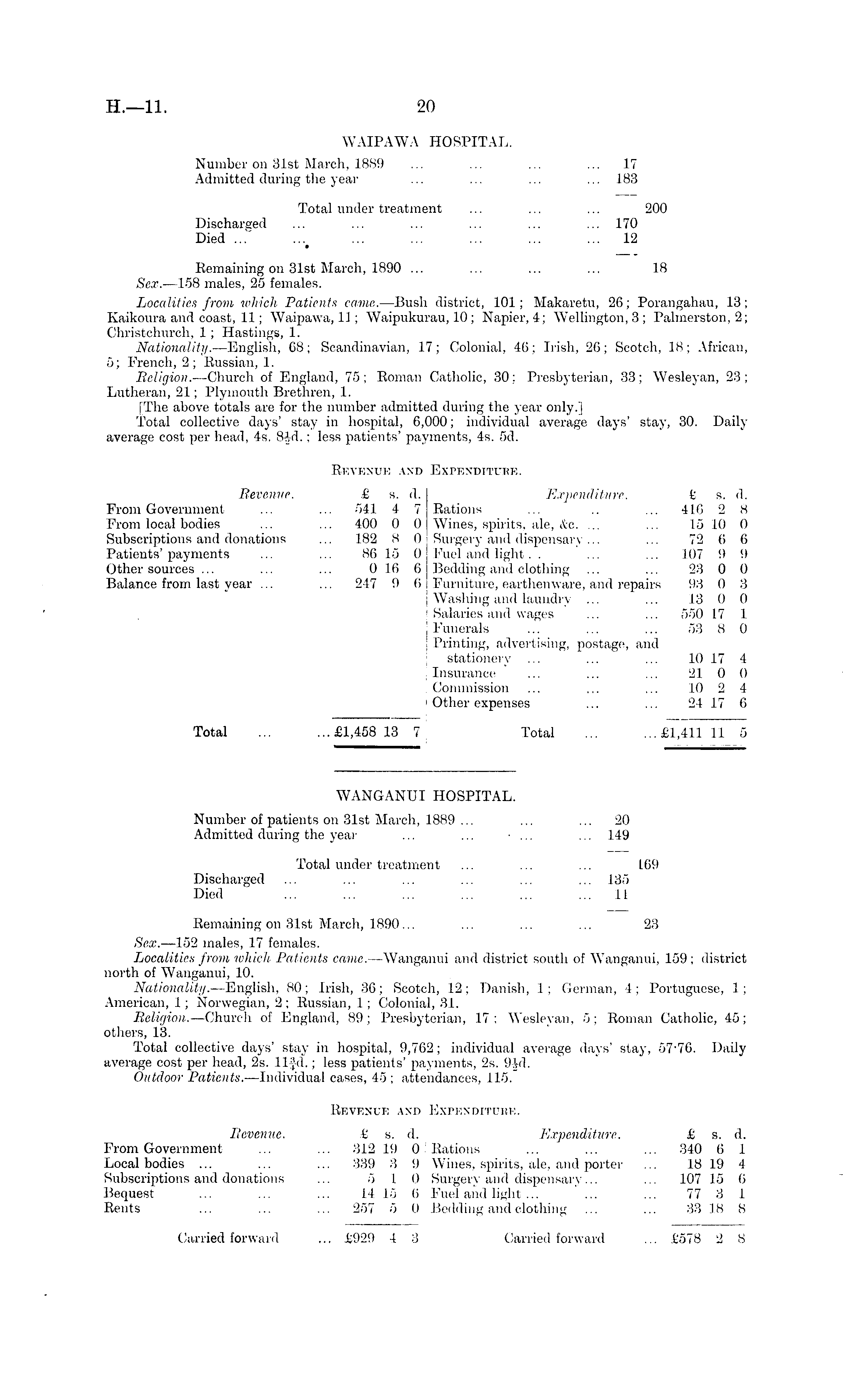 WANGANUI HOSPITAL. Number of patients on 31st March, 1889 ... ... ... 20 Admitted during the year ... ... ... ... 149 Total under treatment ... ... ... 169 Discharged ... ... ... ... ... ... 135 Died ... ... ... ... ~. ... 11 Remaining on 31st March, 1890... ... ... ... 23 Sex. —ls2 males, 17 females. Localities from which Patients came. —Wanganui and district south of Wanganui, 159; district north of Wanganui, 10. Nationality. —English, 80; Irish, 36; Scotch, 12; Danish, 1; German, 4; Portuguese, 1; American, 1; Norwegian, 2 ; Russian, 1; Colonial, 31. Beligion. —Church of England, 89; Presbyterian, 17 ; Wesleyan, 5; Roman Catholic, 45; others, 13. Total collective days' stay in hospital, 9,762; individual average days' stay, 57 - 76. Daily average cost per head, 2s. llfd.; less patients' payments, 2s. 9id. Outdoor Patients. —lndividual cases, 45 ; attendances, 115. Revenue and Expenditure. Bevenue. £ s. d. Expenditure. £ s. d. From Government ... ... 312190! Rations ... ... ... 340 6 1 Local bodies ... ... ... 339 3 9 Wines, spirits, ale, and porter ... 18 19 4 Subscriptions and donations ... 5 1 0 Surgery and dispensary... ... 107 15 6 Bequest ... ... ... 14 15 6 Fuel and light ... "... ... 77 3 1 Rents ... ... ... 257 5 0 Bedding and clothing ... ... 33 18 8 Carried forward ... £929 4 3, Carried forward ... £578 2 S