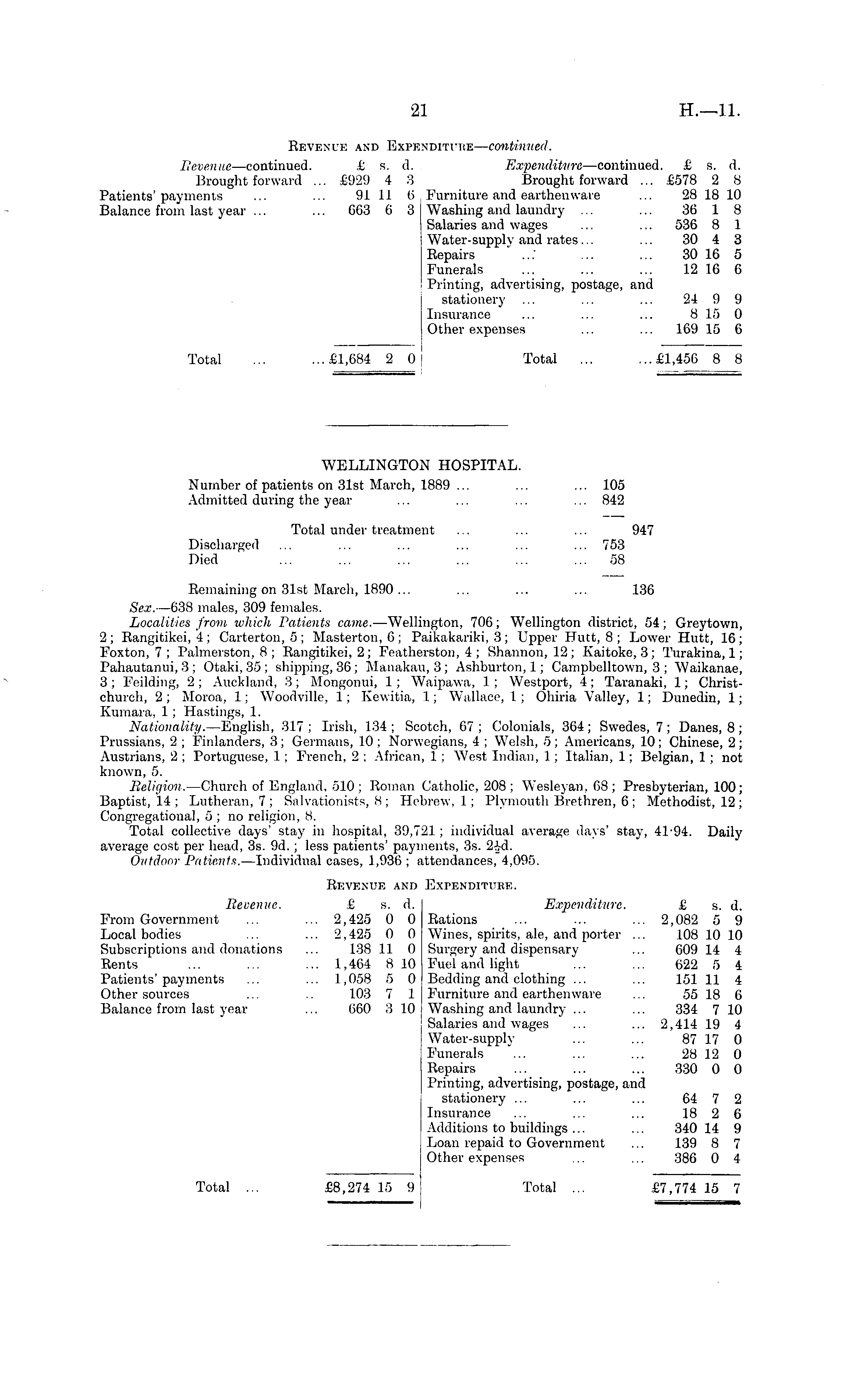 WELLINGTON HOSPITAL. Number of patients on 31st March, 1889 ... ... ... 105 Admitted during the year ... ... ... ... 842 Total under treatment ... ... ... 947 Discharged ... ... ... ... ... ... 753 Died ... ... ... ... ... ... 58 Remaining on 31st March, 1890... ... ... ... 136 Sex.— 63B males, 309 females. Localities from which Patients came. —Wellington, 706; Wellington district, 54; Greytown, 2 ; Rangitikei, 4; Carterton, 5 ; Masterton, 6; Paikakariki, 3; Upper Hint, 8 ; Lower Hutt, 16; Foxton, 7 ; Palmerston, 8 ; Rangitikei, 2 ; Featherston, 4 ; Shannon, 12 ; Kaitoke, 3 ; Turakina, 1; Pahautanui, 3 ; Otaki, 35 ; shipping, 36; Manakau, 3; Ashburton, 1; Campbelltown, 3 ; Waikanae, 3; Feilding, 2; Auckland, 8; Mongonui, 1; Waipawa, 1; Westport, 4; Taranaki, 1; Christchurch, 2 ; Moroa, 1; Woodville, 1; Kewitia, 1; Wallace, 1; Ohiria Valley, 1; Dunedin, 1; Kuinara, 1 ; Hastings, 1. Nationality.— English, 317 ; Irish, 134 ; Scotch, 67 ; Colonials, 364 ; Swedes, 7 ; Danes, 8 ; Prussians, 2 ; Finlanders, 3 ; Germans, 10 ; Norwegians, 4 ; Welsh, 5 ; Americans, 10 ; Chinese, 2 ; Austrians, 2 ; Portuguese, 1; French, 2 ; African, 1 ; West Indian, 1; Italian, 1; Belgian, 1 ; not known, 5. Beligion. —Church of England, 510 ; Roman Catholic, 208 ; Wesleyan, 68 ; Presbyterian, 100; Baptist, 14 ; Lutheran, 7 ; Salvationists, 8 ; Hebrew, 1; Plymouth Brethren, 6 ; Methodist, 12 ; Congregational, 5 ; no religion, S. Total collective days' stay in hospital, 39,721 ; individual average days' stay, 4194. Daily average cost per head, 3s. 9d.; less patients' payments, 3s. 2id. Outdoor Patients. —lndividual cases, 1,936 ; attendances, 4,095. Revenue and Expenditure. Bevenue. £ s. d. Expenditure. £ s. d. From Government ... ... 2,425 0 0 Rations ... ... ... 2,082 5 9 Local bodies ... ... 2,425 0 0 Wines, spirits, ale, and porter ... 108 10 10 Subscriptions and donations ... 138 11 0 Surgery and dispensary ... 609 14 4 Rents ... ... ... 1,464 8 10 Fuel and light ... ... 622 5 4 Patients'payments ... ... 1,058 5 0 Bedding and clothing ... ... 151 11 4 Other sources ... .. 103 7 1 Furniture and earthenware ... 55 18 6 Balance from last year ... 660 310 Washing and laundry ... ... 334 710 Salaries and wages ... ... 2,414 19 4 Water-supply ... ... 87 17 0 Funerals ... ... ... 28 12 0 Repairs ... ... ... 330 0 0 Printing, advertising, postage, and stationery ... ... ... 64 7 2 Insurance ... ... ... 1826 Additions to buildings... ... 340 14 9 Loan repaid to Government ... 139 8 7 Other expenses ... ... 386 0 4 Total ... £8,274 15 9 Total ... £7,774 15 7