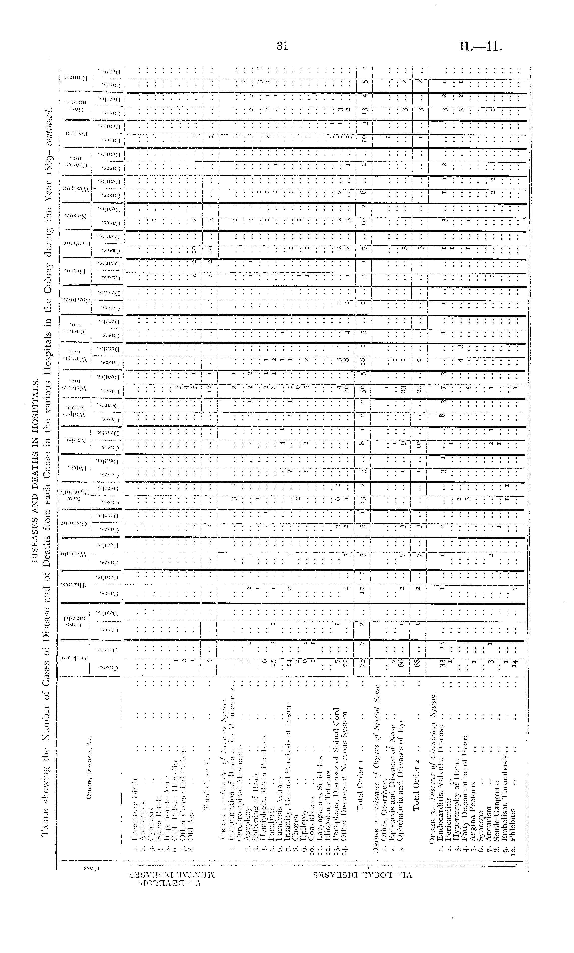 si S c n o C 3 _ z PL. Si 3 - '3 1 o 5 ___ O a. U o u w H g Orders, Diseases, kc. C ] u ! u c g -T- ' x x: u Q U - rt . Si - 3 u u il I ** 0 Q to 0 U Q u u : § 1 2 I. \ P. u ] C _0_|_Q_ 1 1 1 i i U Q ■ 1 U j C dj f i. Premature Birth i c/) 2. Atelectasis 5 3. Cyanosis £jS 4. Spina Bifida .. > 2 J 5- Imperforate Anus Wj| 6. Cleft Palate, Hare-lip .. Q? 7. Other Congenital Defects I H 8. Old Age 3 I Total Class V. .. 1 1 1 1 1 1 I I ■• •• .. .. .. .. :: ..,.. H" ■ ■ •• • ■• ■• • •• 'I ..I. .. .. ..... .. I •• .. .. .. .. • • .. • ■ d.J " .. .. .. . • ■• ■•: - .. .. "i ■■ * - .. .. .. .. • - 3 ■ •• • • .. 1.. " •■ • ■• ■■ •• •• "\'\ 1 ..... --; •■ 1 .... 4; 2 44 - •• 1 "i " I •• '•I H 1 H --H — - --! - H - H H H I J - H— H~A H4 .. .. .. .. 1. 2 .. _ 1 12 1 • 4 2 10 .. — — -H -M U-— — — _L_ __J — -- ——i — -- — —— — L_L_J U— — — — Order i.— Diseases of Nervous System. 1. Inflammation of Brain or its Membranes.. Cerebro-spinal Meningitis 2. Apoplexy 3. Softening of Brain 4. Hemiplegia, Brain Paralysis 5. Paralysis .. .'. 6. Paralysis Agitans 7. Insanity, General Paralysis of Insane 8. Chorea 9. Epilepsy • 10. Convulsions y II. Laryngismus Stridulus .. w 12. Idiopathic Tetanus y 13. Paraplegia, Diseases of Spinal Cord en 14. Other Diseases of Nervous System 1 1 2 6 14 2 0 I •• j 3 ■■ 1 •• •• .. 2 1 . .. .. 2 1 .. 1 1 3 i •• 2 ■ • • 4 ••I 2 •■ ■ - i ■• 1 ■ ■ • 1 "I I ■• 2 2 2 8 1 6 5 ' ■ A 1 1 ■■ •• •• • I 2 I •1 - - .. - - - • • • • • • 1 "I I ■ ■ ■ ■ - - •■ ■ • 2 • - " 2 I I 1 • 1 1 1 1 — 1 1 1 2 .. 1 .. 2 H 4 H ' 1 i 1 •• 3 1 1 ■■ 2 •■ - I < ! - - .. • • i •• .. 1.. •• •• 1 ■• - •• .. •■ - • 1 1 1 • [ - - .. .. ■■ - • 2 - ■ ' " .. 1 .. • in <s. en •• •• • • - - ■ - " • ■ •• • " - '■ •■ •• - .. .. .. | .. 2 .. 2 .. 5 1 3 •• 3 •• - - .. • - ■ •• ■ ■ 1 1 1 1 3 •• 1 1 7 21 1 - - •• ■■ .. .. .. .. .. .. .. 6 ' ■■ •■ - - - • • •• 20 3 s A • •• I ■ • •• A • • z ■ •• 2 • • •• 3 2 • •• 4 ■ • 10 1 3 1 •• •• •• •• 4 I - I ■ 2 • 3 • 1 - •• Total Order 1 .. J — M - H — H H M H iS M H H H H H •• 6 H H H H H H i'J O 75 7 2 ■• h—M "3 - 3 ■■ 8 .! 2 H SO * :! 5 2 ■■ 4 1 .1 7 - 10 H .. 2 10 J '3 4 L3 U Order 2.— Diseases of Organs of Special Sense. O 1. Otitis. Otorrhosa 2. Epistaxis and Diseases of Nose 3. Ophthalmia and Diseases of Eye 5 I ■■ •• .. .. —- .. .. •• •• L.J •• ~ •• u- •• —j "I I I — — - • • _J —A — — k- — — — L_ 1 2 C6 - 1 - .. 2 .. 2 .. 1 .. •• » • ■■ •• - • •• " - - • •• ■ •• • ■ •■: •• •• 1 .. 9 — 1 •• 23 - • 3: •• - .. 3 4 ■• • • Total Order 2 .. 68 — ■■ — 1 H ! - 1 10 H H 24 H H 2 H - H H •■ • • .. . .. • •• - .. 3 ■■ "I •' •• 2 — — L— — Order 3.— Diseases of Circulatory System. 1. Endocarditis, Valvular Disease .. 2. Pericarditis 3. Hypertrophy of Heart 4. Fatty Degeneration of Heart 5. Angina Pectoris 6. Syncope 7. Aneurism 8. Senile Gangrene 9. Embolism, Thrombosis 10. Phlebitis 33 •• « 14 •I • l • - 1 1 2 .. ■■ 2 5 •• 3 I • • • •• I •I • • 8 ' h •• — 7. 4 ; • • • ■ •1 4 ■ ■• ,i • 1 1 ■•: ■• •1 1 1 1 _J 3 1 I - "' •' L--1 —J 1 • • ■ — 2 3 •■ 3 ■ A ■• — 1 • 1 U- • • • • • •• - ■ .. 2 1 • r • 1 ■ .. " 3 1 2J .. ■• ■ • ■ 2 2 I - •• 1 .. 1 • " ■■! i • - i H •! ■ 1 •■ 14 ■ ■ • • .. .. ., ..' •• .. • ■ •' . • • .. ■• •• .. .. •■ • ■ •• • • •■ ••I •■ ■ ■ .. 1 i