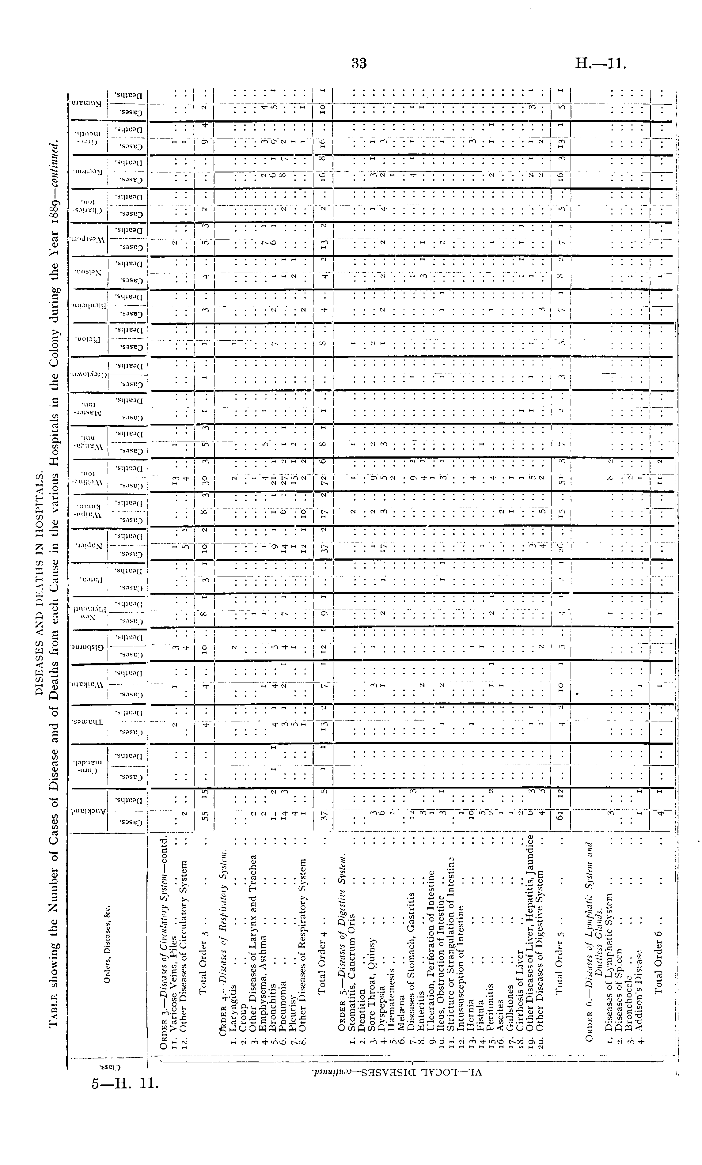 DISEASES AND DEATHS IN HOSPITALS. Table showing the Number of Cases of Disease and of Deaths from each Cause in the various Hospitals in the Colony during the Year 1889— continued.