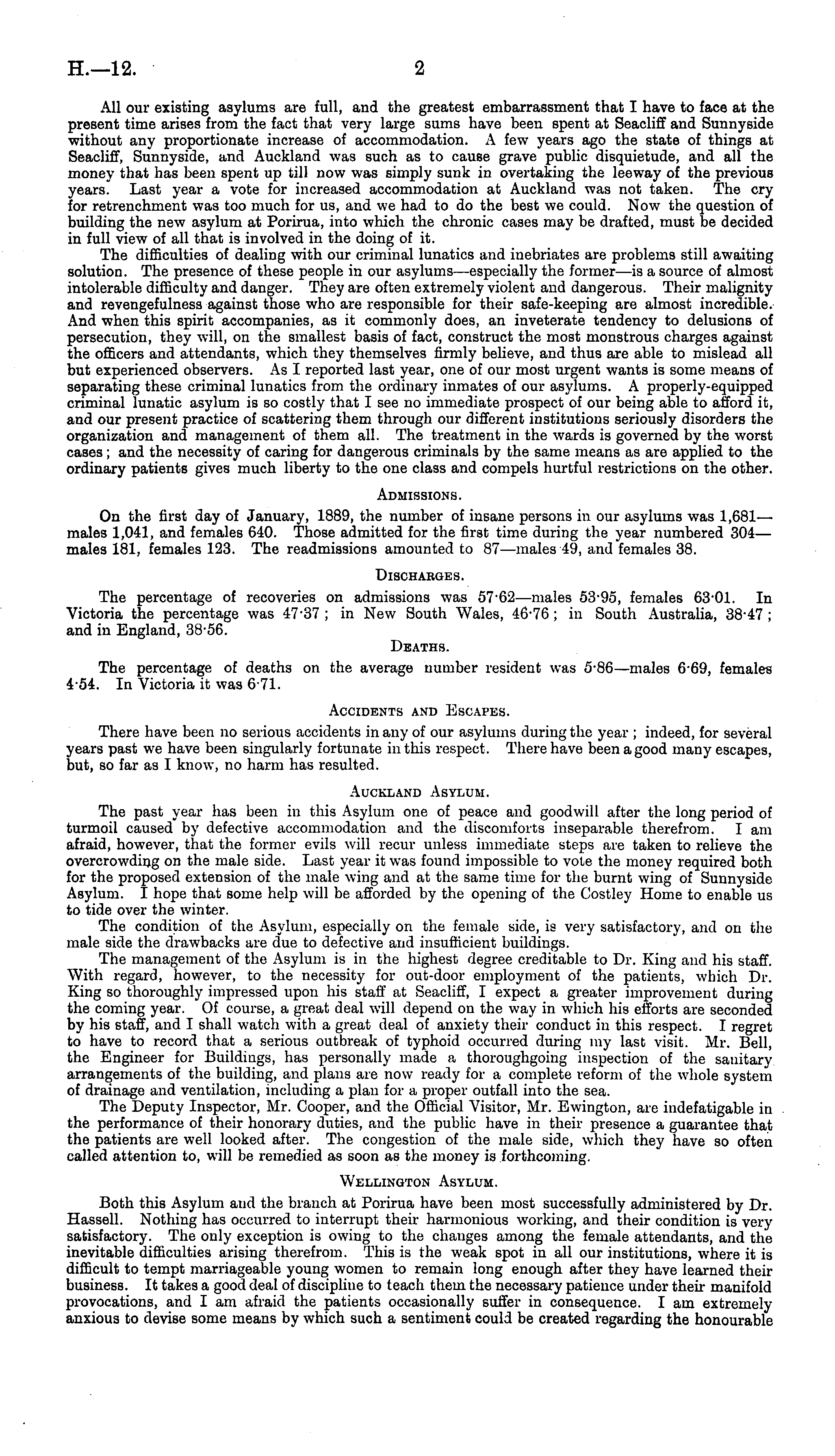 All our existing asylums are full, and the greatest embarrassment that I have to face at the present time arises from the fact that very large sums have been spent at Seacliff and Sunnyside without any proportionate increase of accommodation. A few years ago the state of things at Seacliff, Sunnyside, and Auckland was such as to cause grave public disquietude, and all the money that has been spent up till now was simply sunk in overtaking the leeway of the previous years. Last year a vote for increased accommodation at Auckland was not taken. The cry for retrenchment was too much for us, and we had to do the best we could. Now the question of building the new asylum at Porirua, into which the chronic cases may be drafted, must be decided in full view of all that is involved in the doing of it. The difficulties of dealing with our criminal lunatics and inebriates are problems still awaiting solution. The presence of these people in our asylums—especially the former—is a source of almost intolerable difficulty and danger. They are often extremely violent and dangerous. Their malignity and revengefulness against those who are responsible for their safe-keeping are almost incredible. And when this spirit accompanies, as it commonly does, an inveterate tendency to delusions of persecution, they will, on the smallest basis of fact, construct the most monstrous charges against the officers and attendants, which they themselves firmly believe, and thus are able to mislead all but experienced observers. As I reported last year, one of our most urgent wants is some means of separating these criminal lunatics from the ordinary inmates of our asylums. A properly-equipped criminal lunatic asylum is so costly that I see no immediate prospect of our being able to afford it, and our present practice of scattering them through our different institutions seriously disorders the organization and management of them all. The treatment in the wards is governed by the worst cases; and the necessity of caring for dangerous criminals by the same means as are applied to the ordinary patients gives much liberty to the one class and compels hurtful restrictions on the other. Admissions. On the first day of January, 1889, the number of insane persons in our asylums was 1,681 — males 1,041, and females 640. Those admitted for the first time during the year numbered 304— males 181, females 123. The readmissions amounted to 87—males 49, and females 38. Discharges. The percentage of recoveries on admissions was 5762—males 53-95, females 63-01. In Victoria the percentage was 47-37 ; in New South Wales, 46-76; in South Australia, 38-47 ; and in England, 38-56. Deaths. The percentage of deaths on the average number resident was 5-86—males 6-69, females 4-54. In Victoria it was 671. Accidents and Escapes. There have been no serious accidents in any of our asylums during the year ; indeed, for several years past we have been singularly fortunate in this respect. There have been a good many escapes, but, so far as I know, no harm has resulted. Auckland Asylum. The past year has been in this Asylum one of peace and goodwill after the long period of turmoil caused by defective accommodation and the discomforts inseparable therefrom. lam afraid, however, that the former evils will recur unless immediate steps are taken to relieve the overcrowding on the male side. Last year it was found impossible to vote the money required both for the proposed extension of the male wing and at the same time for the burnt wing of Sunnyside Asylum. I hope that some help will be afforded by the opening of the Costley Home to enable us to tide over the winter. The condition of the Asylum, especially on the female side, is very satisfactory, and on the male side the drawbacks are due to defective and insufficient buildings. The management of the Asylum is in the highest degree creditable to Dr. King and his staff. With regard, however, to the necessity for out-door employment of the patients, which Dr. King so thoroughly impressed upon his staff at Seacliff, I expect a greater improvement during the coming year. Of course, a great deal will depend on the way in which his efforts are seconded by his staff, and I shall watch with a great deal of anxiety their conduct in this respect. I regret to have to record that a serious outbreak of typhoid occurred during my last visit. Mr. Bell, the Engineer for Buildings, has personally made a thoroughgoing inspection of the sanitary arrangements of the building, and plans are now ready for a complete reform of the whole system of drainage and ventilation, including a plan for a proper outfall into the sea. The Deputy Inspector, Mr. Cooper, and the Official Visitor, Mr. Ewington, are indefatigable in the performance of their honorary duties, and the public have in their presence a guarantee that the patients are well looked after. The congestion of the male side, which they have so often called attention to, will be remedied as soon as the money is forthcoming. Wellington Asylum. Both this Asylum and the branch at Porirua have been most successfully administered by Dr. Hassell. Nothing has occurred to interrupt their harmonious working, and their condition is very satisfactory. The only exception is owing to the changes among the female attendants, and the inevitable difficulties arising therefrom. This is the weak spot in all our institutions, where it is difficult to tempt marriageable young women to remain long enough after they have learned their business. It takes a good deal of discipline to teach them the necessary patience under their manifold provocations, and I am afraid the patients occasionally suffer in consequence. lam extremely anxious to devise some means by which such a sentiment could be created regarding the honourable