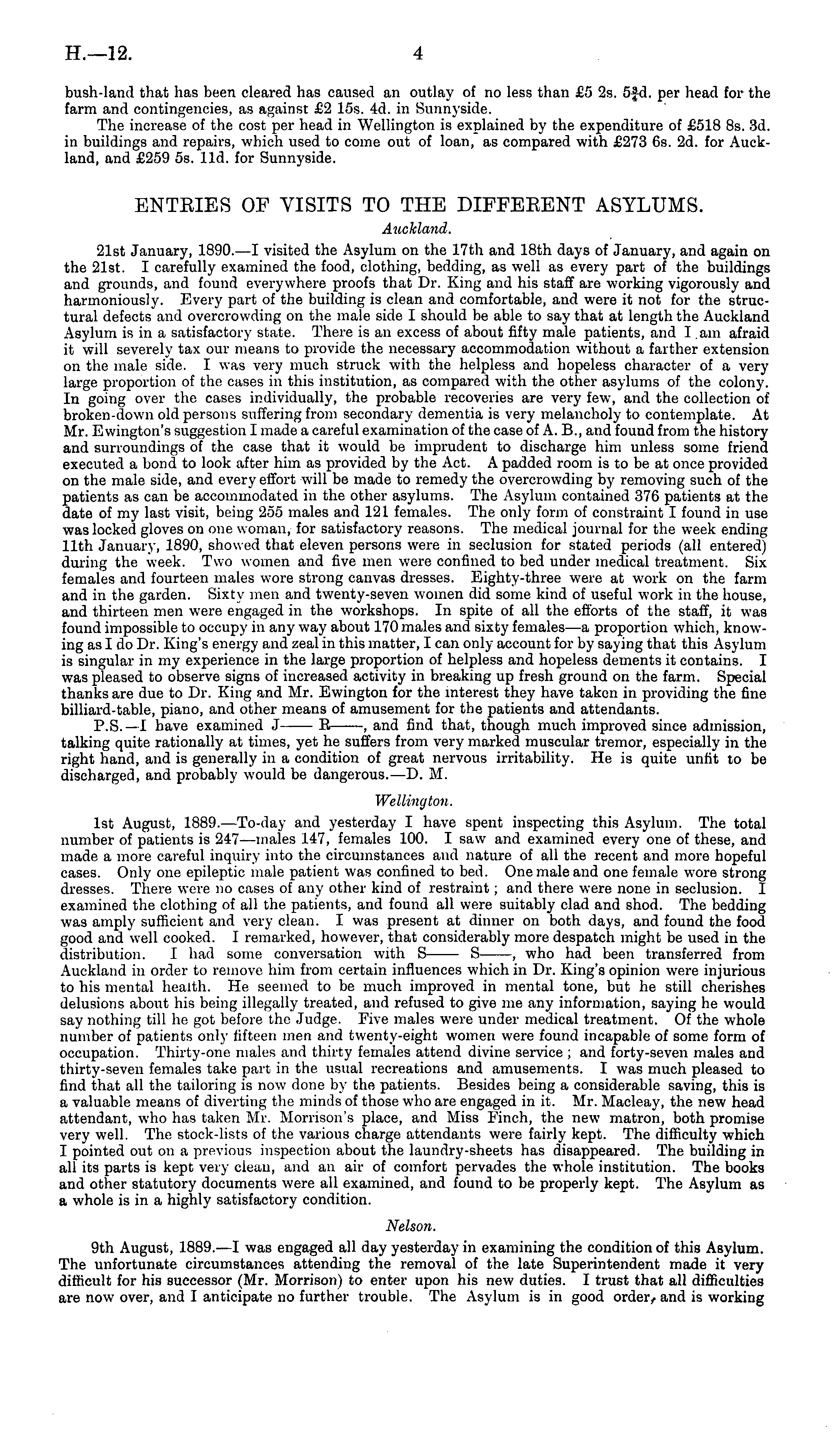 bush-land that has been cleared has caused an outlay of no less than £5 2s. sfd. per head for the farm and contingencies, as against £2 15s. 4d. in Sunnyside. The increase of the cost per head in Wellington is explained by the expenditure of £518 Bs. 3d. in buildings and repairs, which used to come out of loan, as compared with £273 6s. 2d. for Auckland, and £259 ss. lid. for Sunnyside. ENTEIES OF VISITS TO THE DIFFEEENT ASYLUMS. Auckland. 21st January, 1890.—1 visited the Asylum on the 17th and 18th days of January, and again on the 21st. I carefully examined the food, clothing, bedding, as well as every part of the buildings and grounds, and found everywhere proofs that Dr. King and his staff are working vigorously and harmoniously. Every part of the building is clean and comfortable, and were it not for the structural defects and overcrowding on the male side I should be able to say that at length the Auckland Asylum is in a satisfactory state. There is an excess of about fifty male patients, and I am afraid it will severely tax our means to provide the necessary accommodation without a farther extension on the male side. I was very much struck with the helpless and hopeless character of a very large proportion of tho cases in this institution, as compared with the other asylums of the colony. In going over the cases individually, the probable recoveries are very few, and the collection of broken-down old persons suffering from secondary dementia is very melancholy to contemplate. At Mr. Ewington's suggestion I made a careful examination of the case of A. 8., and found from the history and surroundings of the case that it would be imprudent to discharge him unless some friend executed a bond to look after him as provided by the Act. A padded room is to be at once provided on the male side, and every effort will be made to remedy the overcrowding by removing such of the patients as can be accommodated in the other asylums. The Asylum contained 376 patients at the date of my last visit, being 255 males and 121 females. The only form of constraint I found in use was locked gloves on one woman, for satisfactory reasons. The medical journal for the week ending 11th January, 1890, showed that eleven persons were in seclusion for stated periods (all entered) during the week. Two women and five men were confined to bed under medical treatment. Six females and fourteen males wore strong canvas dresses. Eighty-three were at work on the farm and in the garden. Sixty men and twenty-seven women did some kind of useful work in the house, and thirteen men were engaged in the workshops. In spite of all the efforts of the staff, it was found impossible to occupy in any way about 170 males and sixty females—a proportion which, knowing as I do Dr. King's energy and zeal in this matter, I can only account for by saying that this Asylum is singular in my experience in the large proportion of helpless and hopeless dements it contains. I was pleased to observe signs of increased activity in breaking up fresh ground on the farm. Special thanks are due to Dr. King and Mr. Ewington for the interest they have taken in providing the fine billiard-table, piano, and other means of amusement for the patients and attendants. P.S. — I have examined J R , and find that, though much improved since admission, talking quite rationally at times, yet he suffers from very marked muscular tremor, especially in the right hand, and is generally in a condition of great nervous irritability. He is quite unfit to be discharged, and probably would be dangerous. —D. M. Wellington. Ist August, 1889. —To-day and yesterday I have spent inspecting this Asylum. The total number of patients is 247 —males 147, females 100. I saw and examined every one of these, and made a more careful inquiry into the circumstances and nature of all the recent and more hopeful cases. Only one epileptic male patient was confined to bed. One male and one female wore strong dresses. There were no cases of any other kind of restraint ; and there were none in seclusion. I examined the clothing of all the patients, and found all were suitably clad and shod. The bedding was amply sufficient and very clean. I was present at dinner on both days, and found the food good and well cooked. I remarked, however, that considerably more despatch might be used in the distribution. I had some conversation with S S , who had been transferred from Auckland in order to remove him from certain influences which in Dr. King's opinion were injurious to his mental health. He seemed to be much improved in mental tone, but he still cherishes delusions about his being illegally treated, and refused to give me any information, saying he would say nothing till he got before the Judge. Five males were under medical treatment. Of the whole number of patients only fifteen men and twenty-eight women were found incapable of some form of occupation. Thirty-one males and thirty females attend divine service ; and forty-seven males and thirty-seven females take part in the usual recreations and amusements. I was much pleased to find that all the tailoring is now done by the patients. Besides being a considerable saving, this is a valuable means of diverting the minds of those who are engaged in it. Mr. Macleay, the new head attendant, who has taken Mr. Morrison's place, and Miss Finch, the new matron, both promise very well. The stock-lists of the various charge attendants were fairly kept. The difficulty which I pointed out on a previous inspection about the laundry-sheets has disappeared. The building in all its parts is kept very clean, and an air of comfort pervades the whole institution. The books and other statutory documents were all examined, and found to be properly kept. The Asylum as a whole is in a highly satisfactory condition. Nelson. 9th August, 1889.—1 was engaged all day yesterday in examining the condition of this Asylum. The unfortunate circumstances attend