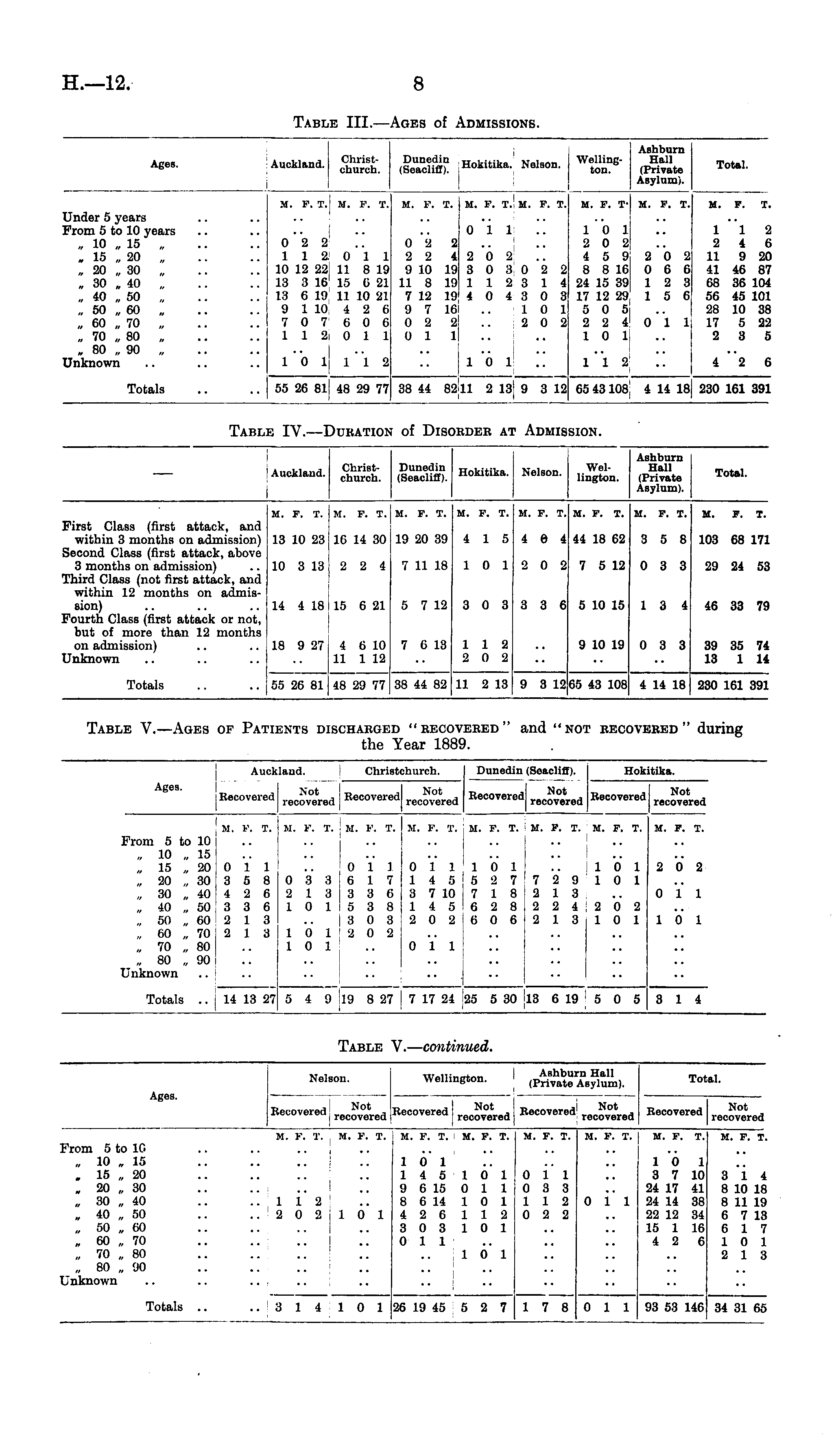 Aucklaud. Christchurch. Dunedin (Seacliff). Hokitika. Nelson. Wellington. Ashburn Hall (Private Asylum). Total. First Glass (first attack, and within 3 months on admission) Second Class (first attack, above 3 months on admission) Third Class (not first attack, and within 12 months on admission) Fourth Class (first attack or not, but of more than 12 months on admission) Unknown M. P. T. M. P. T. M. P. T. M. P. T. M. F. T. M. P. T. M. P. T. M. F. T. 13 10 23 1C 14 30 19 20 39 4 15 4 6 4 44 18 62 3 5 8 103 68 171 10 3 13 2 2 4 7 11 18 10 1 2 0 2 7 5 12 0 3 3 29 24 53 14 4 18 15 6 21 5 7 12 3 0 3 3 3 6 5 10 15 13 4 46 33 79 18 9 27 4 6 10 11 1 12 7 6 13 112 2 0 2 9 10 19 0 3 3 39 35 74 13 1 11 Totals 38 44 82 11 2 13 9 3 12 65 43 101 4 14 18 55 2C 81 48 29 77 230 161 391