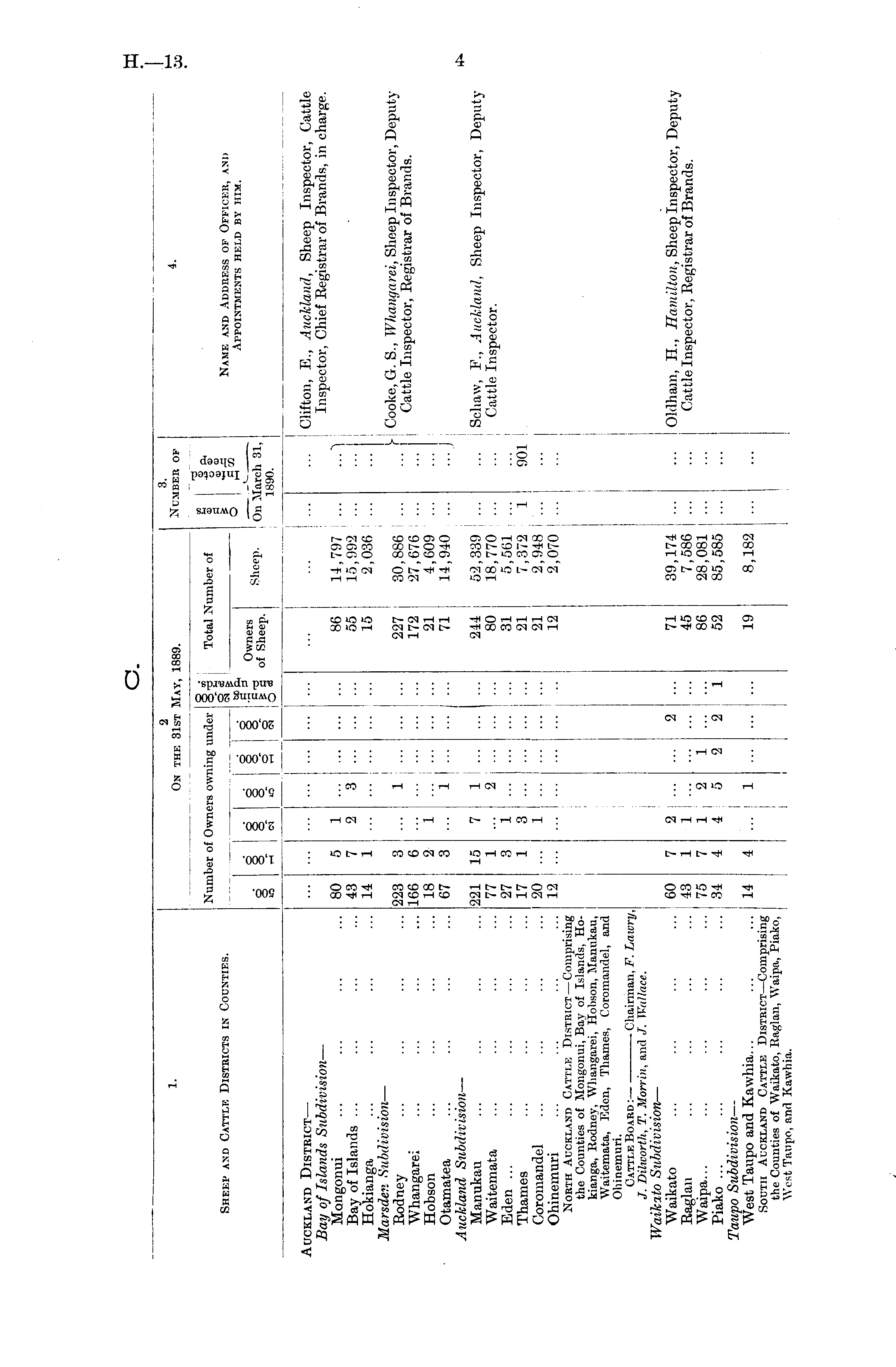 1. 2 On the 31st May, 1889. Nun 3. BER OP 4. Sheep and Cattle Districts in Counties. Nui >er of i Owni ire owning I- s mder § 4 Total Number of f! of'snTp. *>-P. 2 5 [arch 31, 890. Name and Address of Officer, and Appointments held by him. 8 γ-h" of ?; On } Auckland District — Bay of Islands Subdivision — Mongonui Bay of Islands ... Hokianga Marsdev. Subdivision — Eodney "Whangarei Hobson Otamatea Auckland Subdivision — Manukau Waitemata Eden ... Thames Coromandel Ohinemuri North Auckland Cattle District — Comprising the Counties of Mongonui, Bay of Islands, Hokianga, Rodney, Whangavei, Hobson, Manukau, Waitemata, Eden, Thames, Coromandel, and Ohinemuri. Cattle Board : Chairman, F. Lα wry, J. Dilworth, T. Motrin, and •/. Wallace. Waikito Subdivision — Waikato Eaglan Waipa... Piako ... Taupo Subdivision — West Taupo and Kawhia... South Auckland Cattle District —Comprising the Counties of Waikato, Raglan, Waipa, Piako, West Tanpo, and Kawhia. 80 43 14 223 166 18 67 221 77 27 17 20 12 5 7 1 3 6 2 3 15 1 3 1 1 2 1 2 i 1 7 1 3 1 7 3 ... ... 1 ... 1 ... 1 ... 2 ... ... ... 86 55 15 227 172 21 71 244 80 31 21 21 12 14,797 ... 15,992 ... 2,036 i ... 30,886 ... 27,676 ... 4,609 ... 14,940 ... 52,339 ... 18,770 ... 5,561 ... 7,372 L 2,94-S ... 2,070 ... Clifton, E., Auckland, Sheep Inspector, Cattle Inspector, Chief Eegistrarof Brands, in charge. =1 J-| Cooke, G. S., Whangarei, Sheep Inspector, Deputy Cattle Inspector, Eegistrar of Brands. ■■■I Schaw, F., Auckland, Sheep Inspector, Deputy Cattle Inspector. 901 Oldham, II., Hamilton, Sheep Inspector, Deputy Cattle Inspector, Eegistrar of Brands. CO u>, 75 34 7 7 4 2 ... 1 ... 1 2 4 ! 5 1 2 2 71 45 86 39,174 7,586 28,081 85,585 2 i 1J 4 ... I 1 19 8,182 ;