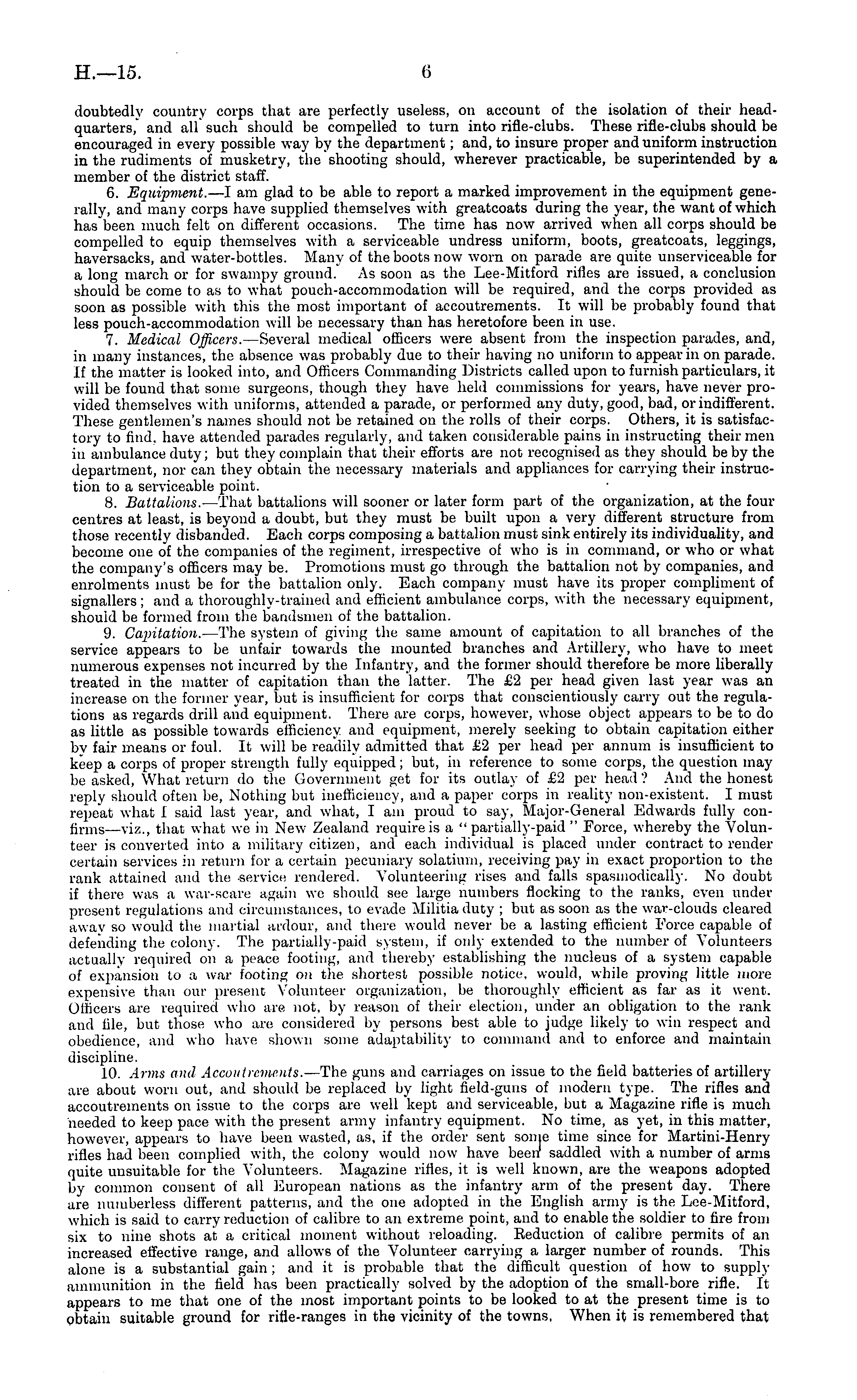 doubtedly country corps that are perfectly useless, on account of the isolation of their headquarters, and all such should be compelled to turn into rifle-clubs. These rifle-clubs should be encouraged in every possible way by the department ; and, to insure proper and uniform instruction in the rudiments of musketry, the shooting should, wherever practicable, be superintended by a member of the district staff. 6. Equipment. —l am glad to be able to report a marked improvement in the equipment generally, and many corps have supplied themselves with greatcoats during the year, the want of which has "been much felt on different occasions. The time has now arrived when all corps should be compelled to equip themselves with a serviceable undress uniform, boots, greatcoats, leggings, haversacks, and water-bottles. Many of the boots now worn on parade are quite unserviceable for a long march or for swampy ground. As soon as the Lee-Mitford rifles are issued, a conclusion should be come to as to what pouch-accommodation will be required, and the corps provided as soon as possible with this the most important of accoutrements. It will be probably found that less pouch-accommodation will be necessary than has heretofore been in use. 7. Medical Officers. —Several medical officers were absent from the inspection parades, and, in many instances, the absence was probably due to their having no uniform to appear in on parade. If the matter is looked into, and Officers Commanding Districts called upon to furnish particulars, it will be found that some surgeons, though they have held commissions for years, have never provided themselves with uniforms, attended a parade, or performed any duty, good, bad, or indifferent. These gentlemen's names should not be retained on the rolls of their corps. Others, it is satisfactory to find, have attended parades regularly, and taken considerable pains in instructing their men in ambulance duty; but they complain that their efforts are not recognised as they should be by the department, nor can they obtain the necessary materials and appliances for carrying their instruction to a serviceable point. 8. Battalions. —That battalions will sooner or later form part of the organization, at the four centres at least, is beyond a doubt, but they must be built upon a very different structure from those recently disbanded. Each corps composing a battalion must sink entirely its individuality, and become one of the companies of the regiment, irrespective of who is in command, or who or what the company's officers may be. Promotions must go through the battalion not by companies, and enrolments must be for the battalion only. Each company must have its proper compliment of signallers; and a thoroughly-trained and efficient ambulance corps, with the necessary equipment, should be formed from the bandsmen of the battalion. 9. Capitation. —The system of giving the same amount of capitation to all branches of the service appears to be unfair towards the mounted branches and Artillery, who have to meet numerous expenses not incurred by the Infantry, and the former should therefore be more liberally treated in the matter of capitation than the latter. The £2 per head given last year was an increase on the former year, but is insufficient for corps that conscientiously carry out the regulations as regards drill and equipment. There are corps, however, whose object appears to be to do as little as possible towards efficiency and equipment, merely seeking to obtain capitation either by fair means or foul. It will be readily admitted that £2 per head per annum is insufficient to keep a corps of proper strength fully equipped; but, in reference to some corps, the question may be asked. What return do the Government get for its outlay of £2 per head '.' And the honest reply should often be, Nothing but inefficiency, and a paper corps in reality non-existent. I must repeat what I said last year, and what, I am proud to say, Major-General Edwards fully confirms—viz., that what we in New Zealand require is a " partially-paid " Force, whereby the Volunteer is converted into a military citizen, and each individual is placed under contract to render certain services in return for a certain pecuniary solatium, receiving pay in exact proportion to the rank attained and the service rendered. Volunteering rises and falls spasmodically. No doubt if there was a. war-scare again we should see large numbers flocking to the ranks, even under present regulations and circumstances, to evade Militia duty ; but as soon as the war-clouds cleared away so would the martial ardour, and there would never be a lasting efficient Force capable of defending the colony. The partially-paid system, if only extended to the number of Volunteers actually required on a peace looting, and thereby establishing the nucleus of a system capable of expansion to a war footing on the shortest possible notice, would, while proving little more expensive than our present Volunteer organization, be thoroughly efficient as far as it went. Officers are required who are not, by reason of their election, under an obligation to the rank and file, but those who are considered by persons best able to judge likely to win respect and obedience, and who have shown some adaptability to command and to enforce and maintain discipline. 10. Arms and Accoutrements. —The guns and carriages on issue to the field batteries of artilleryare about worn out, and should be replaced by light field-guns of modern type. The rifles and accoutrements on issue to the corps are well kept and serviceable, but a Magazine rifle is much needed to keep pace with the present army infantry equipment. No time, as yet, in this matter, however, appears to have been wasted, as, if the order sent some time since for Martini-Henry rifles had been complied with, the colony would now have been 1 saddled with a number of arms quite unsuitable for the Volunteers. Magaz