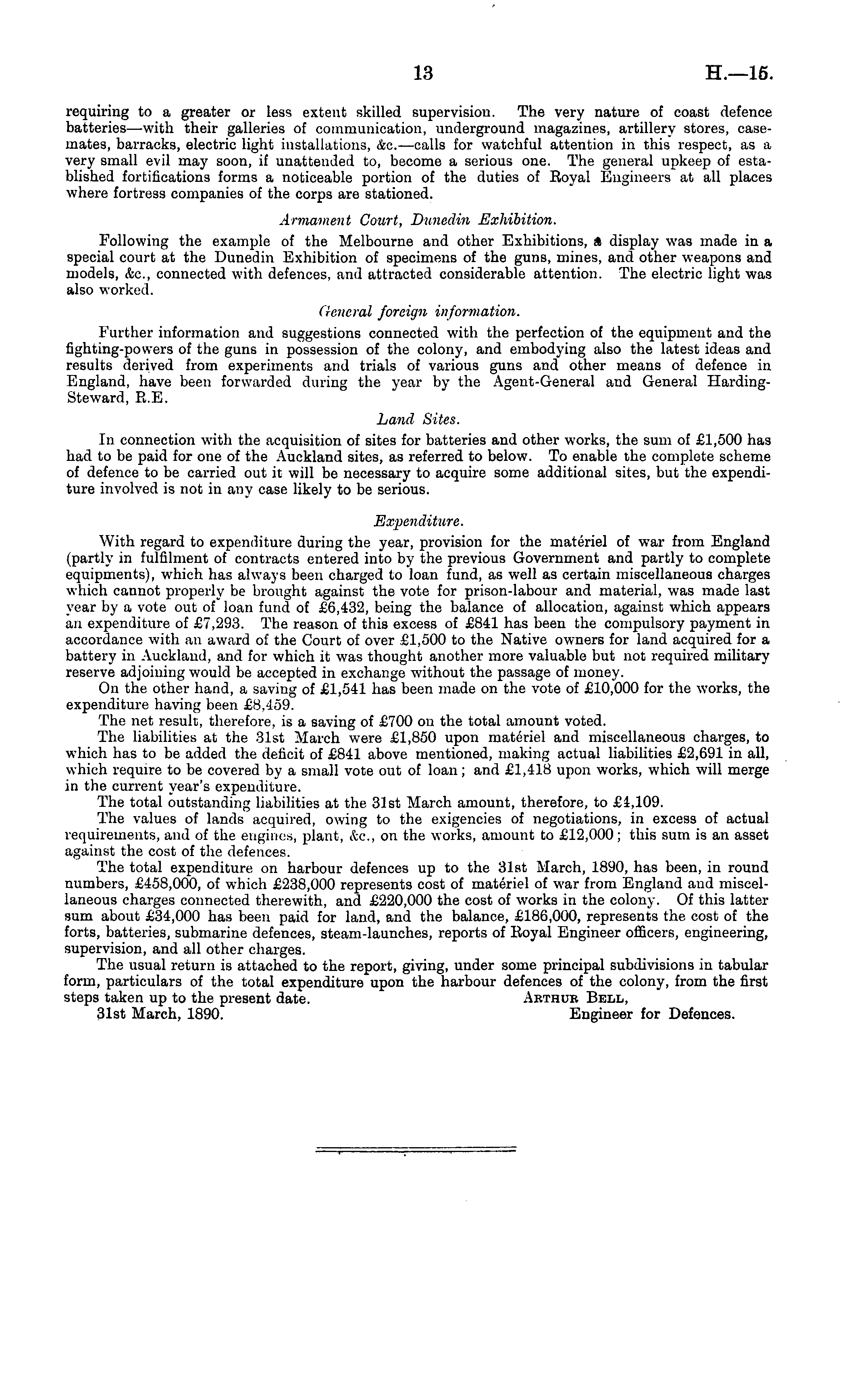 requiring to a greater or less extent skilled supervision. The very nature of coast defence batteries—with their galleries of communication, underground magazines, artillery stores, casemates, barracks, electric light installations, &c.—calls for watchful attention in this respect, as a very small evil may soon, if unattended to, become a serious one. The general upkeep of established fortifications forms a noticeable portion of the duties of Royal Engineers at all places where fortress companies of the corps are stationed. Armament Court, Dunedin Exhibition. Following the example of the Melbourne and other Exhibitions, » display was made in a special court at the Dunedin Exhibition of specimens of the guns, mines, and other weapons and models, &c, connected with defences, and attracted considerable attention. The electric light was also worked. General foreign information. Further information and suggestions connected with the perfection of the equipment and the fighting-powers of the guns in possession of the colony, and embodying also the latest ideas and results derived from experiments and trials of various guns and other means of defence in England, have been forwarded during the year by the Agent-General and General HardingSteward, R.E. Land Sites. In connection with the acquisition of sites for batteries and other works, the sum of £1,500 has had to be paid for one of the Auckland sites, as referred to below. To enable the complete scheme of defence to be carried out it will be necessary to acquire some additional sites, but the expenditure involved is not in any case likely to be serious. Expenditure. With regard to expenditure during the year, provision for the materiel of war from England (partly in fulfilment of contracts entered into by the previous Government and partly to complete equipments), which has always been charged to loan fund, as well as certain miscellaneous charges which caunot properly be brought against the vote for prison-labour and material, was made last year by a vote out of loan fund of £6,432, being the balance of allocation, against which appears an expenditure of £7,293. The reason of this excess of £841 has been the compulsory payment in accordance with an award of the Court of over £1,500 to the Native owners for land acquired for a battery in Auckland, and for which it was thought another more valuable but not required military reserve adjoining would be accepted in exchange without the passage of money. On the other hand, a saving of £1,541 has been made on the vote of £10,000 for the works, the expenditure having been £8,459. The net result, therefore, is a saving of £700 on the total amount voted. The liabilities at the 31st March were £1,850 upon materiel and miscellaneous charges, to which has to be added the deficit of £841 above mentioned, making actual liabilities £2,691 in all, which require to be covered by a small vote out of loan; and £1,418 upon works, which will merge in the current year's expenditure. The total outstanding liabilities at the 31st March amount, therefore, to £4,109. The values of lands acquired, owing to the exigencies of negotiations, in excess of actual requirements, and of the engines, plant, &c, on the works, amount to £12,000; this sum is an asset against the cost of the defences. The total expenditure on harbour defences up to the 31st March, 1890, has been, in round numbers, £458,000, of which £238,000 represents cost of materiel of war from England and miscellaneous charges connected therewith, and £220,000 the cost of works in the colony. Of this latter sum about £34,000 has been paid for land, and the balance, £186,000, represents the cost of the forts, batteries, submarine defences, steam-launches, reports of Royal Engineer officers, engineering, supervision, and all other charges. The usual return is attached to the report, giving, under some principal subdivisions in tabular form, particulars of the total expenditure upon the harbour defences of the colony, from the first steps taken up to the present date. Arthur Bell, 31st March, 1890. Engineer for Defences.