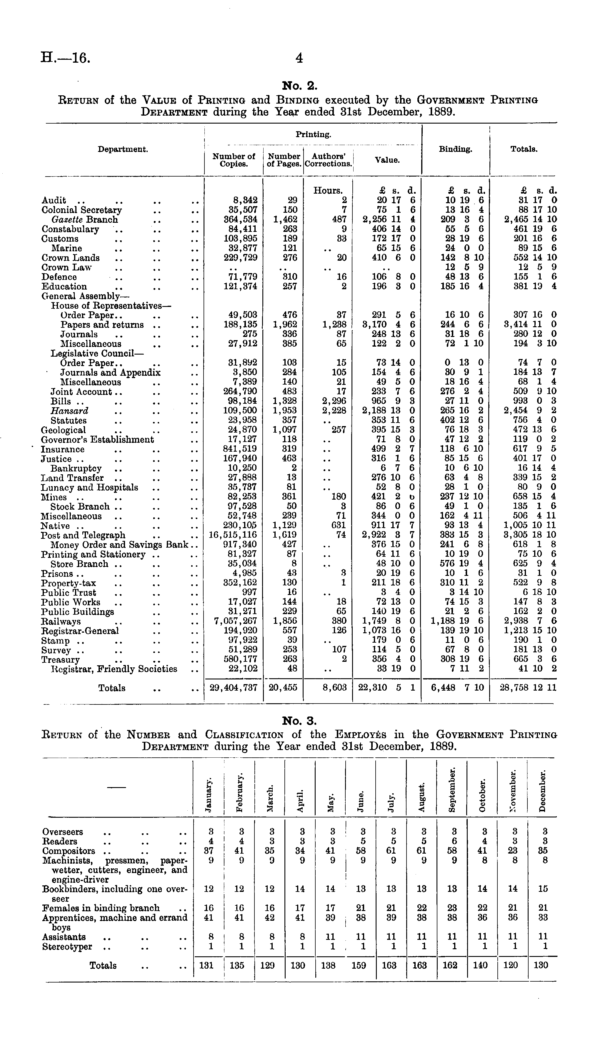 No. 2. Return of the Value of Printing and Binding executed by the Government Printing Department during the Year ended 31st December, 1889.
