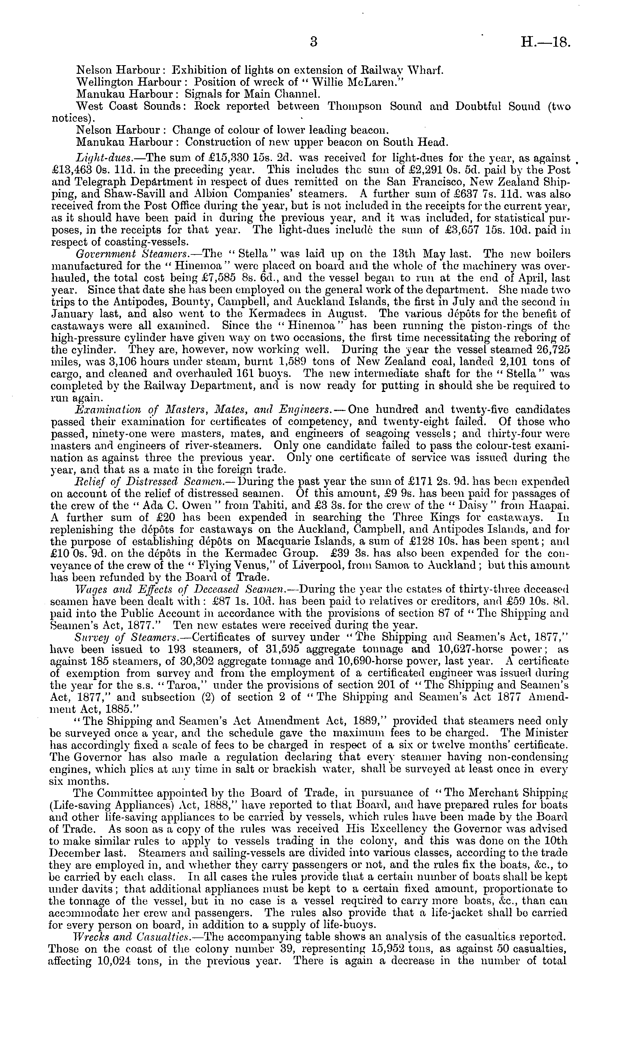 Nelson Harbour: Exhibition of lights on extension of Railway Wharf. Wellington Harbour : Position of wreck of " Willie McLaren." Manukau Harbour : Signals for Main Channel. West Coast Sounds: Hock reported between Thompson Sound and Doubtful Sound (two notices). Nelson Harbour : Change of colour of lower leading beacon. Manukau Harbour : Construction of new upper beacon on South Head. Light-dues. —The sum of £15,330 15s. 2d. was received for light-dues for the year, as against £13,463 os. lid. in the preceding year. This includes the sum of £2,291 os. sd. paid by the Post and Telegraph Department in respect of dues remitted on the San Francisco, New Zealand Shipping, and Shaw-Savill and Albion Companies' steamers. A further sum of .-£637 7s. lid. was also received from the Post Office during the year, but is not included in the receipts for the current year, as it should have been paid in during the previous year, and it was included, for statistical purposes, in the receipts for that year. The light-dues include the sum of £3,657 15s. 10d. paid in respect of coasting-vessels. Government Steamers. —The "Stella" was laid up on the 13th May last. The new boilers manufactured for the " Hineinoa " -were placed on board and the whole of the machinery was overhauled, the total cost being £7,585 Bs. (id., and the vessel began to run at the end of April, last year. Since that date she has been employed on the general work of the department. She made two trips to the Antipodes, Bounty, Campbell, and Auckland Islands, the first in July and the second in January last, and also went to the Kermadecs in August. The various depots for the benefit of castaways were all examined. Since the "Hineinoa" has been running the piston-rings of the high-pressure cylinder have given way on two occasions, the first time necessitating the reboring of the cylinder. They are, however, now working well. During the year the vessel steamed 26,725 miles, was 3,106 hours under steam, burnt 1,589 tons of New Zealand coal, landed 2,101 tons of cargo, and cleaned and overhauled 161 buoys. The new intermediate shaft for the " Stella" was completed by the Eailway Department, and is now ready for putting in should she be required to run again. Examination of Masters, Mates, and Engineers. — One hundred and twenty-five candidates passed their examination for certificates of competency, and twenty-eight failed. Of those who passed, ninety-one were masters, mates, and engineers of seagoing vessels; and thirty-four were masters and engineers of river-steamers. Only one candidate failed to pass the colour-test examination as against three the previous year. Only one certificate of service was issued during the year, and that as a mate; in the foreign trade. Belief of Distressed Seamen. — During the past year the sum of £171 2s. 9d. lias been expended on account of the relief of distressed seamen. Of this amount, £9 9s. has been paid for passages of the crew of the " Ada C. Owen " from Tahiti, and £3 3s. for the crew of the " Daisy " from Haapai. A further sum of £20 has been expended in searching the Three Kings for castaways. In replenishing the depots for castaways on the Auckland, Campbell, and Antipodes Islands, and for the purpose of establishing depots on Macquarie Islands, a sum of £128 10s. has been spent; ami £10 os. 9d. on the depots in the Kermadee Group. £39 3s. has also been expended for the conveyance of the crew of the " Flying Venus," of Liverpool, from Samoa to Auckland ; but this amount has been refunded by the Board of Trade. Wages and Effects of Deceased Seamen. —During the year the estates of thirty-three dccci seamen have been dealt with : £87 Is. l()d. has been paid to relatives or creditors, and £59 10s. Bd. paid into the Public Account in accordance with the provisions of section 87 of "The Shipping and Seamen's Act, 1877." Ten new estates were received during the year. Survey of Steamers. —Certificates of survey under " The Shipping and Seamen's Act, 1877," have been issued to 193 steamers, of 31,595 aggregate tonnage and 10,627-horse power: as against 185 steamers, of 30,302 aggregate tonnage and 10,690-horse power, last year. A certificate of exemption from survey and from the employment of a certificated engineer was issued during the year for the s.s. "Taroa," under the provisions of section 201 of "The Shipping and Seamen's Act, 1877," and subsection (2) of section 2 of "The Shipping and Seamen's Act LS77 Amendment Act, 1885." " The Shipping and Seamen's Act Amendment Act, 1889," provided that steamers need only be surveyed once a year, and the schedule gave the maximum fees to be charged. The Minister has accordingly fixed a scale of fees to be charged in respect of a six or twelve months' certificate. The Governor has also made a regulation declaring that every steamer having non-condensing engines, which plies at any time in salt or brackish water, shall be surveyed at least once in everj six months. The Committee appointed by tlie Board of Trade, in pursuance of " The Merchant Shipping (Life-saving Appliances) Act, 1888," have reported to that Board, and have prepared rules for boats and other life-saving appliances to be carried by vessels, which rules have been made by the Board of Trade. As soon as a copy of the rules was received His Excellency the Governor was advised to make similar rules to apply to vessels trading in the colony, and this was done on the 10th December last. Steamers mid sailing-vessels are divided into various classes, according to the trade they are employed in, and whether they carry passengers or not, and the rules fix the boats, &c, to be carried by each class. In all cases the rules provide that a certain number of boats shall be kept under davits; that additional appliances must be kept to a certain fixed amount, proportionate to the tonnage of the vessel, but in no case is a vessel required to carry more boats, &c, than can accommodate her 