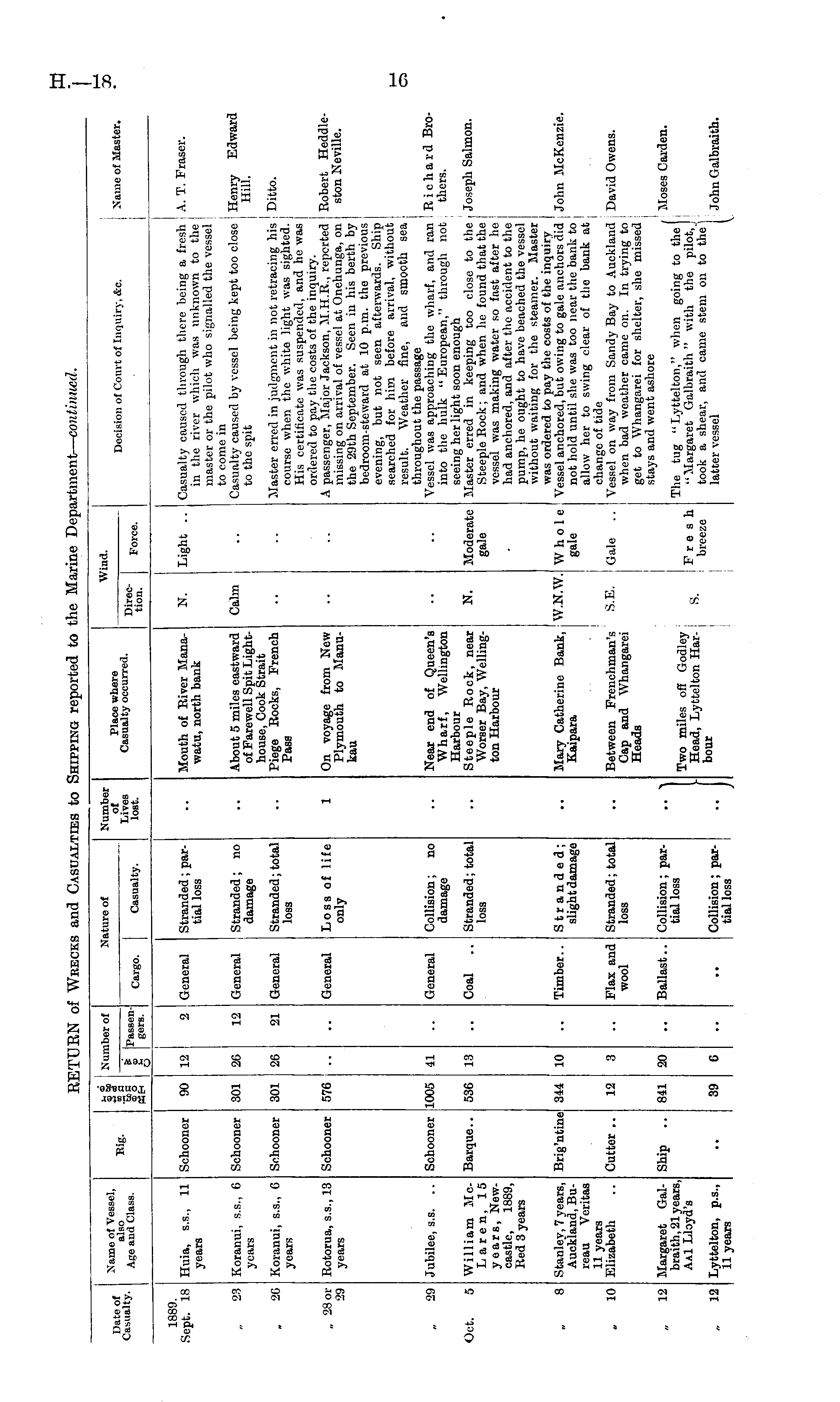 Date of Casualty. Name of Vessel, also Age and Class. tH «> Number of ,ture of Number of Lives lost. Place where Casualty occurred. Direction. Wind. Decision of Court of Inquiry, &c. Name of Master. ■ 33 - tcai o KtH Cr PasBengers. Cargo. Casualty. Force. 1889. Sept. 18 Huia, s.s., 11 years Schooner 12 2 General Stranded; partial loss Slouth of River Slanawatu, north bank N. Light .. Casualty caused through there being a fresh A. T. Frascr. in the river which was unknown to the master or the pilot who signalled the vessel to come in Casualty caused by vessel being kept too close Henry Edward to the spit Hill. 23 Koranui, s.s., 6 Schooner 301 26 12 General Stranded; no damage About 5 miles eastward of Farewell Spit Lighthouse, Cook Strait Piege Rocks, French Pass Calm years , 26 Koranui, s.s., 6 years Schooner 301 21 General Stranded; total loss Slaster erred in judgment in not retracing his Ditto. course when the white light was sighted. His certificate was suspended, and he was ordered to pay the costs of the inquiry. A passenger, Major Jackson, SI.H.R., reported Robert Heddlemissing on arrival of vessel at Onehunga, on ston Neville. the 29th September. Seen in his berth by bedroom-steward at 10 p.m. the previous evening, but not seen afterwards. Ship searched for him before arrival, without result. Weather fine, and smooth sea throughout the passage Vessel was approaching tho wharf, and ran Richard Brointo the hulk " European," through not thers. seeing her light soon enough Slaster erred in keeping too close to the Joseph Salmon. Steeple Rock; and when he found that the vessel was making water so fast after he had anchored, and after the accident to the pump, he ought to have beached the vessel without waiting for the steamer. Slaster was ordered to pay the costs of the inquiry Vessel anchored, but owing to gale anchors did John SIcKenzie. not hold until she was too near the bank to allow her to swing clear of the bank at change of tide Vessel on way from Sandy Bay to Auckland David Owens. when bad weather came on. In trying to get to Whangarei for shelter, she missed stays and went ashore Sloses Garden. The tug "Lyttelton," when going to the "Slargaret Galbraith " with the pilot, took a shear, and came stem on to the latter vessel John Galbraith. 26 „ 28 or 29 Rotorua, s.s., 13 years Schooner General Loss of life only 1 On voyage from New Plymouth to Slanukau 576 29 Jubilee, s.s. .. Near end of Queen's Wharf, Wellington Harbour Steeple Rock, near Worser Bay, Wellington Harbour Schooner 1005 II General Collision; no damage Oct. 5 William Sic L a r e n, 15 years, Newcastle, 1889, Red 3 years Barque.. 536 13 Coal .. Stranded; total loss N. Sloderate gale 8 Stanley, 7 years, Auckland, Bureau Veritas 11 years Elizabeth Stranded; slight damage Slary Catherine Bank, Kaipara Whole gale Brig'ntine 344 10 Timber.. •. W.N.W. 10 Cutter .. 12 Flax and wool Stranded; total loss Between Frenchman's Cap and Whangarei Heads S.E. Gale 12 Margaret Galbraith, 21 years, AaI Lloyd's Ship .. 841 20 Ballast.. Collision; partial loss .. S - J Two miles off Godley Head, Lyttelton Harbour . 12 Collision; partial loss S. Fresh breeze Lyttelton, p.s., 11 years 89 I