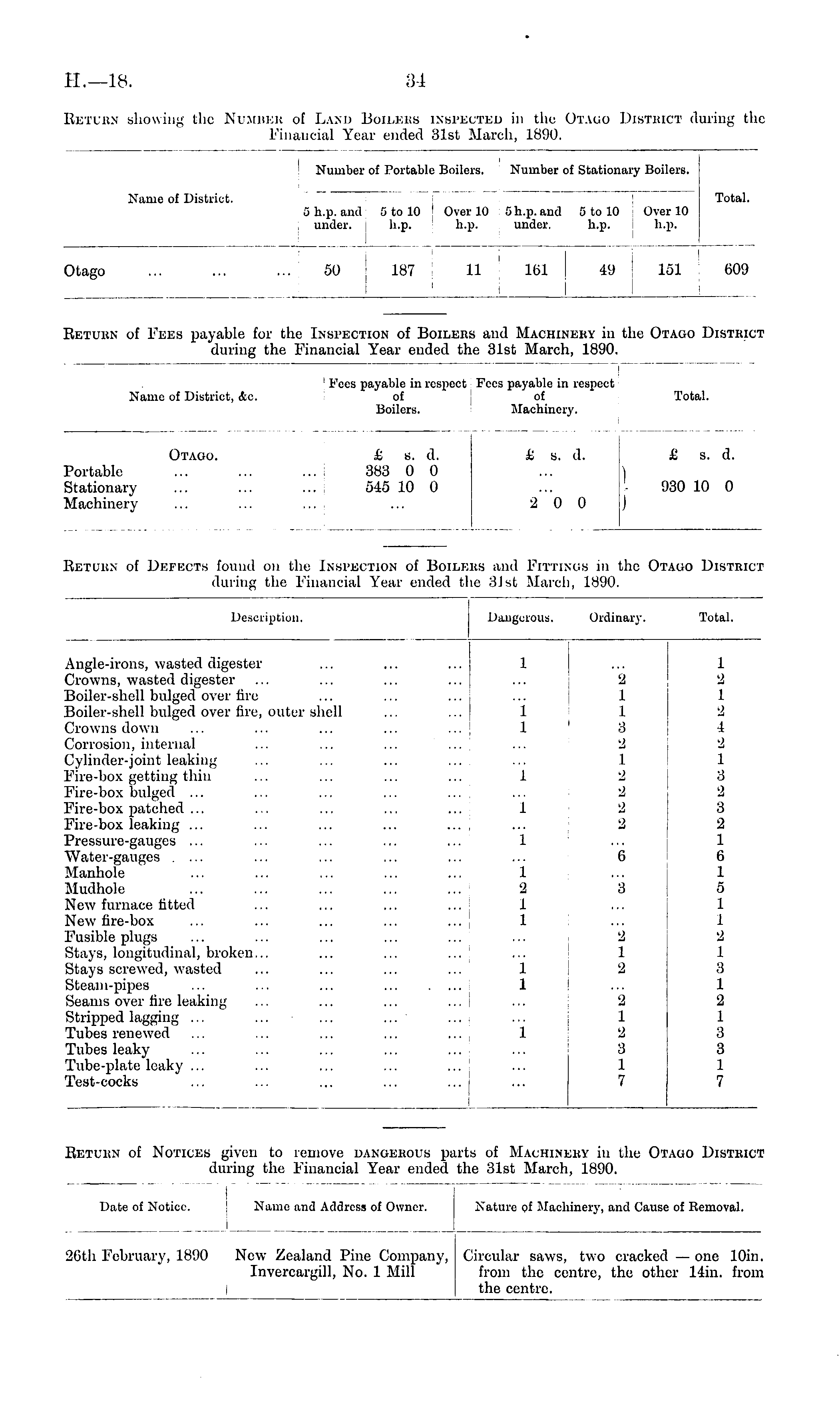 Date of Notice. Name and Address of Owner. Nature of Machinery, and Cause of Removal. 16th February, 1890 I New Zealand Pine Company, Circular saws, two cracked — one lOin. Invercargill, No. 1 Mill from the centre, the other 14in. from the centre.