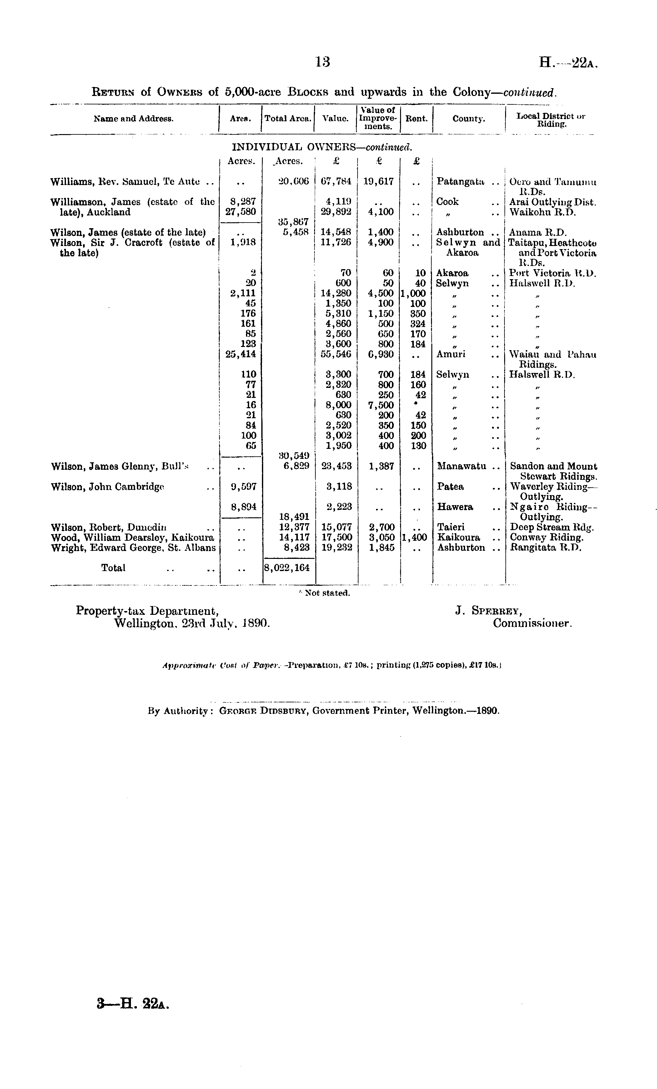 Property-tax Department, J. Spf.rbey, Wellington. 23rd July. 1890. Commissioner. Approximate OoU ol Paper. -Preparation, £7108.; printing(l,B7s copies), Jß3 10b.]