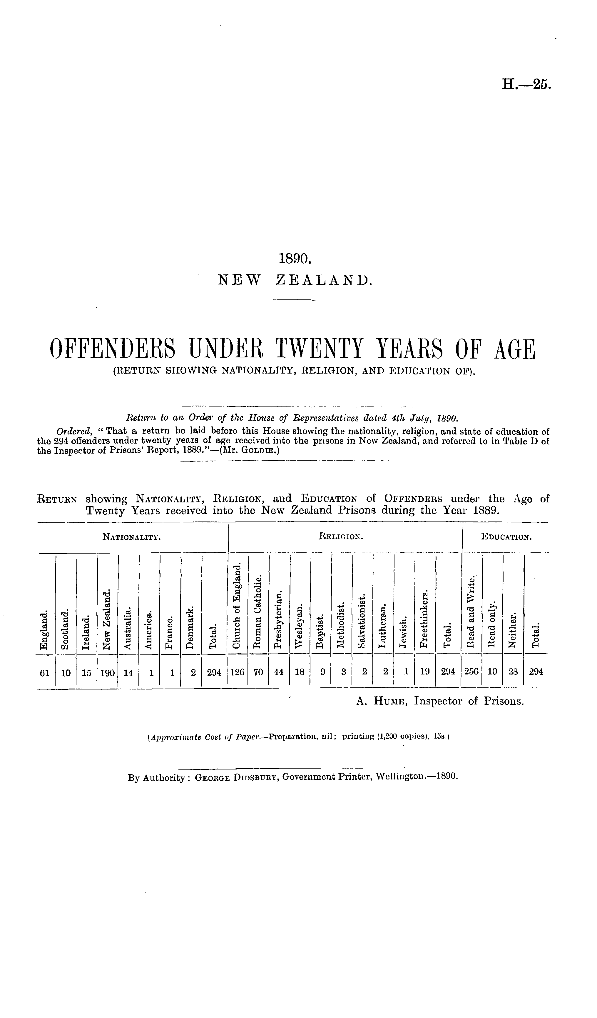 Return to an Order of the House of Representatives dated Ith. July, 1890. Ordered, " That a return bo laid beforo this House showing the nationality, religion, and state of education of the 294 offenders under twenty years of age received into the prisons in Now Zealand, and referred to in Table I) of the Inspector of Prisons' Keport, 1889."—(Mr. Goldie.)