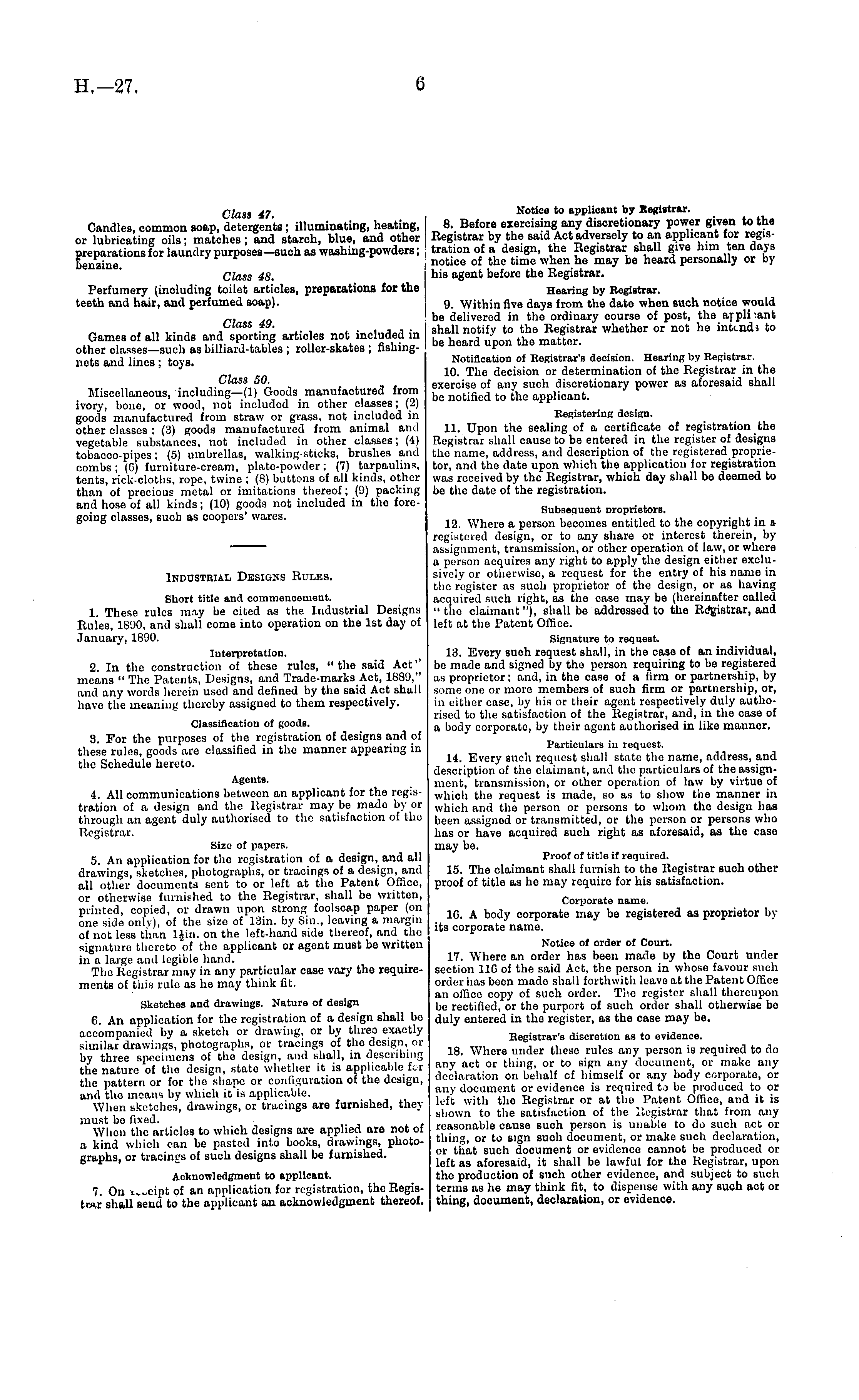 Industrial Designs Rules. Short title and commencement. 1. These rules may be cited as the Industrial Designs Rules, 1890, and shall come into operation on the Ist day of January, 1890. Interpretation. 2. In the construction of these rules, "the said Act ,, means " The Patents, Designs, and Trade-marks Act, 1889," and any words heroin used and defined by the said Act shall have the meaning thereby assigned to them respectively. Classification of goods. 3. For the purposes of the registration of designs and of these rules, goods are classified in the manner appearing in the Schedule hereto. Agents. 4. All communications between an applicant for the registration of a design and the Registrar may be mado by or through an agent duly authorised to the satisfaction of the Registrar. Size of papers. 5. An application for tho registration of a design, and all drawings, sketches, photographs, or tracings of a design, and all other documents sent to or left at tho Patont Office, or otherwise furnished to the Registrar, shall be written, printed, copied, or drawn upon strong foolscap paper (on one side only), of the size of ISin. by Sin., leaving a margin of not less than ljin. on the left-hand side thereof, and the signature thereto "of the applicant or agent must be written in n large and legible hand. The Registrar may in any particular case vary the requirements of this rule as he may think fit. Sketches and drawings. Nature of design 6. An application for the registration of a design shall be accompanied by a sketch or drawing, or by threo exactly similar drawings, photographs, or tracings of the design, or by three specimens of the design, and shall, in describing the nature of the design, state whether it is applicable for the pattern or for the shape or configuration of the design, and the means by which it is applicable. When sketches, drawings, or tracings are furnished, they must be fixed. When tho articles to which designs are applied are not of a kind which can be pasted into books, drawings, photographs, or tracing's of such designs shall be furnished. Acknowledgment to applicant. 7. On of an application for registration, tho Registrar shall send to the applicant an acknowledgment thereof.