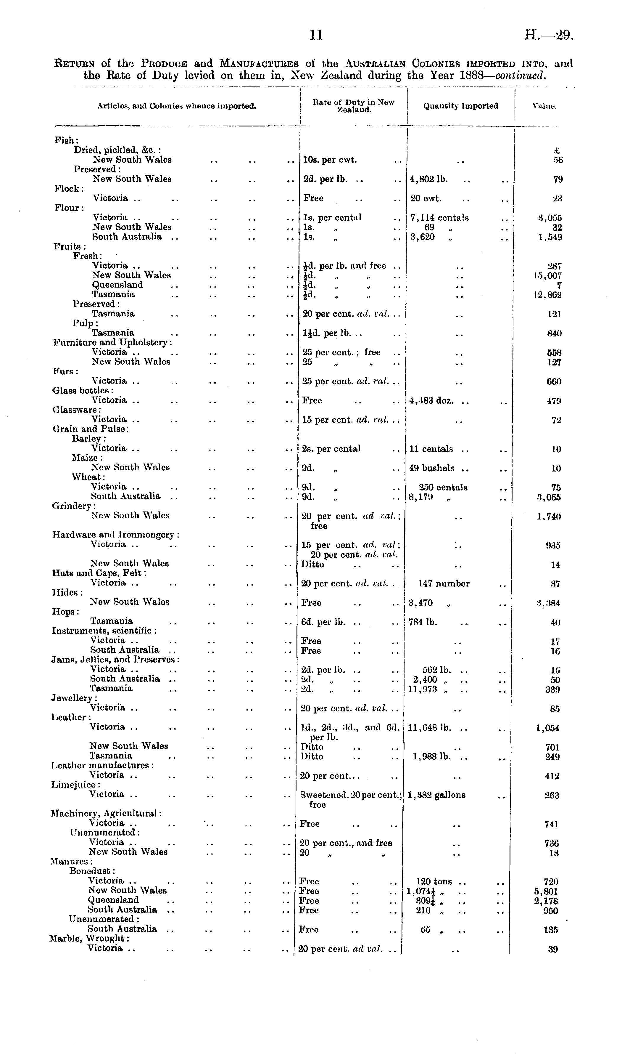 Articles, and Colonies whence imported. Rate <if Duly In New Zealand. Quantity Imported Value. Fish : Dried, pickled, &c. : New South Wales Preserved: New South Wales 10s. per ewt. e 56 2d. per lb. .. 4,8021b. .. 79 Flock: Victoria Free 20 cwt. 23 Flour: Is. per cental Is. Is. Victoria New South Wales South Australia .. 7,114 centals 69 , 3,620 „ 8,056 32 1.549 Fruits : Fresh: Victoria New South Wales Queensland Tasmania Preserved: Tasmania Pulp: Tasmania Furniture and Upholstery: Victoria New South Wales *d. per lb. and free .. id id. „ „ .. id. „ 287 15,007 7 12.862 20 per cent. ad. val, .. 121 lid. per lb. 840 25 per cent. ; free 25 „ „ 558 127 Furs : Victoria .. <ilass bottles: Victoria Glassware: Victoria Grain and Pulse: Barley : Victoria Maize : New South Wales Wheat: Victoria South Australia .. 25 per cent. ad. val. . . 660 Free ' 1.183 doz. .. 479 15 per cent. ad. va I. .. 72 2s. per cental 11 centals .. 10 9d. 49 bushels .. 10 9d. 9d. 250 centals 8,179 „ 75 ■1,065 Grindery: New South Wales 20 per cent, ad val. ; free 1.740 Hardwaro and Ironmongery : Victoria 16 per cent. ad. val ; 20 pur cent. ad. val. Ditto 935 New South Wales Hats and (Japs, Felt: Victoria 14 20 per cent. ad. v 147 number 37 Hides : Now South Wales Free 3,470 „ :l.:IS4 Hops: Tasmania Instruments, scientific : Victoria South Australia Jams, Jellies, and Preserves : Victoria South Australia Tasmania Jewellery: Victoria Leather: Victoria 6d. per lb. Free Free 2d. per lb. .. 2d 2d 784 lb. 562 lb. .. 2,400 „ .. 11,978 ., .. 40 17 16 16 50 339 20 per cent. ml. val. .. 85 Id., 2d., 3d., and 6d. per lb. Ditto Ditto 11,648 1b. .. 1,054 New South Wales Tasmania Leather manufactures : Victoria .. Limejuioe : Victoria 20 per cent... 1,988 1b. .. 701 249 412 Sweetened, 20 per cent.; free 1,382 gallons 263 Machinery, Agricultural: Victoria Unenumerated: Victoria Now South Wales Free 741 20 per cent., and free 20 736 18 Manures: Bonedust: Victoria New South Wales Queensland South Australia Unenumerated : South Australia Marble, Wrought: Victoria Free Free Free Free 120 tons .. 1,0744, .. 3094; , .. 210 „ .. 720 5,801 2,178 950 Free 66 , .. 135 20 per cent, ad nil. .. 39