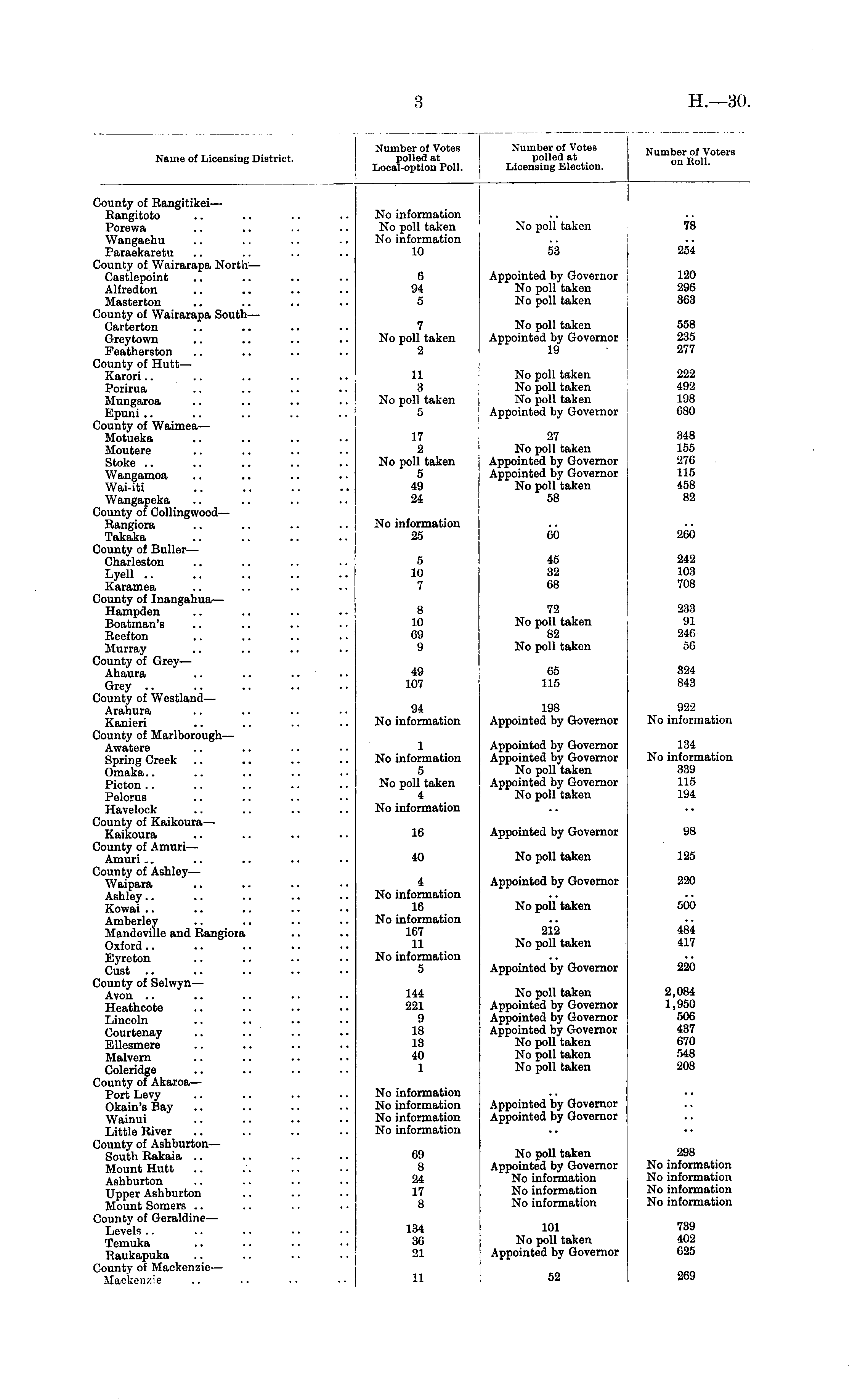 Name of Licensing District. Number of Votes polled at Local-option Poll. Number of Votes polled at Licensing Election. Number of Voters on Eoll. lounty of Rangitikei— Rangitoto Porewa Wangaehu Paraekaretu lounty of Wairarapa Norths— Castlepoint Alfredton Masterton Jounty of Wairarapa South— Carterton Grey town Featherston Jounty of Hutt— Karori Porirua Mungaroa Epuni .. !ounty of Waimea — Motueka Moutere Stoke .. Wangamoa Wai-iti Wangapeka Jounty of Collingwood— Rangiora Takaka Jounty of Buller— Charleston Lyell .. Karamea Jounty of Inangahua— Hampden Boatman's Reefton Murray Jounty of Grey— Ahaura Grey .. Jounty of Westland— Arahura Kanieri Jounty of Marlborough— Awatere Spring Creek Omaka Picton Pelorus Havelook Jounty of Kaikoura—■ Kaikoura Jounty of Amuri — Amuri lounty of Ashley— Waipara Ashley Kowai Amberley Mandeville and Rangiora Oxford Eyreton Cust .. Jounty of Selwyn — Avon Heathcote Lincoln Courtenay Ellesmere Malvern Coleridge lounty of Akaroa— Port Levy Okain's Bay Wainui Little River lounty of Ashburton — South Rakaia Mount Hutt Ashburton Upper Ashburton Mount Somers Jounty of Geraldine— Levels Temuka Raukapuka lounty of Mackenzie — Mackenzie No information No poll taken No information 10 6 94 5 7 No poll taken 2 11 3 No poll taken 5 17 2 No poll taken 5 49 24 No information 25 5 10 7 8 10 69 9 49 107 94 No information 1 No information 5 No poll taken 4 No information No poll taken 53 Appointed by Governor No poll taken No poll taken No poll taken Appointed by Governor 19 No poll taken No poll taken No poll taken Appointed by Governor 27 No poll taken Appointed by Governor Appointed by Governor No poll taken 58 GO 45 32 68 72 No poll taken 82 No poll taken 65 115 198 Appointed by Governor Appointed by Governor Appointed by Governor No poll taken Appointed by Governor No poll taken 78 254 120 296 363 558 235 277 222 492 198 680 348 155 276 115 458 82 260 242 103 708 233 91 246 56 324 843 922 No information 134 No information 339 115 194 16 Appointed by Governor 98 40 No poll taken 125 4 Appointed by Governor 220 No information 16 No information 167 11 No information 5 No poll taken 212 No poll taken 500 484 417 Appointed by Governor 220 144 221 9 18 13 40 1 No poll taken Appointed by Governor Appointed by Governor Appointed by Governor No poll taken No poll taken No poll taken 2,084 1,950 506 437 670 r.48 208 No information No information No information No information Appointed by Governor Appointed by Governor 69 8 24 17 8 No poll taken Appointed by Governor No information No information No information 298 No information No information No information No information 134 36 21 101 No poll taken Appointed by Governor 739 402 625 11 52 269