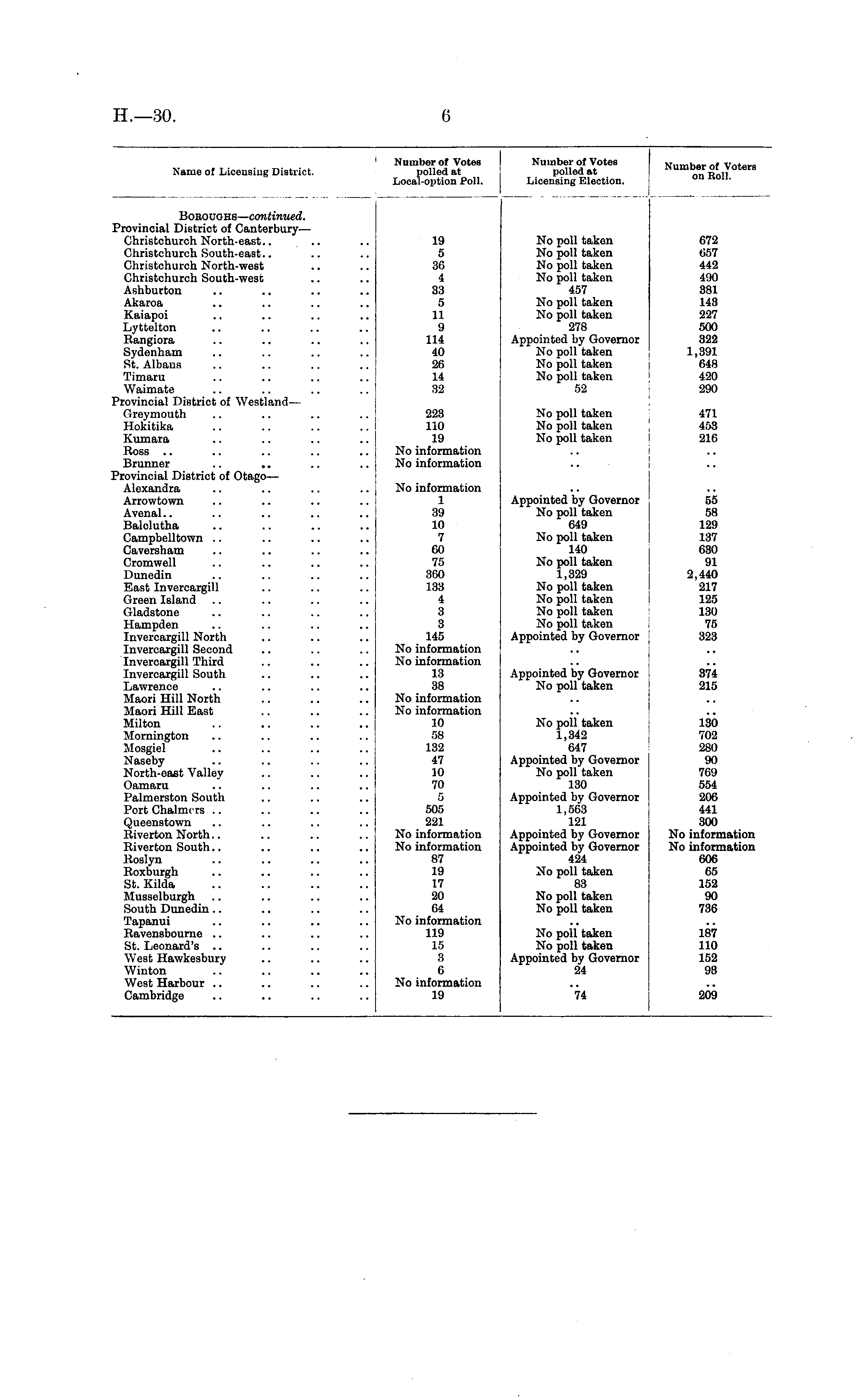 Name of Licensing District. Number of Votes polled at Local-option Poll. Number of Votes polled at Licensing Election. Number of Voters on Boll. Boboughs— continued. 'rovincial District of Canterbury— Christchurch North-east.. Christchurch South-east.. Christchurch North-west Christchurch South-wesc Ashburton Akaroa Kaiapoi Lyttelton Rangiora Sydenham St. Albans Timaru Waimate 'rovincial District of Westland— Greymouth Hokitika Kumara Koss Brunner 'rovincial District of Otago— Alexandra Arrowtown Avenal Balclutha Campbelltown Caversham Cromwell Dunedin East Invercargill Green Island Gladstone Hampden Invercargill North Invercargill Second Invercargill Third Invercargill South Lawrence Maori Hill North Maori Hill East Milton Mornington Mosgiel Naseby North-oast Valley Oamaru Palmerston South Port Chalmers Queenstown Riverton North.. Riverton South Roslyn Roxburgh St. Kilda Musselburgh South Dunedin Tapanui Ravensbourne St. Leonard's West Hawkesbury Winton West Harbour Cambridge 19 5 36 4 33 5 11 9 114 40 26 14 32 223 110 19 No information No information No information 1 39 10 7 60 75 360 133 4 3 3 145 No information No information 13 38 No information No information 10 58 132 47 10 70 5 505 221 No information No information 87 19 17 20 64 No information 119 15 3 6 No information 19 No poll taken No poll taken No poll taken No poll taken 457 No poll taken No poll taken 278 Appointed by Governor No poll taken No poll taken No poll taken 52 No poll taken No poll taken No poll taken Appointed by Governor No poll taken 649 No poll taken 140 No poll taken 1,329 No poll taken No poll taken No poll taken No poll taken Appointed by Governor 672 057 442 490 381 143 227 500 322 1,391 648 420 290 471 453 216 55 58 129 137 630 91 2,440 217 125 130 75 323 Appointed by Governor No poll taken 374 215 No poll taken 1,342 647 Appointed by Governor No poll taken 130 Appointed by Governor 1,563 121 Appointed by Governor Appointed by Governor 424 No poll taken 83 No poll taken No poll taken 130 702 280 90 769 554 206 441 300 No information No information 606 65 152 90 736 No poll taken No poll taken Appointed by Governor 24 187 110 152 98 74 209