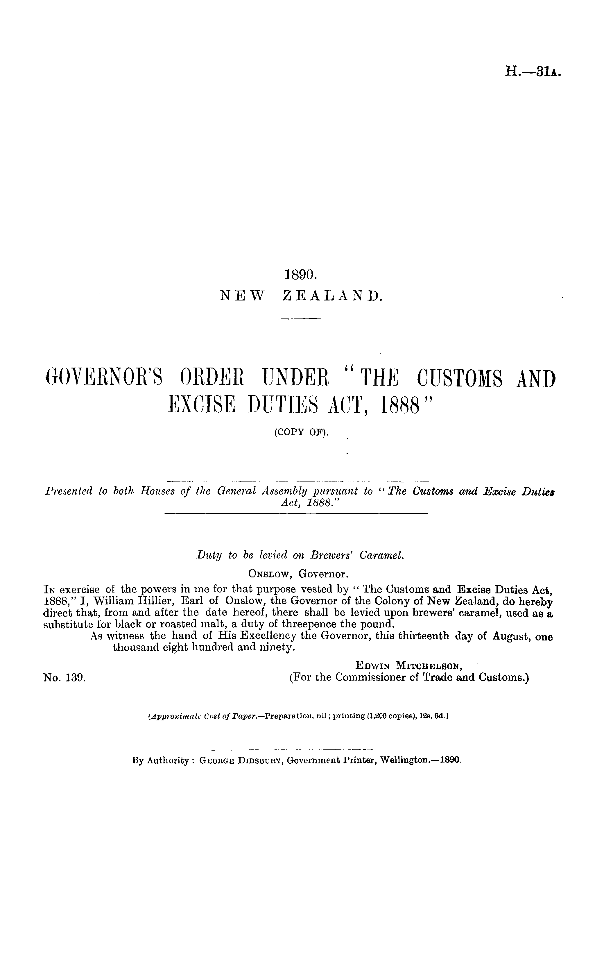 Duty to be levied on Brewers' Caramel. Onslow, Governor. In exercise of the powers in me for that purpose vested by " The Customs and Excise Duties Act, 1888," I, William Hillier, Earl of Onslow, the Governor of the Colony of New Zealand, do hereby direct that, from and after the date hereof, there shall be levied upon brewers' caramel, used as a substitute for black or roasted malt, a duty of threepence the pound. As witness the hand of His Excellency the Governor, this thirteenth day of August, one thousand eight hundred and ninety. Edwin Mitchelson, No. 139. (For the Commissioner of Trade and Customs.) [Approximate Cost of Paper.— Preparation, nil; printing (1,200 copies), 12s. 6d.J