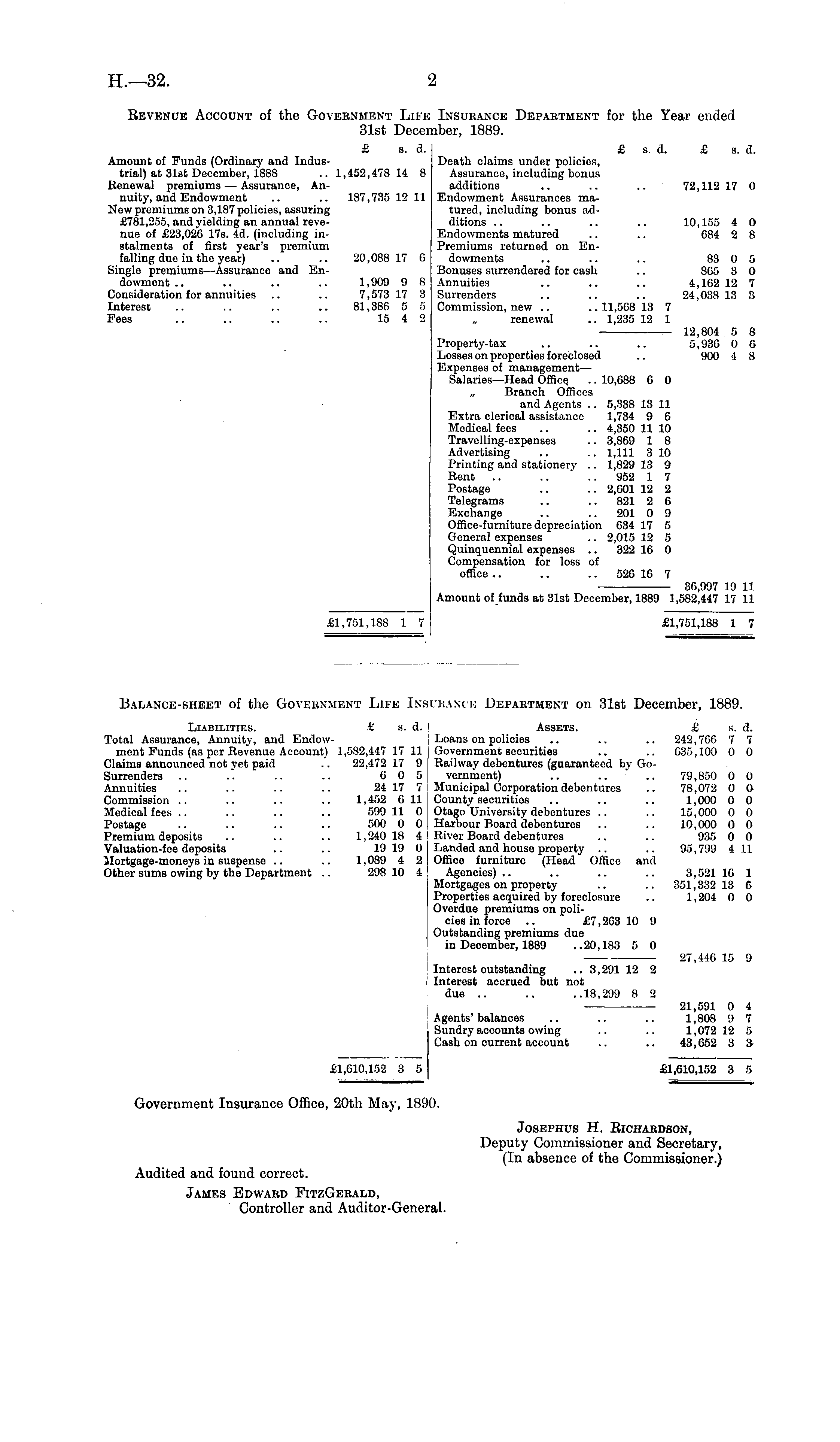 Eevenue Account of the Government Life Insurance Department for the Year ended 31st December, 1889. £ s. a. £ s. a. £ s. a. Amount of Funas (Orainary ana Inaus- Death claims under policies, trial) at 31st December, 1888 .. 1,452,478 14 8 Assurance, incluaing bonus Renewal premiums — Assurance, An- aaaitions .. .. .. 72,112 17 0 nuity, ana Enaowment .. .. 187,735 12 11 Enaowment Assurances maNew premiums on 3,187 policies, assuring turoa, incluaing bonus ad£781,255, and yieiaing an annual reve- aitions .. .. .. .. 10,155 4 0 nue of £23,026 17s. 4a. (incluaing in- Endowments matured .. .. GB4 2 8 stalments of first year's premium Premiums returned on Enfalling due in the year) .. .. 20,088 17 C dowments .. .. .. 83 0 5 Single premiums—Assurance and En- Bonuses surrendered for cash .. 805 3 0 dowmont.. .. .. .. 1,909 9 8 Annuities .. .. .. 4,162 12 7 Consideration for annuities .. .. 7,573 17 3 Surrenders .. .. .. 24,038 13 3 Interest .. .. .. .. 81,386 5 6 Commission, new .. ..11,568 13 7 Fees .. .. .. .. 15 4 2 „ renewal .. 1,235 12 1 12,804 5 8 Property-tax .. .. .. 5,936 0 6 Losses on properties foreclosed .. 900 4 8 Expenses of management— Salaries—Heaa Office .. 10,688 6 0 Branch Offices and Agents .. 5,338 13 11 Extra clerical assistance 1,734 9 6 Medical fees .. .. 4,350 11 10 Travelling-expenses .. 3,869 1 8 Advertising .. .. 1,111 310 Printing and stationery .. 1,829 13 9 Rent .. .. .. 952 1 7 Postage .. .. 2,601 12 2 Telegrams .. .. 821 2 6 Exchange .. .. 201 0 9 Office-furniture depreciation 634 17 5 General expenses .. 2,015 12 5 Quinquennial expenses .. 322 16 0 Compensation for loss of office .. .. .. 526 16 7 36,997 19 II Amount of funds at 31st December, 1889 1,582,447 17 11 £1,751,188 1 7 £1,751,188 1 7