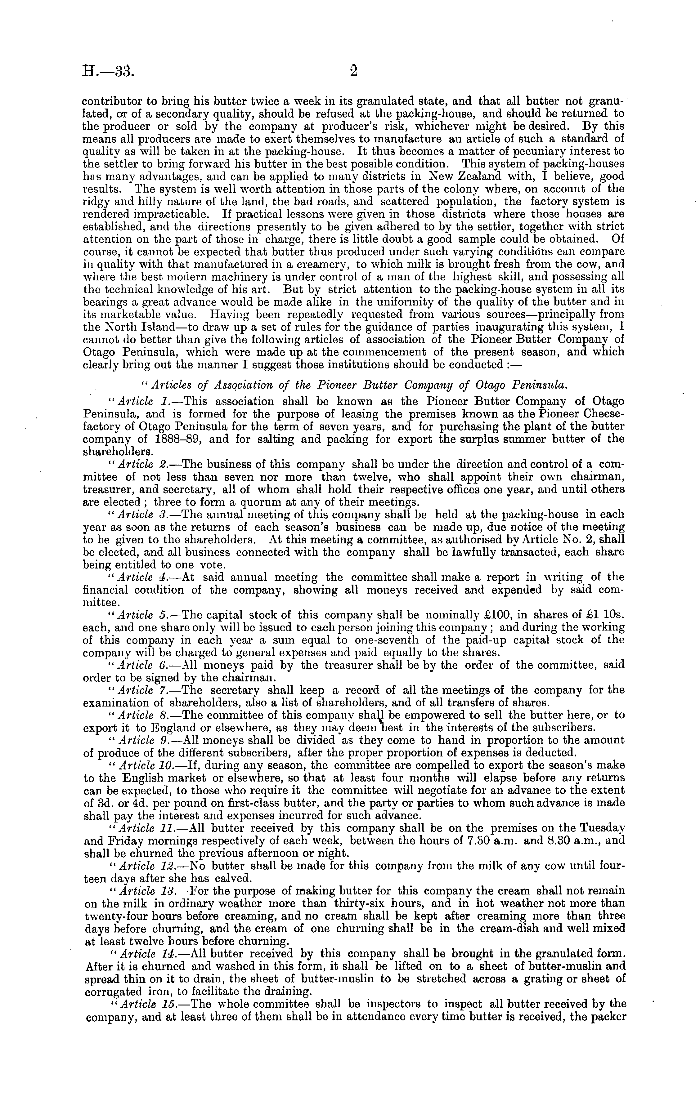 contributor to bring his butter twice a week in its granulated state, and that all butter not granulated, or of a secondary quality, should be refused at the packing-house, and should be returned to the producer or sold by the company at producer's risk, whichever might be desired. By this means all producers are made to exert themselves to manufacture an article of such a standard of quality as will be taken in at the packing-house. It thus becomes a matter of pecuniary interest to the settler to bring forward his butter in the best possible condition. This system of packing-houses has many advantages, and can be applied to many districts in New Zealand with, I believe, good results. The system is well worth attention in those parts of the colony where, on account of the ridgy and hilly nature of the land, the bad roads, and scattered population, the factory system is rendered impracticable. If practical lessons were given in those districts where those houses are established, and the directions presently to be given adhered to by the settler, together with strict attention on the part of those in charge, there is little doubt a good sample could be obtained. Of course, it cannot be expected that butter thus produced under such varying conditions can compare in quality with that manufactured in a creamery, to which milk is brought fresh from the cow, and where the best modern machinery is under control of a man of the highest skill, and possessing all the technical knowledge of his art. But by strict attention to the packing-house system in all its bearings a great advance would be made alike in the uniformity of the quality of the butter and in its marketable value. Having been repeatedly requested from various sources—principally from the North Island—to draw up a set of rules for the guidance of parties inaugurating this system, I cannot do better than give the following articles of association of the Pioneer Butter Company of Otago Peninsula, which were made up at the commencement of the present season, and which clearly bring out the manner I suggest those institutions should be conducted : — " Articles of Assqciation of the Pioneer Butter Company of Otago Peninsula. "Article I. —This association shall be known as the Pioneer Butter Company of Otago Peninsula, and is formed for the purpose of leasing the premises known as the Pioneer Cheesefactory of Otago Peninsula for the term of seven years, and for purchasing the plant of the butter company of 1888-89, and for salting and packing for export the surplus summer butter of the shareholders. "Article 2.— The business of this company shall be under the direction and control of a committee of not less than seven nor more than twelve, who shall appoint their own chairman, treasurer, and secretary, all of whom shall hold their respective offices one year, and until others are elected ; three to form a quorum at any of their meetings. "Article 3. —The annual meeting of this company shall be held at the packing-house in each year as soon as the returns of each season's business can be made up, due notice of the meeting to be given to the shareholders. At this meeting a committee, as authorised by Article No. 2, shall be elected, and all business connected with the company shall be lawfully transacted, each share being entitled to one vote. "Article 4. —At said annual meeting the committee shall make a report in writing of the financial condition of the company, showing all moneys received and expended by said committee. "Article 5. —The capital stock of this company shall be nominally £100, in shares of £1 10s. each, and one share only will be issued to each person joining this company ; and during the working of this company in each year a sum equal to one-seventh of the paid-up capital stock of the company will be charged to general expenses and paid equally to the shares. " Article 6. —All moneys paid by the treasurer shall be by the order of the committee, said order to be signed by the chairman. "Article 7. —The secretary shall keep a record of all the meetings of the company for the examination of shareholders, also a list of shareholders, and of all transfers of shares. "Article B. —The committee of this company shall be empowered to sell the butter here, or to export it to England or elsewhere, as they may deem "best in the interests of the subscribers. " Article 9. —All moneys shall be divided as they come to hand in proportion to the amount of produce of the different subscribers, after the proper proportion of expenses is deducted. " Article 10. —If, during any season, the committee are compelled to export the season's make to the English market or elsewhere, so that at least four months will elapse before any returns can be expected, to those who require it the committee will negotiate for an advance to the extent of 3d. or id. per pound on first-class butter, and the party or parties to whom such advance is made shall pay the interest and expenses incurred for such advance. "Article 11. —All butter received by this company shall be on the premises on the Tuesday and Friday mornings respectively of each week, between the hours of 7.50 a.m. and 8.30 a.m., and shall be churned the previous afternoon or night. "Article 12. —No butter shall be made for this company from the milk of any cow until fourteen days after she has calved. "Article 18. —For the purpose of making butter for this company the cream shall not remain on the milk in ordinary weather more than thirty-six hours, and in hot weather not more than twenty-four hours before creaming, and no cream shall be kept after creaming more than three days before churning, and the cream of one churning shall be in the cream-dish and well mixed at least twelve hours before churning. "Article 14. —A1l butter received by this company shall be brought in the granulated form. After it is churned and washed in this form, it shall be lifted on to a sh