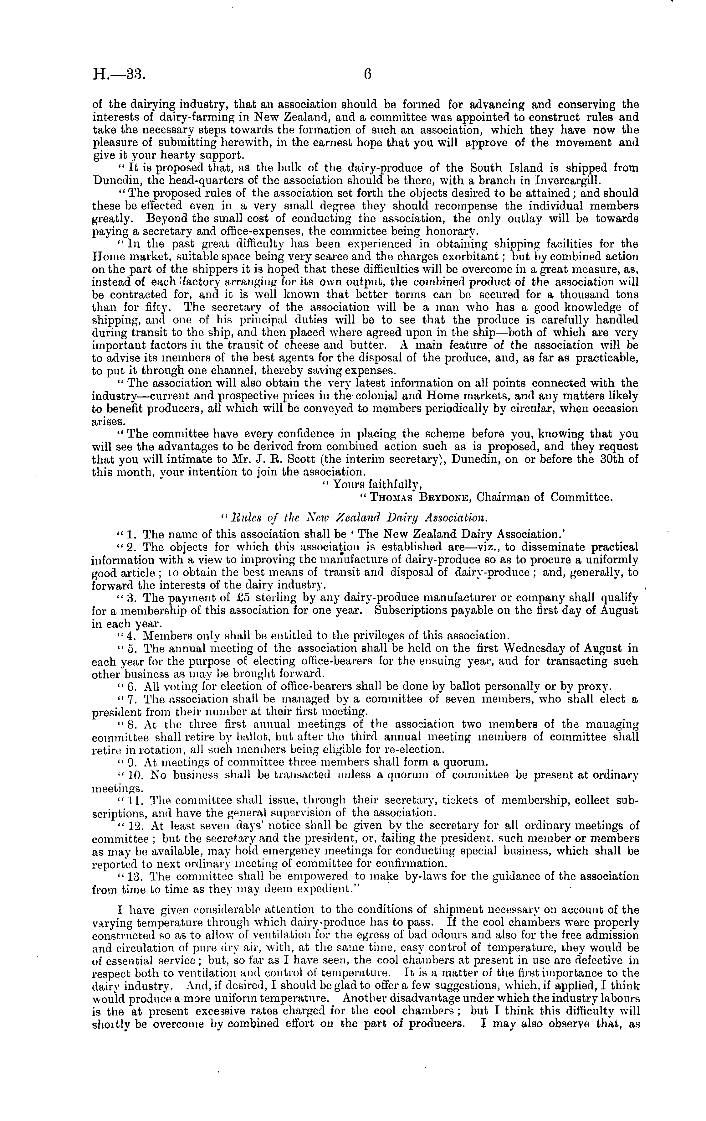 of the dairying industry, that an association should be formed for advancing and conserving the interests of dairy-farming in New Zealand, and a committee was appointed to construct rules and take the necessary steps towards the formation of such an association, which they have now the pleasure of submitting herewith, in the earnest hope that you will approve of the movement and give it your hearty support. " It is proposed that, as the bulk of the dairy-produce of the South Island is shipped from Dunedin, the head-quarters of the association should be there, with a branch in Invercargill. " The proposed rules of the association set forth the objects desired to be attained ; and should these be effected even in a very small degree, they should recompense the individual members greatly. Beyond the small cost of conducting the association, the only outlay will be towards paying a secretary and office-expenses, the committee being honorary. " In the past great difficulty has been experienced in obtaining shipping facilities for the Home market, suitable space being very scarce and the charges exorbitant; but by combined action on the part of the shippers it is hoped that these difficulties will be overcome in a great measure, as, instead of each [factory arranging for its own output, the combined product of the association will be contracted for, and it is well known that better terms can be secured for a thousand tons than for fifty. The secretary of the association will be a man wdio lias a good knowledge of shipping, and one of his principal duties will be to see that the produce is carefully handled during transit to the ship, and then placed where agreed upon in the ship—both of which are very important factors in the transit of cheese and butter. A main feature of the association will be to advise its members of the best agents for the disposal of the produce, and, as far as practicable, to put it through one channel, thereby saving expenses. " The association wall also obtain the very latest information on all points connected with the industry —current and prospective! prices in the colonial and Home markets, and any matters likely to benefit producers, all which will be conveyed to members periodically by circular, when occasion arises. " The committee have every confidence in placing the scheme before you, knowing that you will see the advantages to be derived from combined action such as is proposed, and they request that you will intimate to Mr. J. B. Scott (the interim secretary), Dunedin, on or before the 30th of this month, your intention to join the association. " Yours faithfully, " Thomas Brydone, Chairman of Committee. " Rules of the New Zealand Dairy Association. " 1. The name of this association shall be ' The New Zealand Dairy Association.' " 2. The objects for which this association is established are—viz., to disseminate practical information with a view to improving the manufacture of dairy-produce so as to procure a uniformly good article ; to obtain the best means of transit and disposal of dairy-produce; and, generally, to forward the interests of the dairy industry. " 3. The payment of £5 sterling by any dairy-produce manufacturer or company shall qualify for a membership of this association for one year. Subscriptions payable on the first day of August in each year. "4. Members only shall be entitled to the privileges of this association. " 5. The annual meeting of the association shall be held on the first Wednesday of August in each year for the purpose of electing office-bearers for the ensuing year, and for transacting such other business as may be brought forward. " 6. All voting for election of office-bearers shall be done by ballot personally or by proxy. " 7. The association shall be managed by a committee of seven members, who shall elect a president from their number at their first meeting. "8. At the three first annual meetings of the association two members of the managing committee shall retire by ballot, but alter I lie third annual meeting members of committee shall retire in rotation, all such members being eligible for re-election. " 9. At meetings of committee three members shall form a quorum. " 10. No business shall be transacted unless a quorum of committee be present at ordinary meetings. " 11. The committee shall issue, through their secretary, tickets of membership, collect subscriptions, and have the general supervision of the association. " 12. At least seven days' notice shall be given by the secretary for all ordinary meetings of committee ; but the secretary and the president, or, failing the president, such member or members as may be available, may hold emergency meetings for conducting special business, which shall be reported to next ordinary meeting of committee for confirmation. " 13. The committee shall be empowered to make by-laws for the guidance of the association from time to time as they ma\ deem expedient." I have given considerable attention to the conditions of shipment necessary on account of the varying temperature through which dairy-produce has to pass. If the cool chambers were properly constructed so as to allow of ventilation for the egress of bad odours and also for the free admission and circulation of pure dry air, with, at the same time, easy control of temperature, they would be of essential service; but, so far as I have seen, the cool chambers at present in use are defective in respect both to ventilation and control of temperature;. It is a matter of the first importance to the dairy industry. And, if desired, I should be glad to offer a few suggestions, which, if applied, I think would produce a more uniform temperature. Another disadvantage under which the industry labours is the at present excessive rates charged for the cool chambers ; but I think this difficulty will shortly be overcome by combined effort on the part of producers. I may also observe that, as
