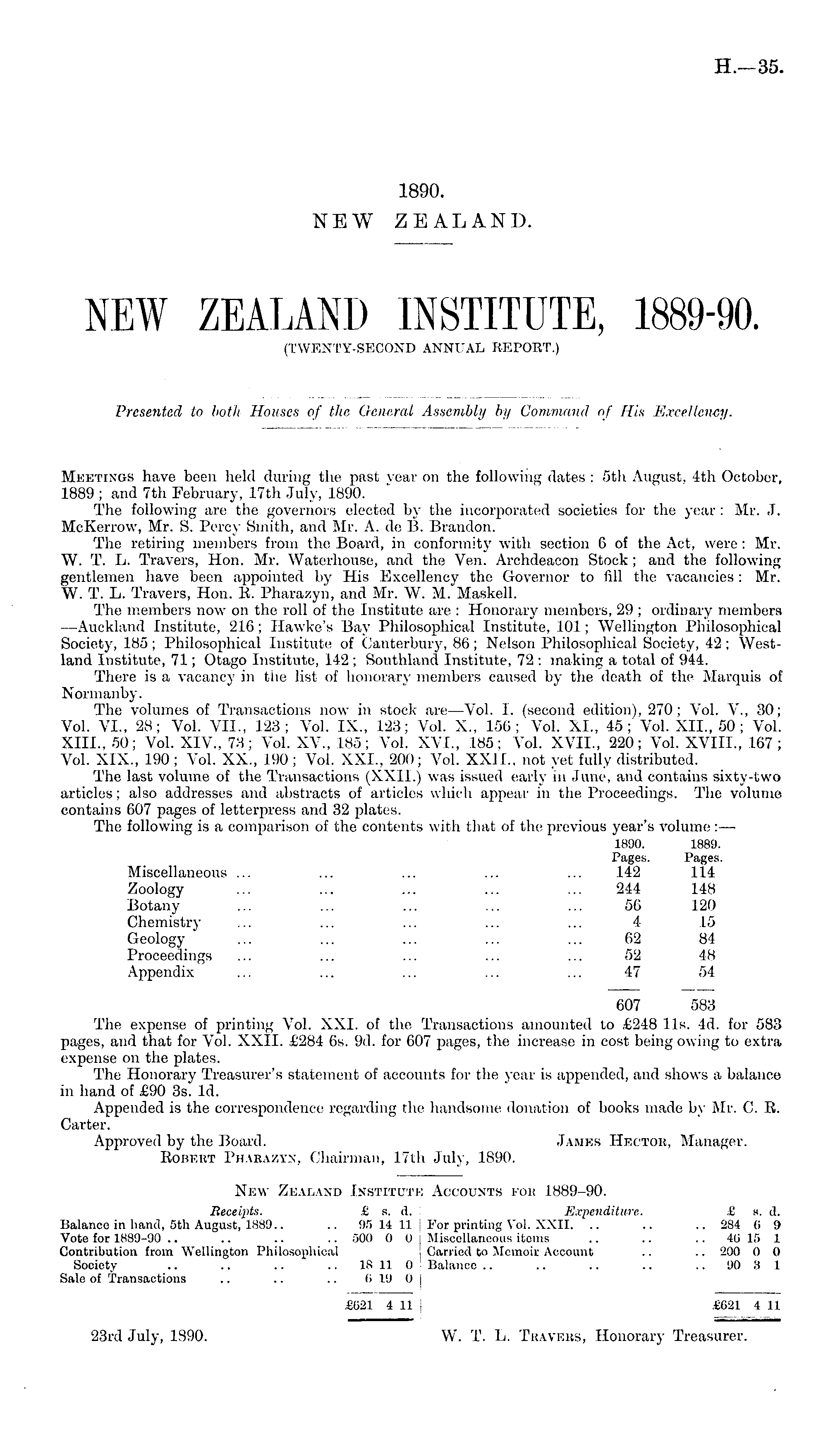 NEW ZEALAND INSTITUTE, 1889-90. (TWENTY-SECOND ANNUAL REPORT.)